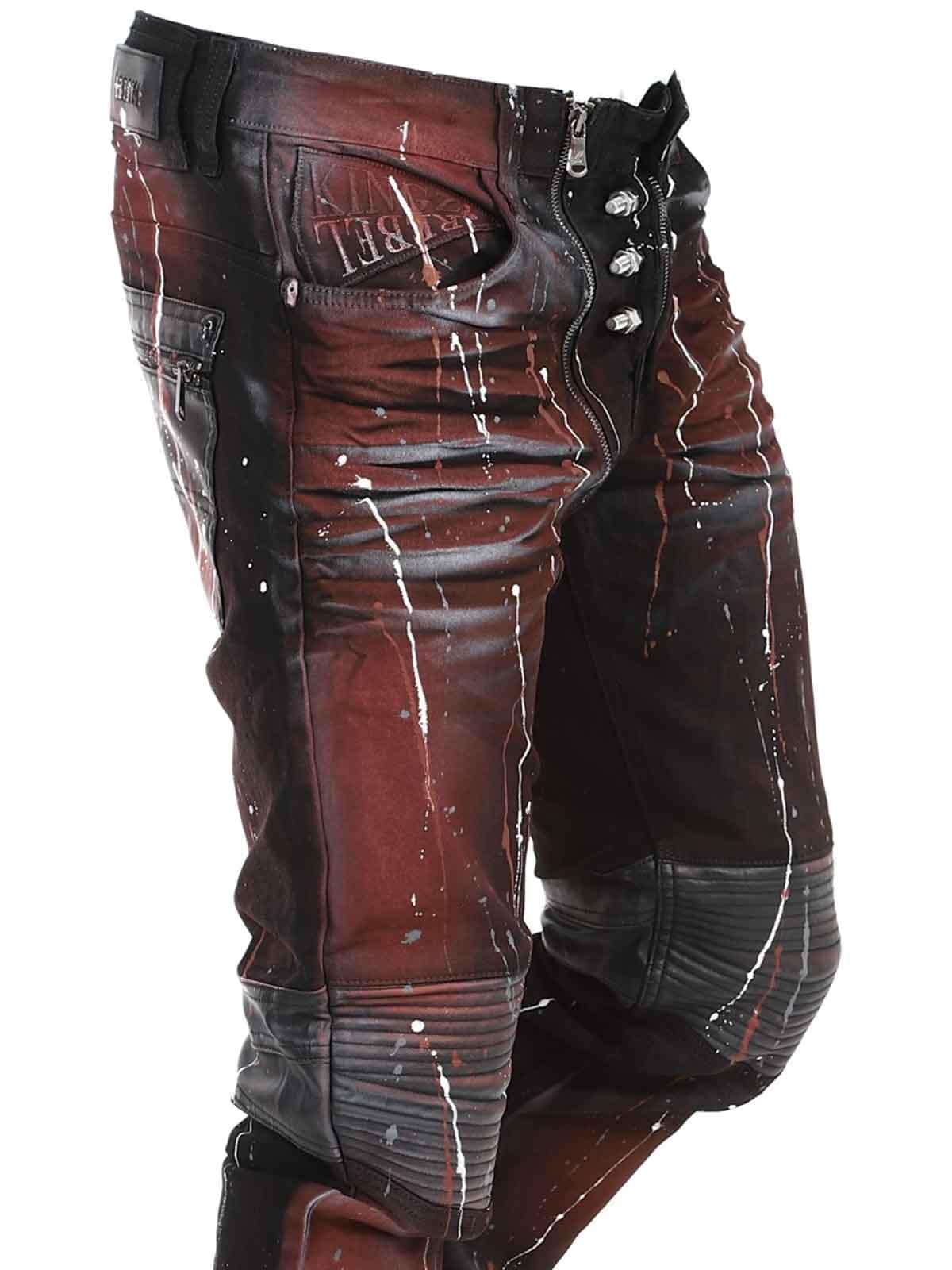 Uniikit, värjätystä farkkukankaasta valmistetut housut, joissa on polvien ja taskujen kohdalla mustaa keinonahkaa. Kapea malli. Hopeanväriset pultit sepaluksessa ja takataskuissa, jotka ovat suljettavissa hopeanvärisillä vetoketjuilla. Farkut suljetaan erillisellä vetoketjulla, joka sijaitsee vyötäröllä olevan napin oikealla puolella.
