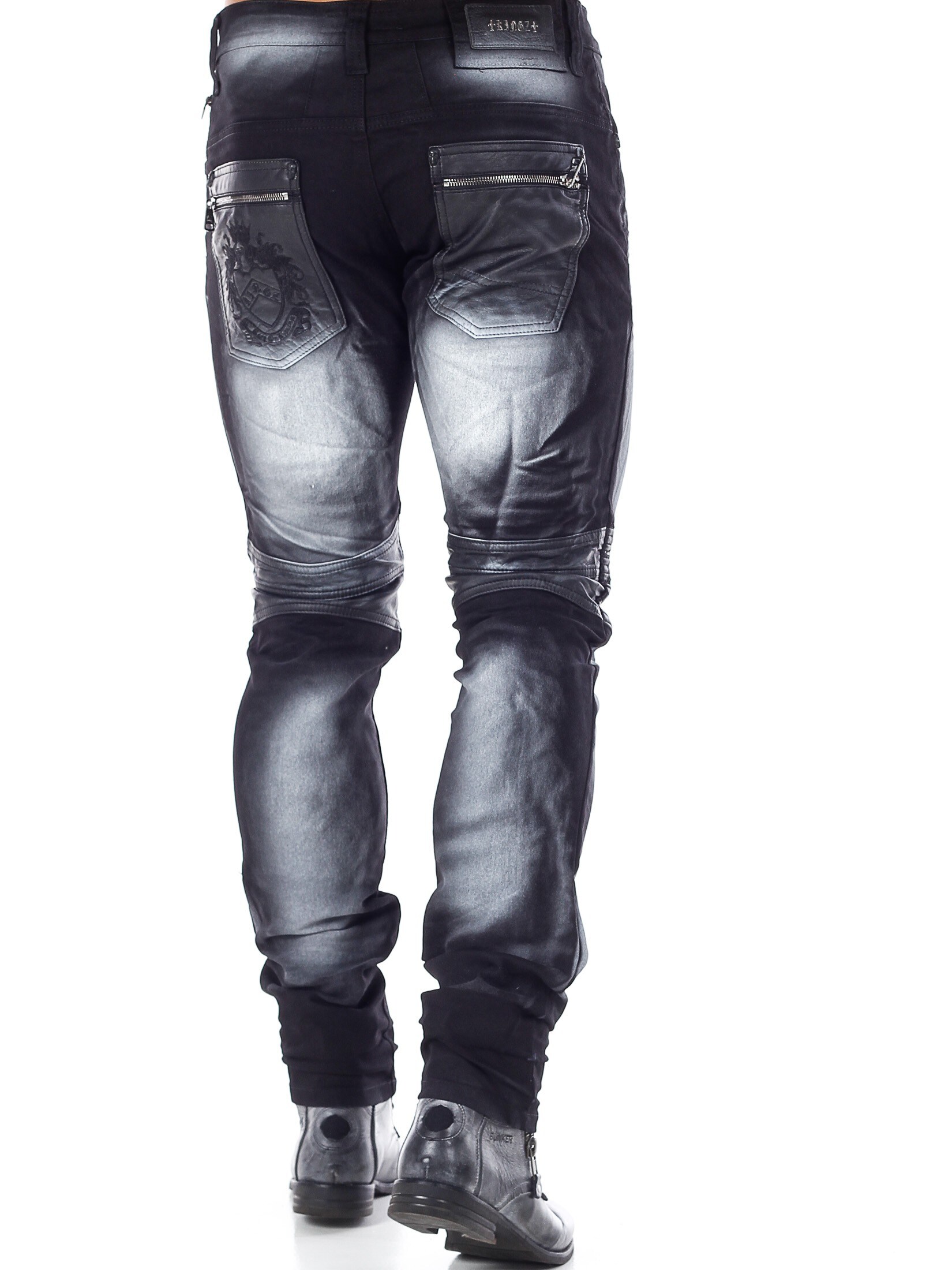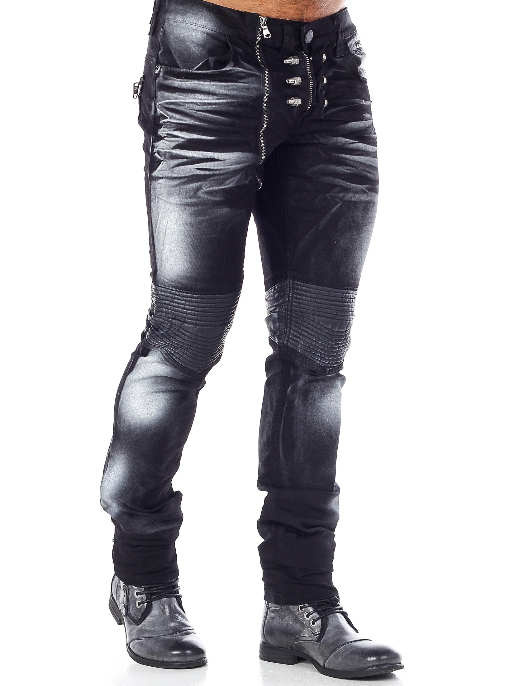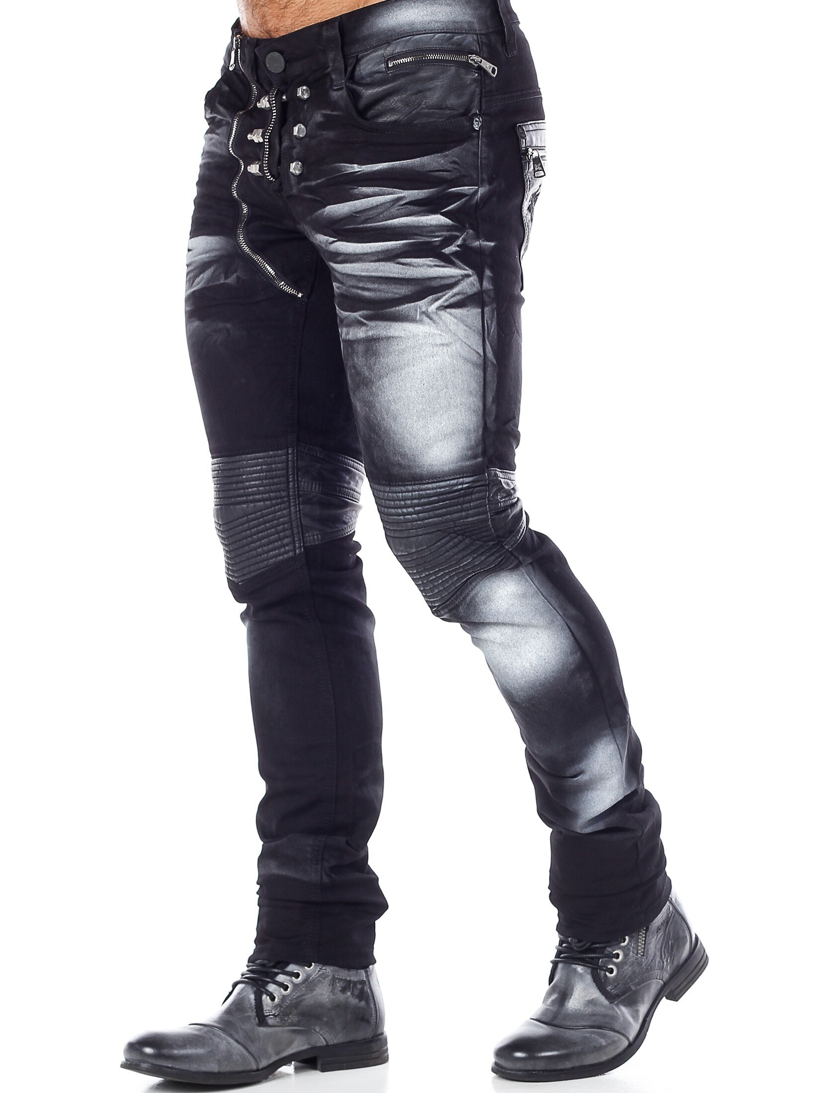 Uniikit mustat farkut merkiltä Kingz. Housuissa on musta pohjaväri sekä valkoisia yksityiskohtia. Sepaluksessa on kolme suurta metalliosaa, jotka voi irrottaa. Housut avataan vetoketjulla, joka sijaitsee sepaluksen oikealla puolella. Polvien ja takataskujen yksityiskohdat tuovat housuille maskuliinista ilmettä. Nämä farkut ovat Limited Edition -mallistoa, joka tarkoittaa sitä, että saamme niitä vain rajoitetun määrän.