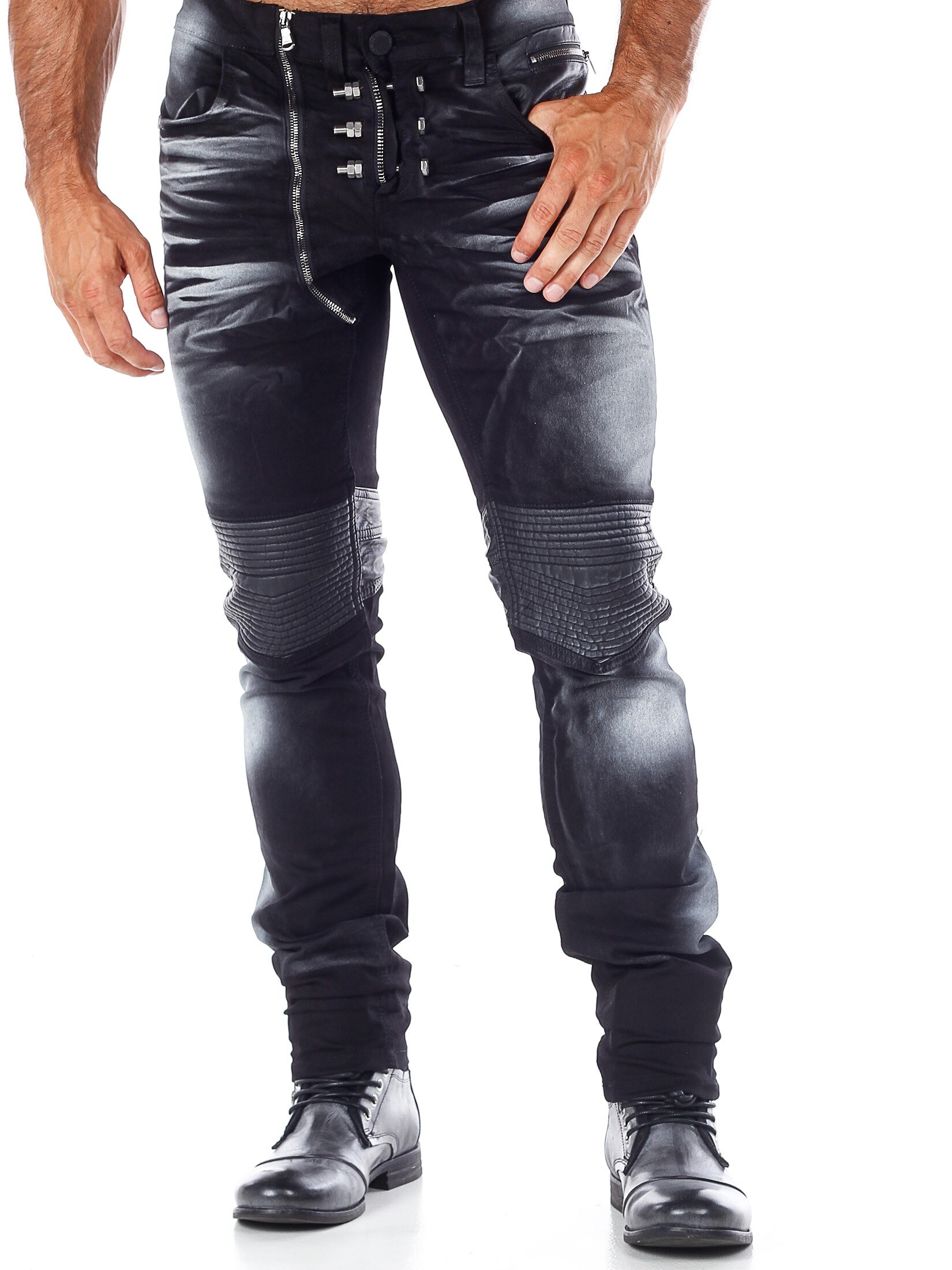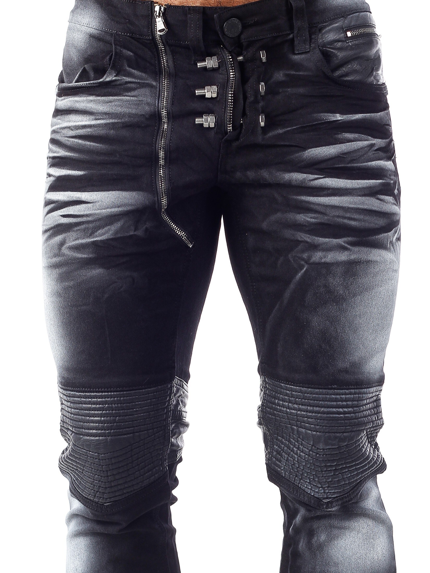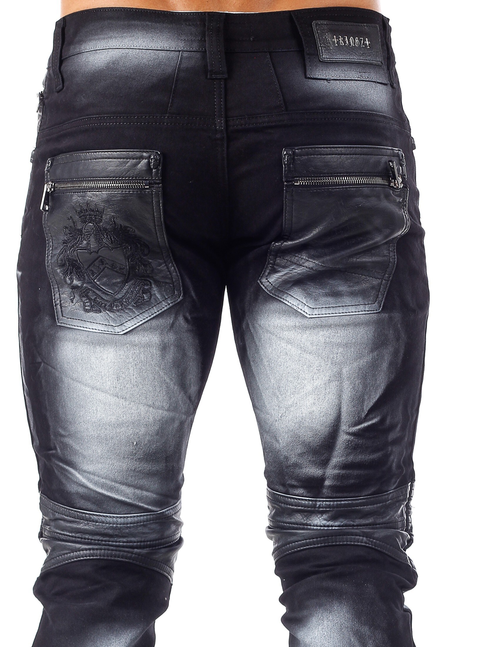 Uniikit mustat farkut merkiltä Kingz. Housuissa on musta pohjaväri sekä valkoisia yksityiskohtia. Sepaluksessa on kolme suurta metalliosaa, jotka voi irrottaa. Housut avataan vetoketjulla, joka sijaitsee sepaluksen oikealla puolella. Polvien ja takataskujen yksityiskohdat tuovat housuille maskuliinista ilmettä. Nämä farkut ovat Limited Edition -mallistoa, joka tarkoittaa sitä, että saamme niitä vain rajoitetun määrän.