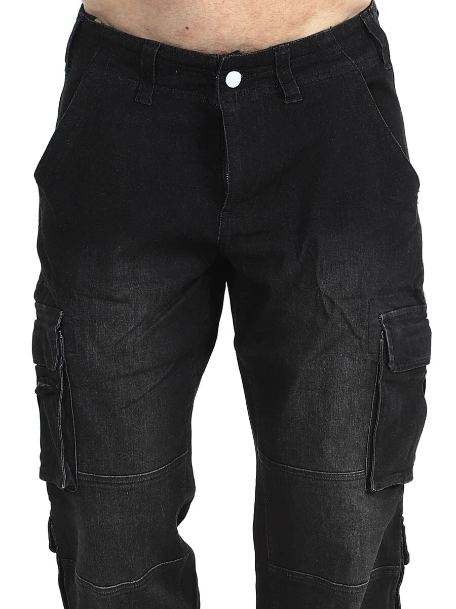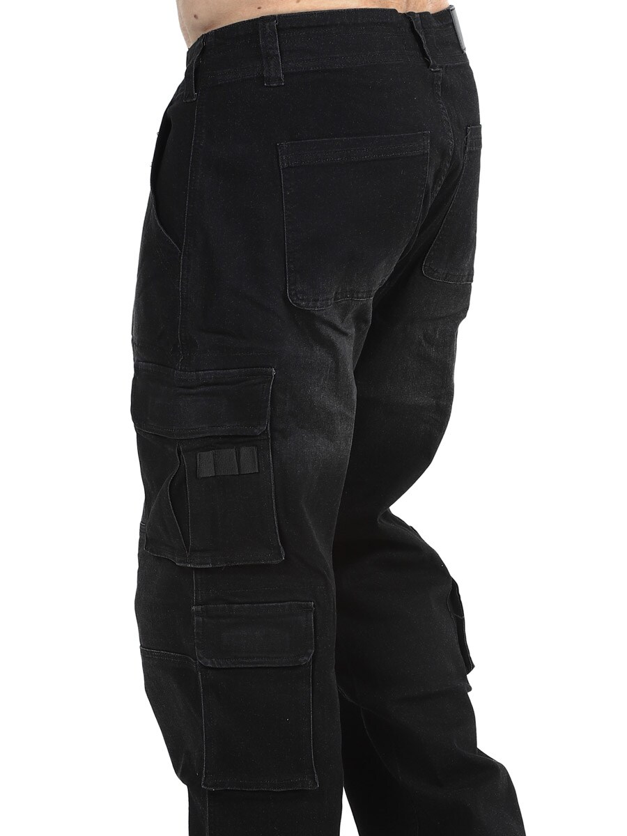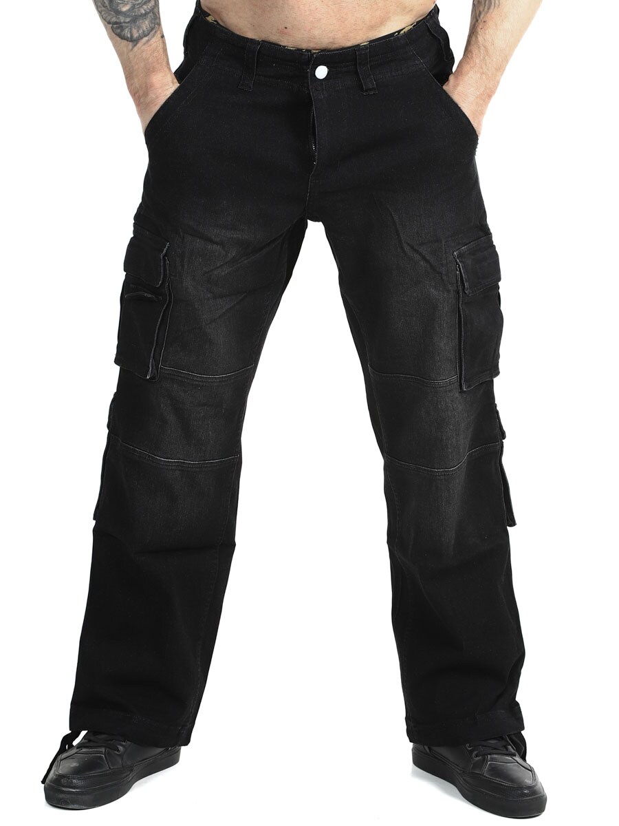Kestävät denimiset cargo-farkut rennolla ja toiminnallisella muotoilulla. Housuissa on runsaasti säilytystilaa useiden käytännöllisten taskujen ansiosta, mukaan lukien takataskut ja tilavat reisitaskut. Mukava istuvuus yhdistyy lahkeensuiden säädettäviin kiristysnyöreihin, joiden avulla tyyliä on helppo muokata. Kestävä vaate arkeen ja streetwear-tyyliin.