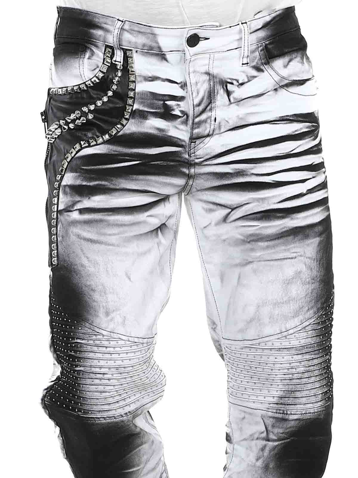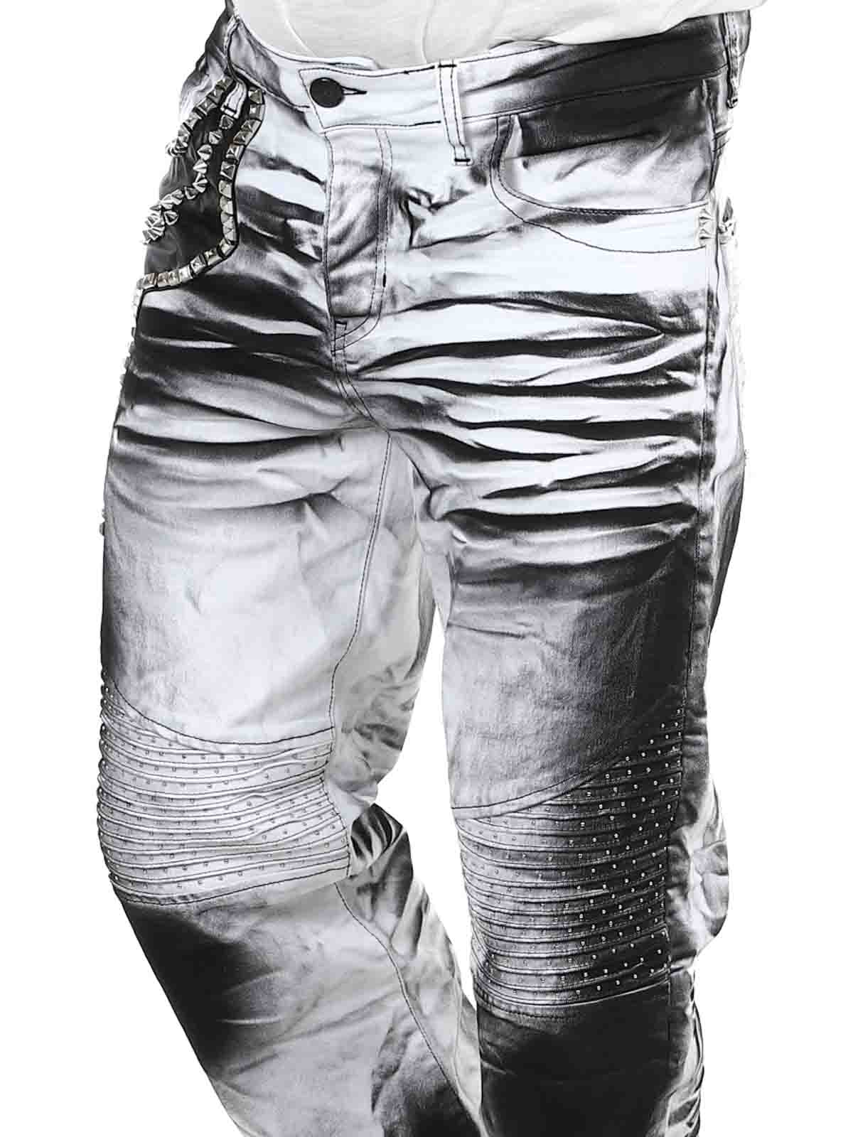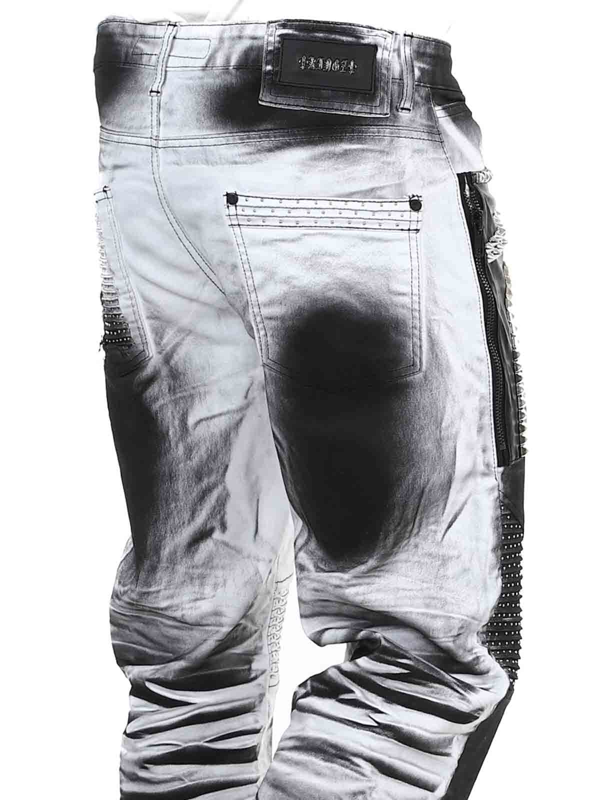 Mukavasta denimistä valmistetut farkut näyttävällä suunnittelulla. Farkuissa on maalitehosteita, niittejä, keinonahkaa ja vetoketju reidessä. Niissä on kaksi etutaskua, kaksi takataskua ja napit lahkeensuissa.