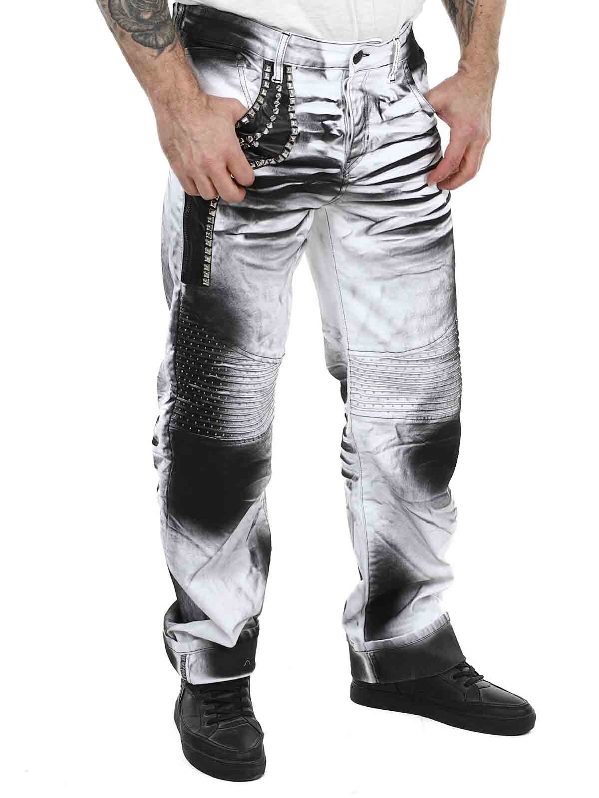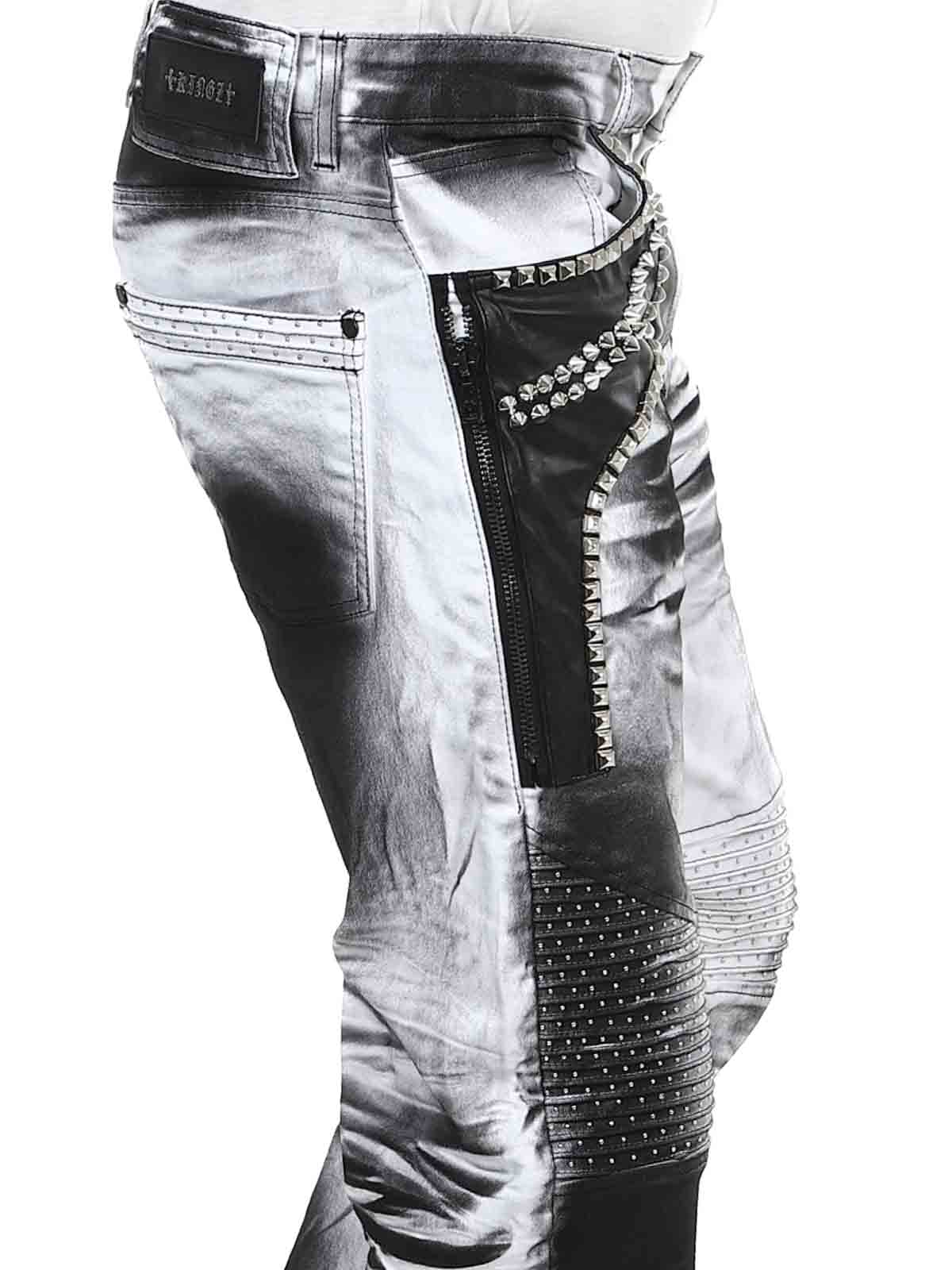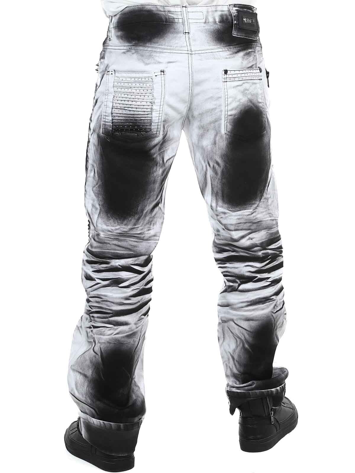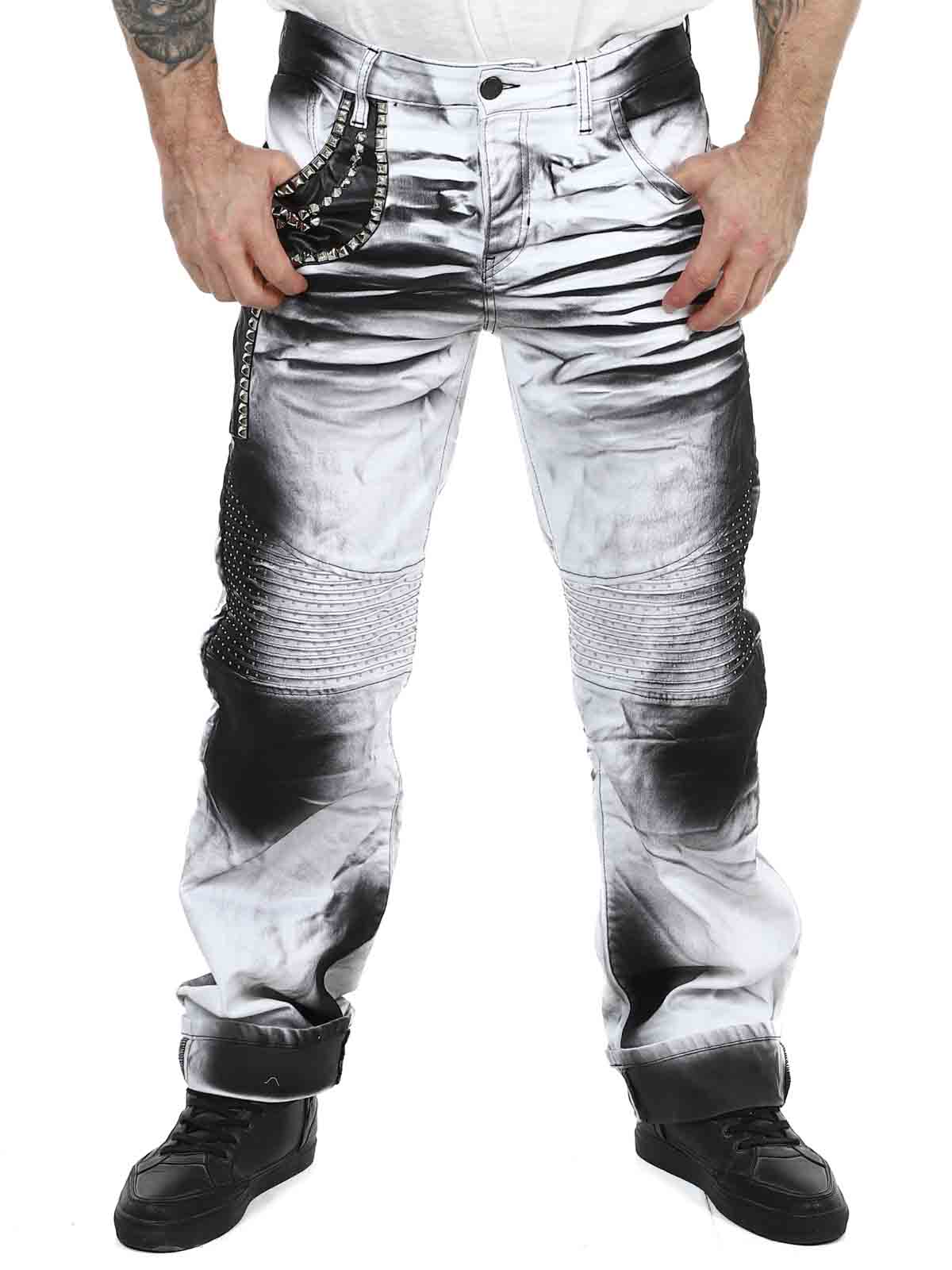 Mukavasta denimistä valmistetut farkut näyttävällä suunnittelulla. Farkuissa on maalitehosteita, niittejä, keinonahkaa ja vetoketju reidessä. Niissä on kaksi etutaskua, kaksi takataskua ja napit lahkeensuissa.