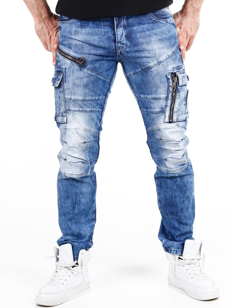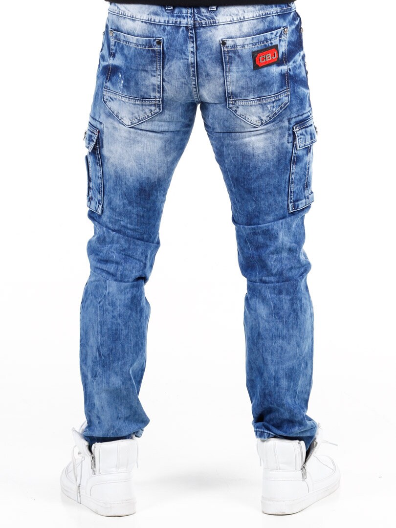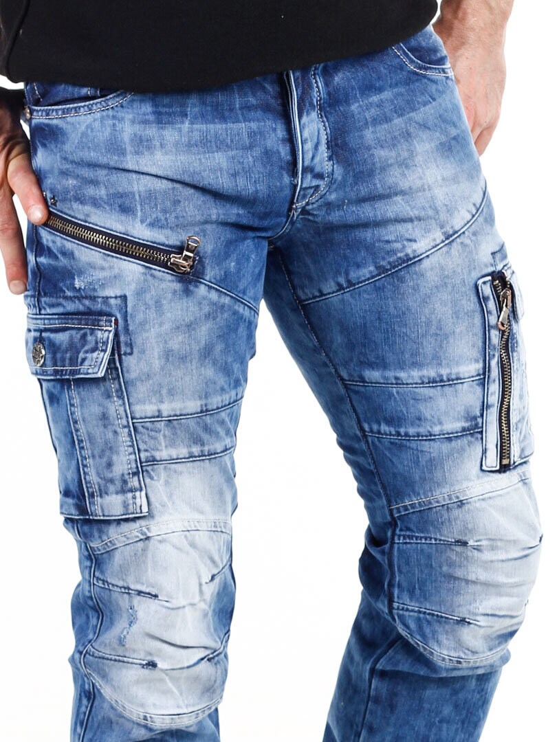 Keskisiniset farkut, joissa on kulutuksia, metalliniittejä, rouhea vetoketju ja mustat keinonahkaiset logomerkit. Valmistettu 100 % puuvillasta. Tilavat takataskut, kolme etutaskua ja kaksi reisitaskua.