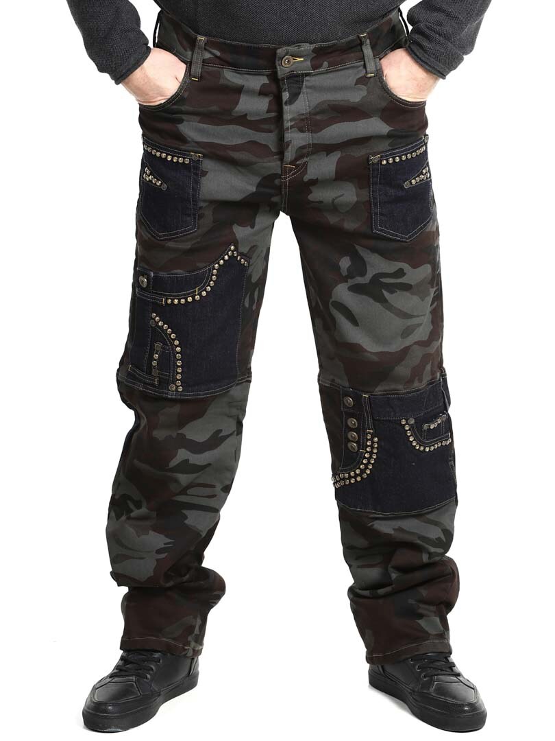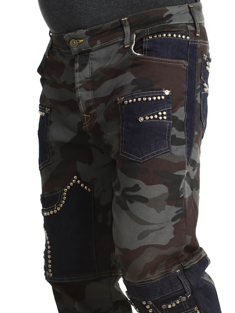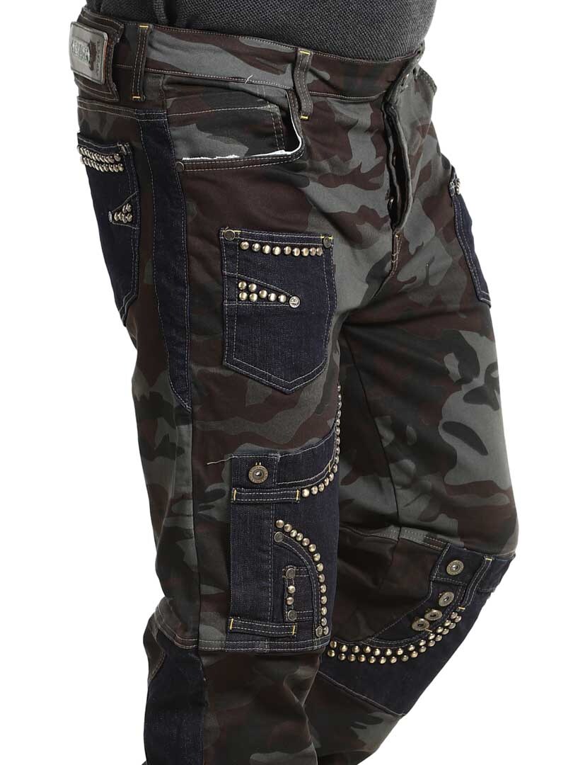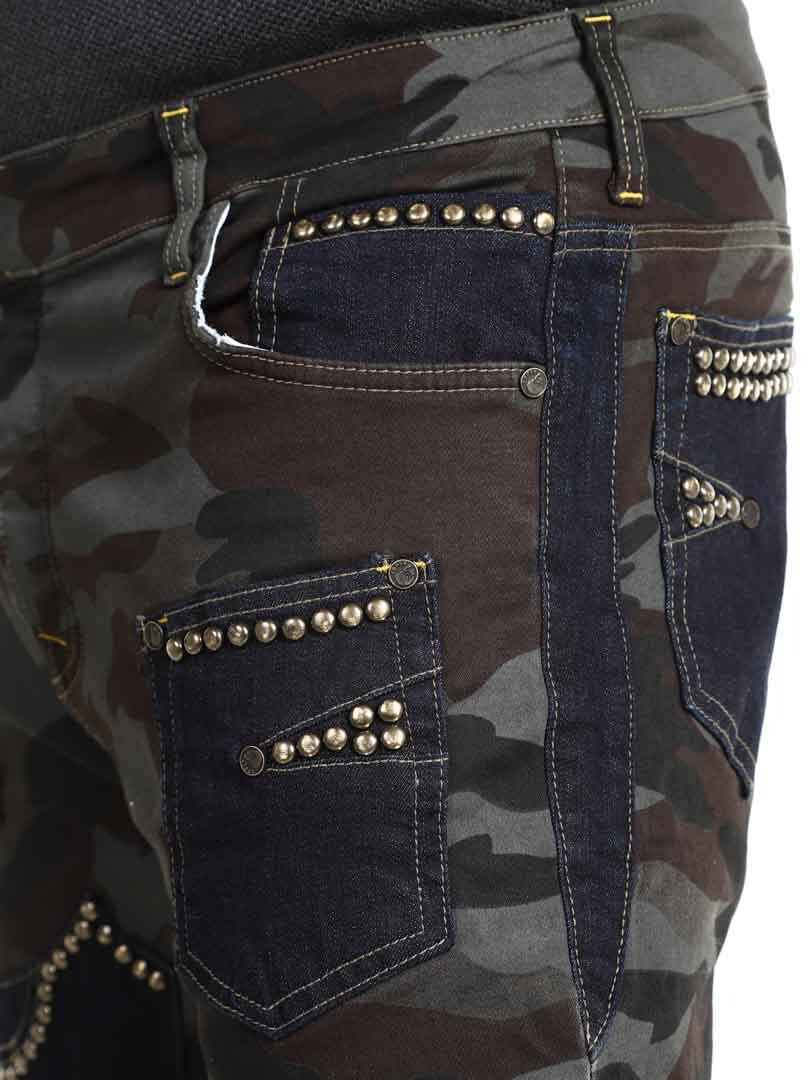 Näissä housuissa yhdistyvät armeijakuosi, kontrastiväriset farkkuosiot ja koristeelliset niitit, jotka luovat raa'an ja huomiota herättävän ilmeen. Housuissa on useita toiminnallisia ja tyylikkäitä taskuja. Joustava malli tarjoaa mukavuutta ja liikkumisen vapautta, ja housut sopivatkin täydellisesti niille, jotka haluavat erottua roisimmalla lookilla!
