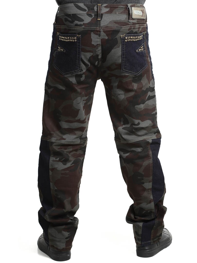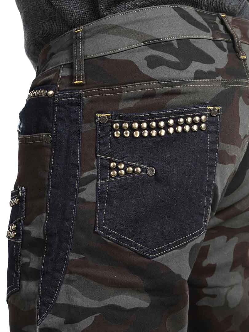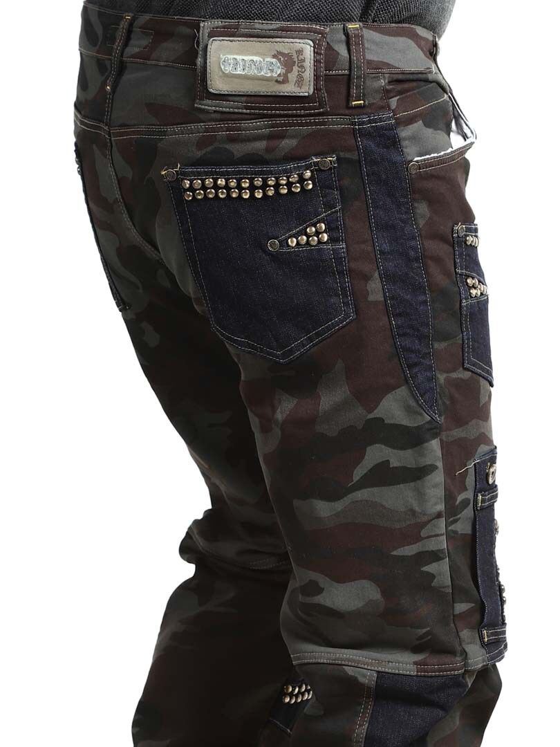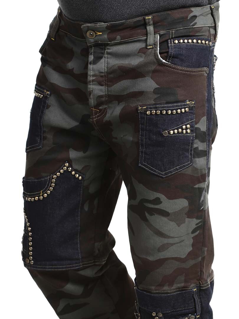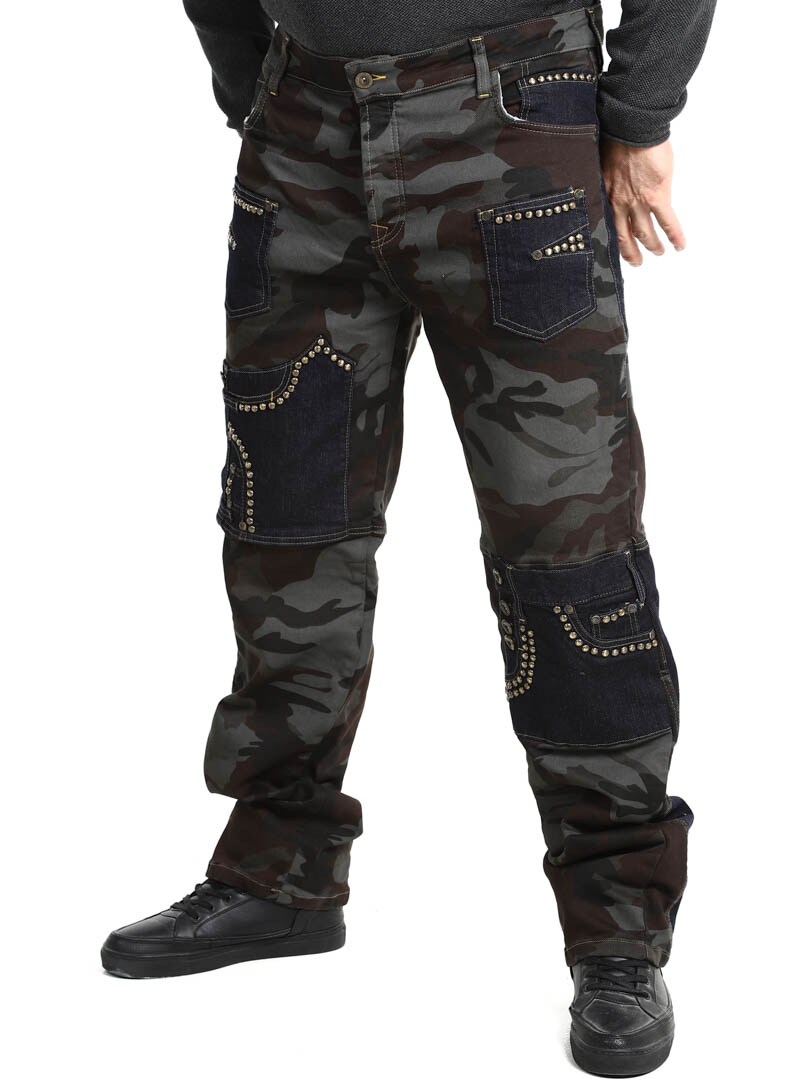 Näissä housuissa yhdistyvät armeijakuosi, kontrastiväriset farkkuosiot ja koristeelliset niitit, jotka luovat raa'an ja huomiota herättävän ilmeen. Housuissa on useita toiminnallisia ja tyylikkäitä taskuja. Joustava malli tarjoaa mukavuutta ja liikkumisen vapautta, ja housut sopivatkin täydellisesti niille, jotka haluavat erottua roisimmalla lookilla!