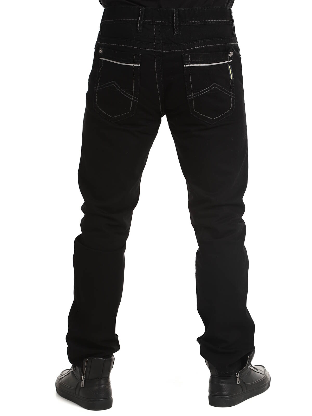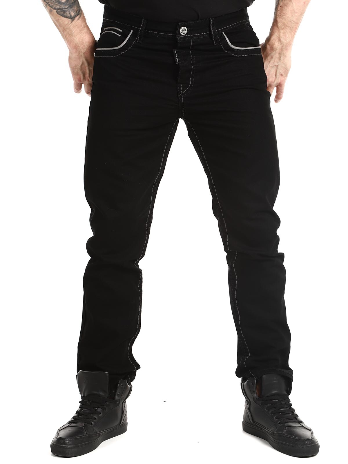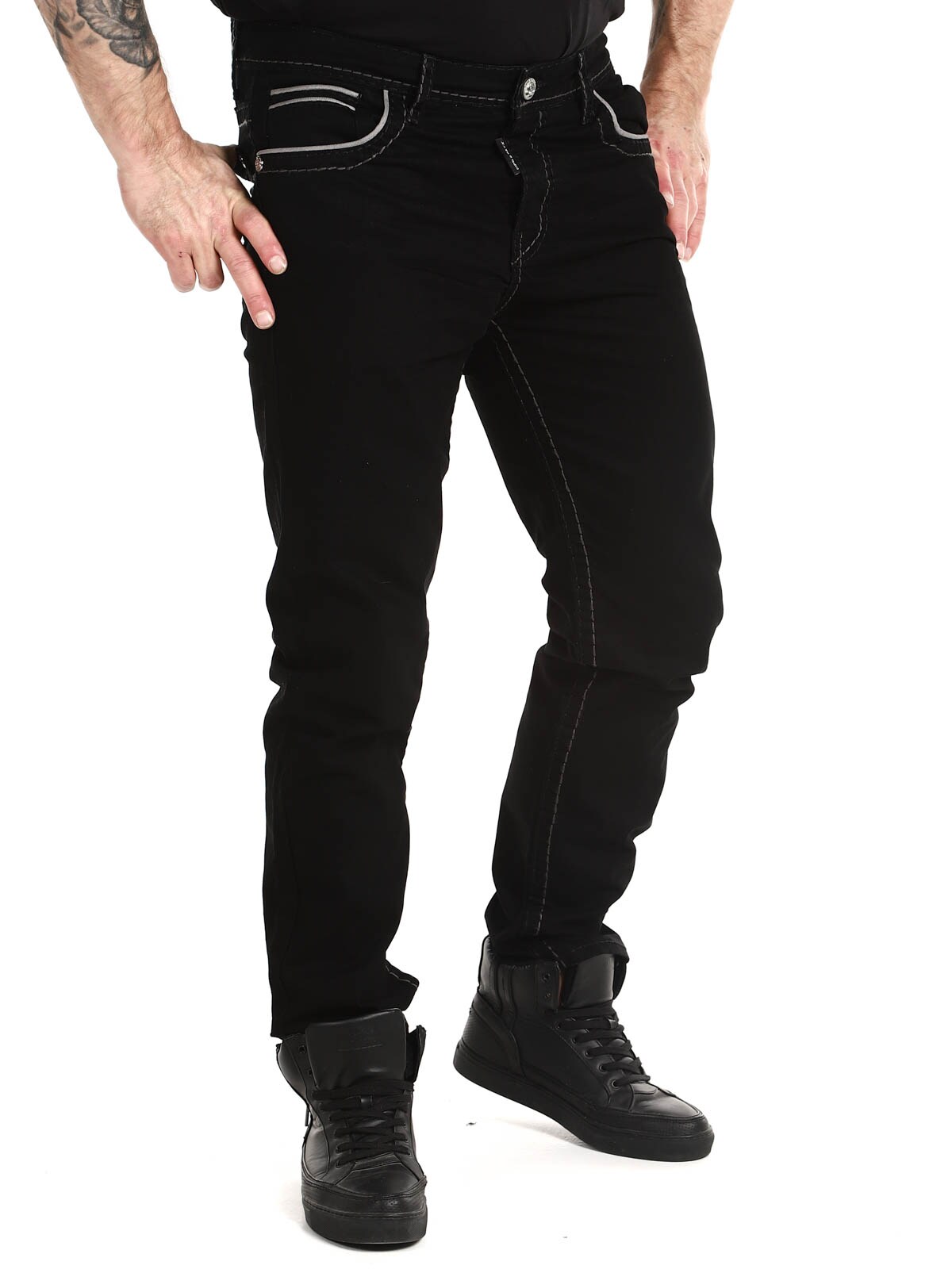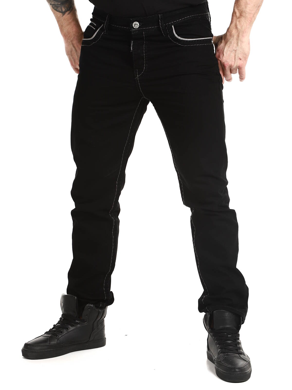 Klassisen malliset mustat farkut, joissa on rouheat saumat kontrastiväreissä. Neljä etutaskua ja kaksi takataskua. Tyylikkäät housut, jotka sopivat useimmille!