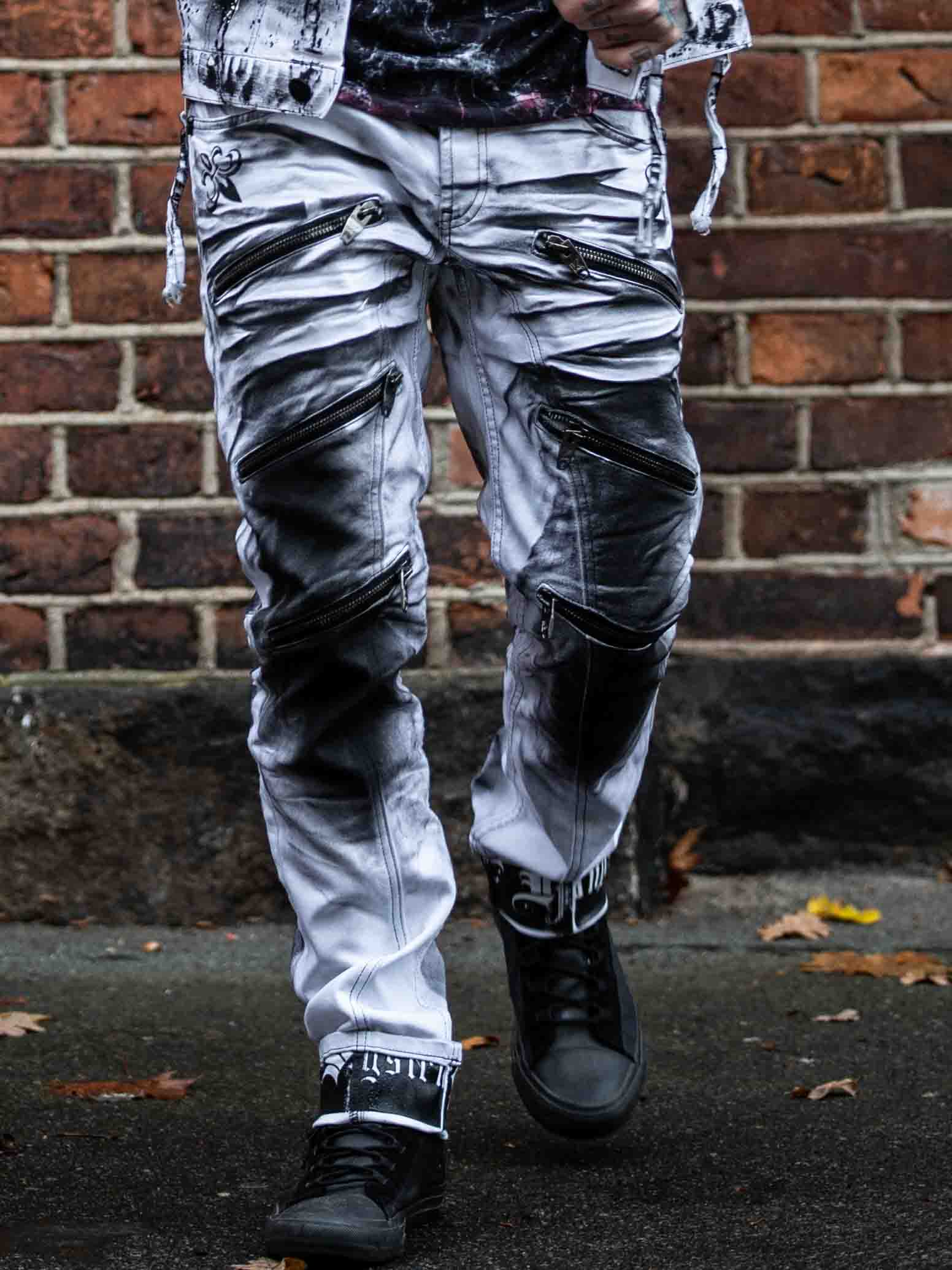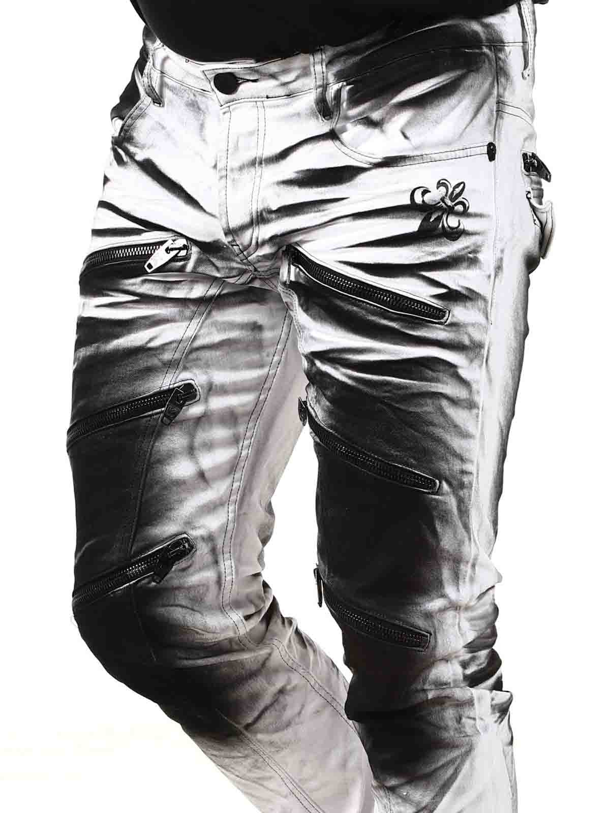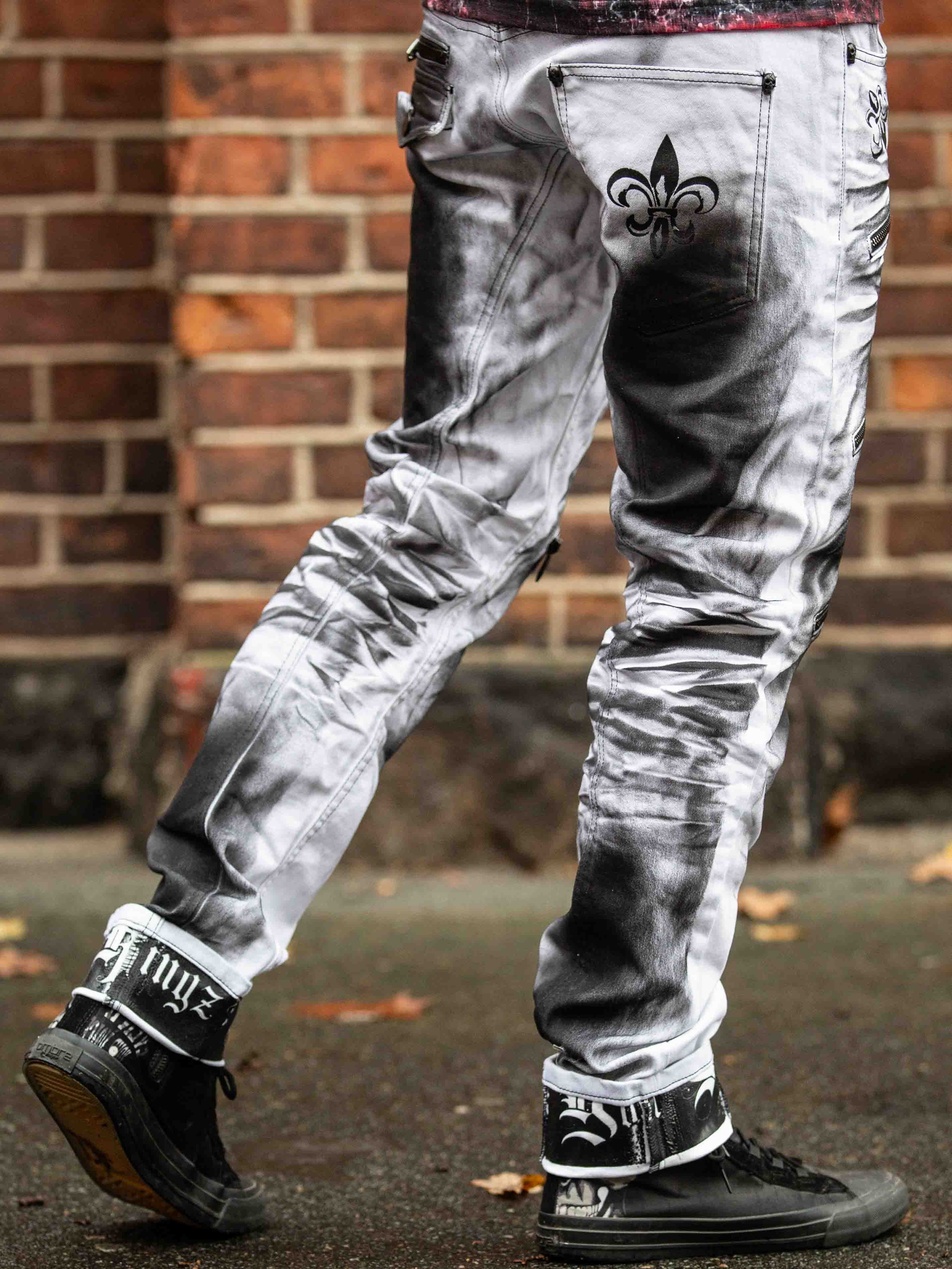 Päheät farkut, joiden lahkeensuissa on painatus. Farkuissa on kolme etutaskua, kaksi takataskua ja vyötäröllä vyölenkit. Niissä on rouheina yksityiskohtina vetoketjuja, printtejä ja kontrastiompeleita.