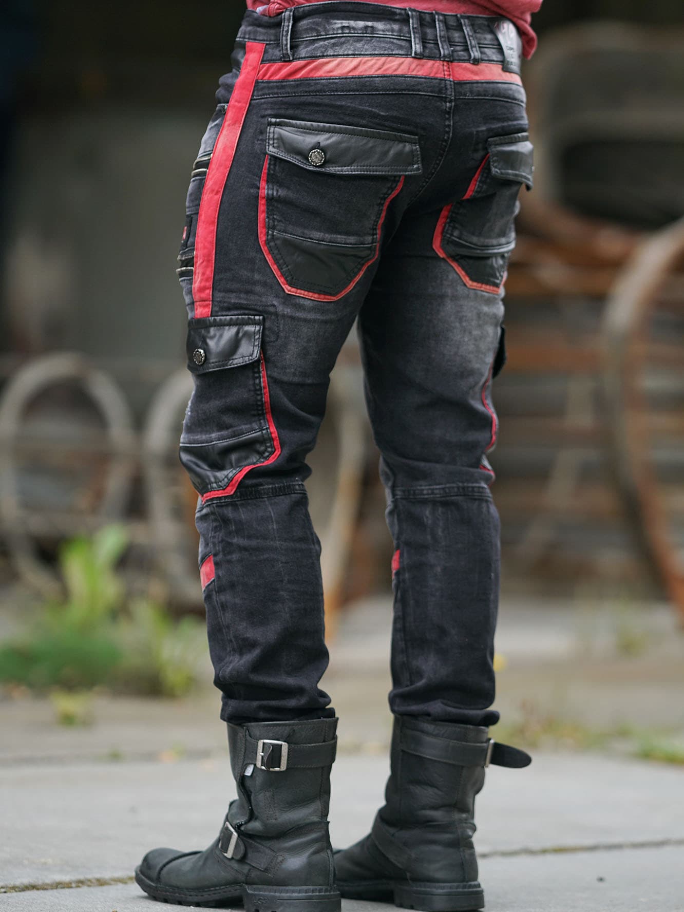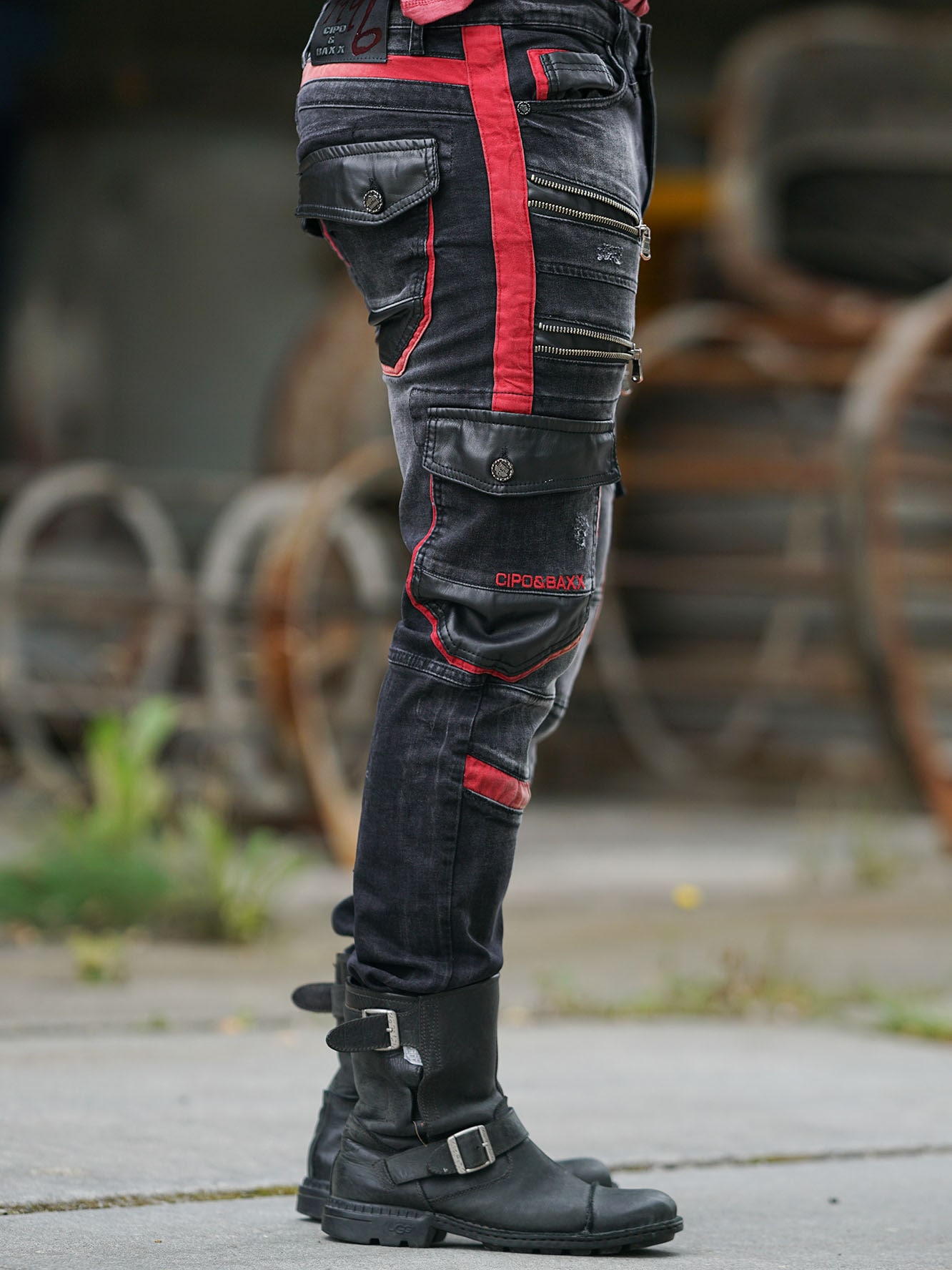 Mustat, kapeat farkut viimeistelemättömillä yksityiskohdilla ja tyylikkäillä kulutuksilla. Materiaali tuntuu joustavalta ja mallissa on neljä taskua edessä sekä kaksi takana. Uniikki suunnittelu, jossa on punaisia kontrastiosia, vetoketjuja sekä mustaa keinonahkaa.
