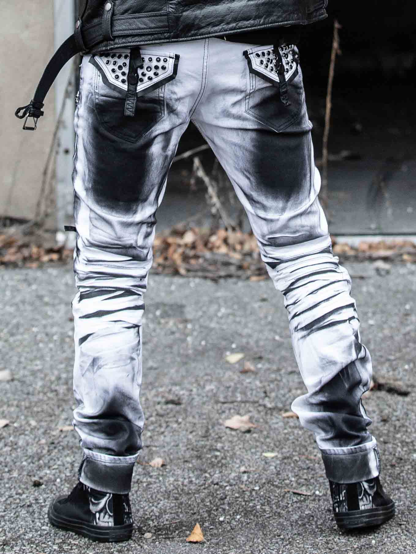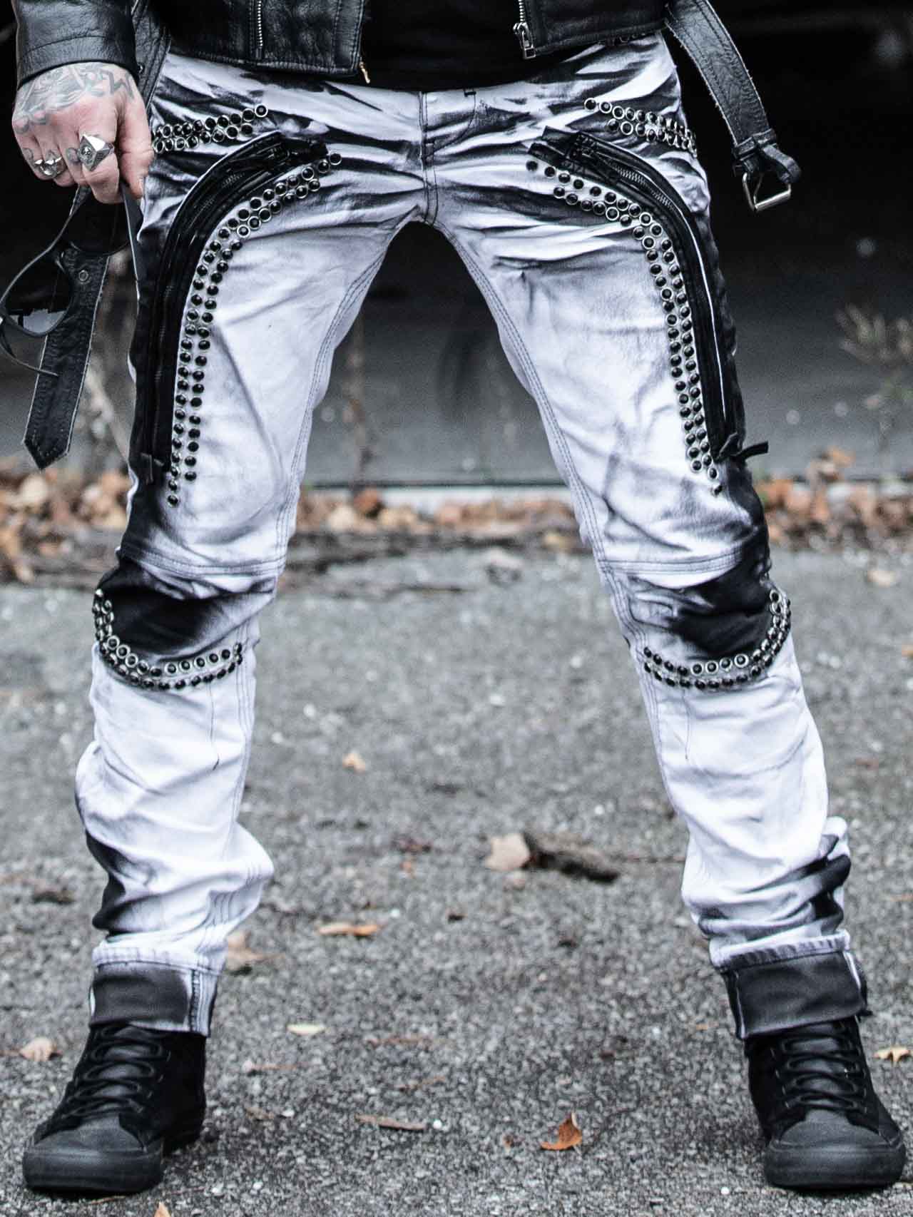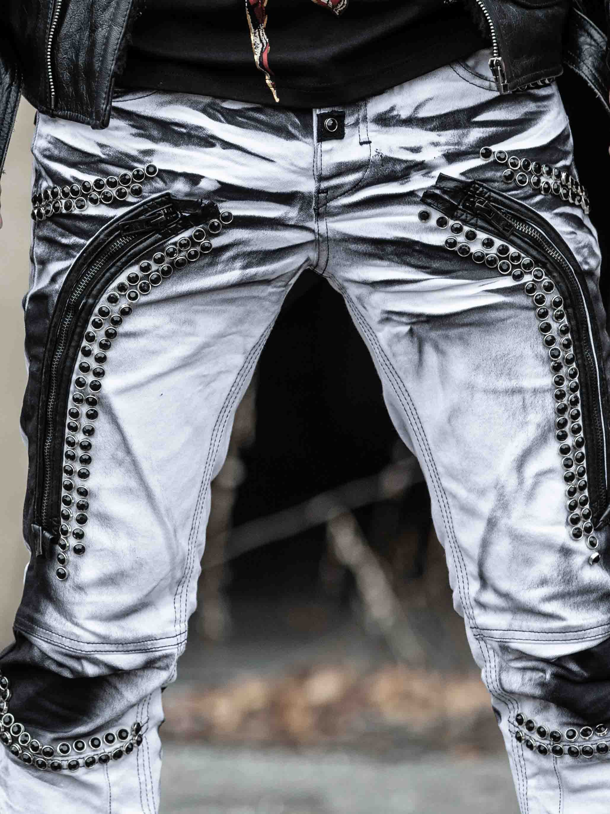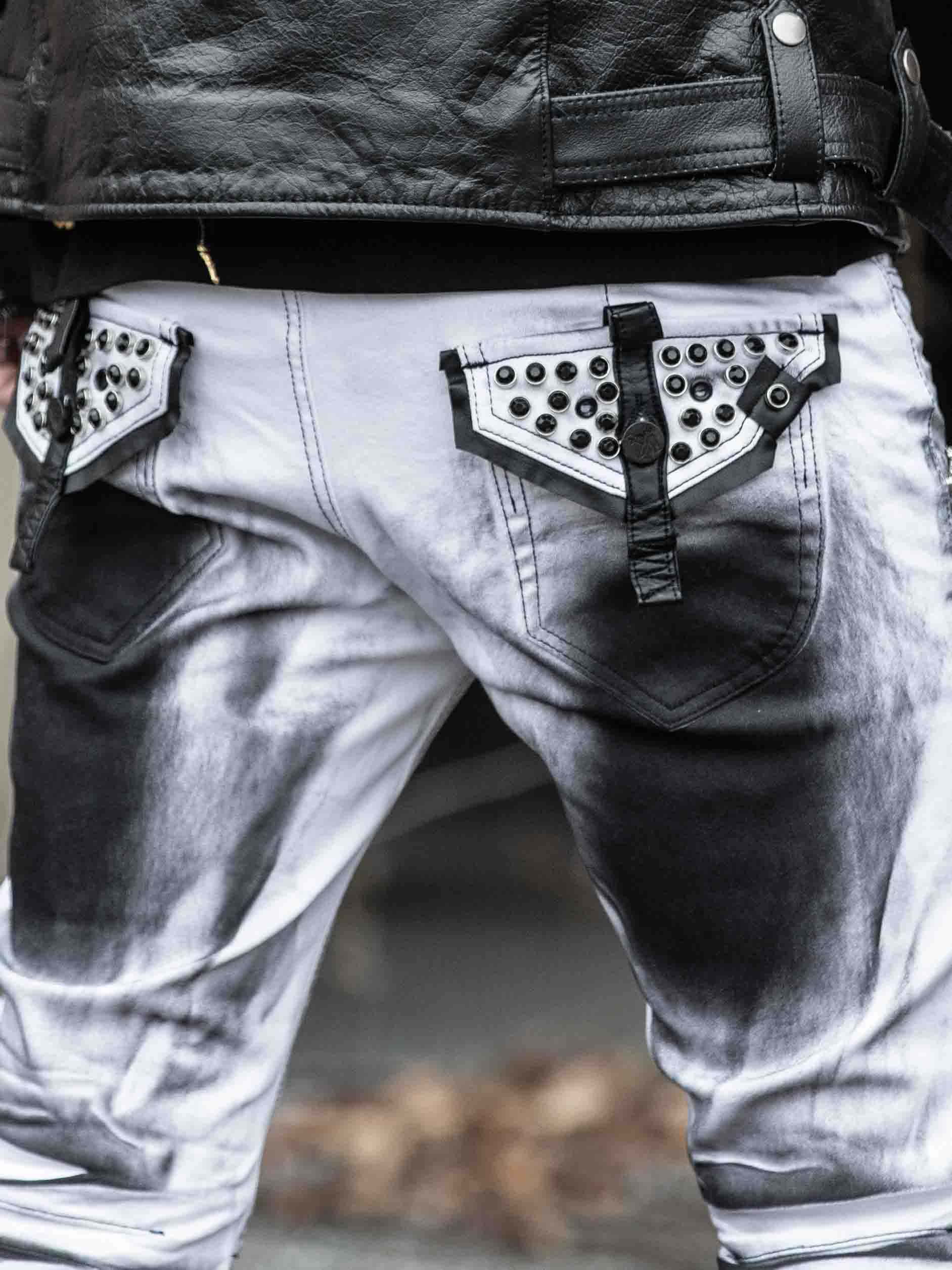 Valkoiset joustavat farkkuhousut kapeassa mallissa. Kolme avonaista etutaskua, kaksi suljettavaa taskua ja napitettava sepalus. Suunnittelussa on käytetty mustia timanttiniittejä, vetoketjuja sekä tekonahkaisia remmejä.