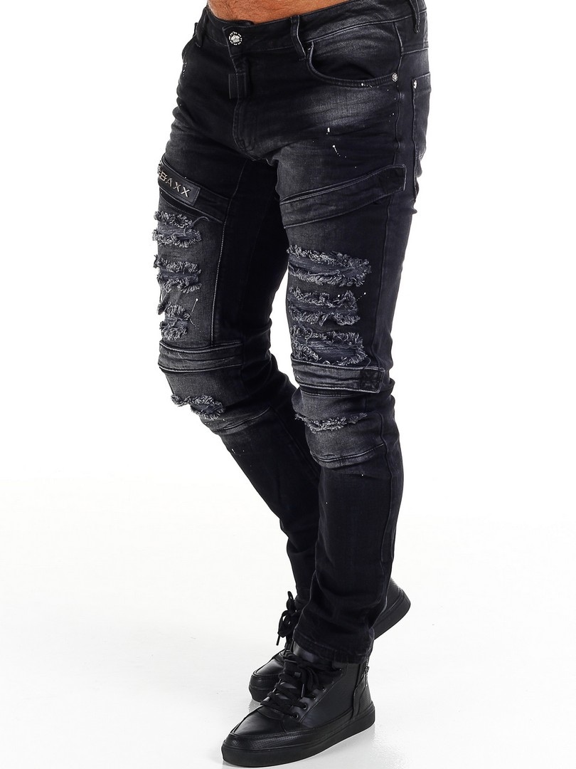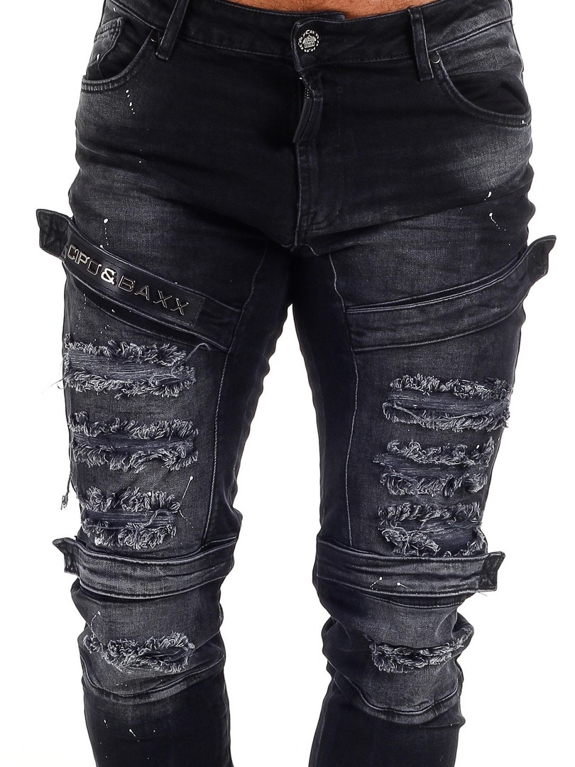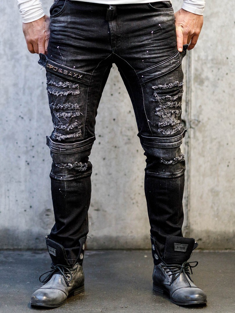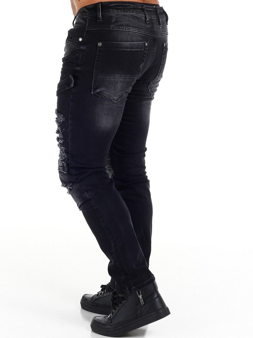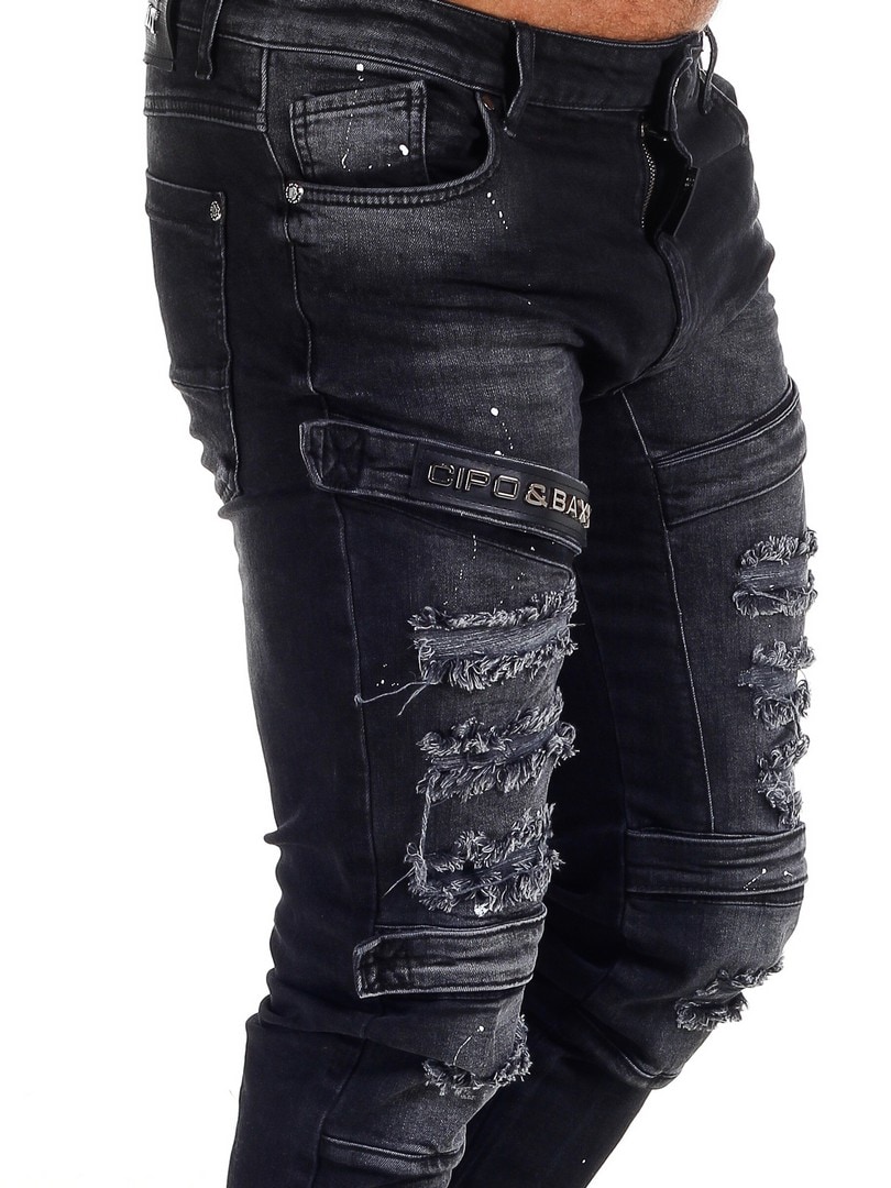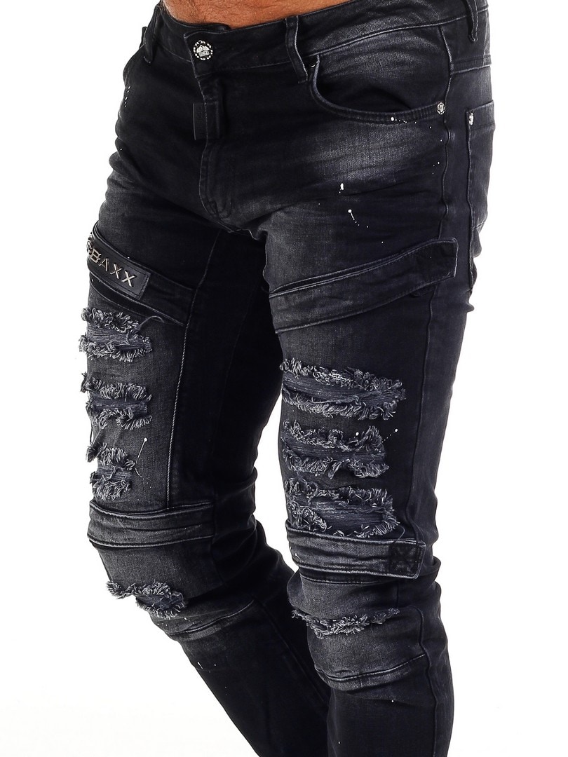 Mustat farkut täydellisillä kulutuksilla. Repeämät, väriroiskeet ja hopeiset metalliyksityiskohdat tekevät rocktyylistäsi ainutlaatuisen. Joustavaa materiaalia slim fit -mallissa. Tilavia taskuja sekä edessä että takana.