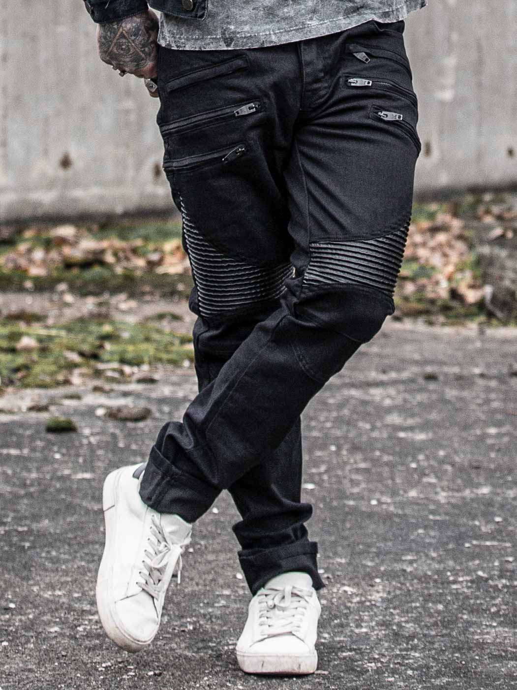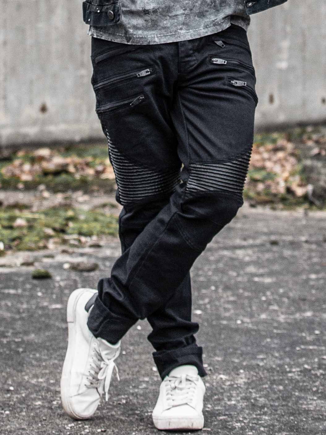 Ainutlaatuiset farkut, joissa on keinonahkaa reisien ja takataskujen kohdalla. Yksityiskohdat on koristeltu reiden etuosassa olevilla päheillä vetoketjuilla. Joustava malli, jossa on kaksi etutaskua, kaksi takataskua ja napitettava sepalus.