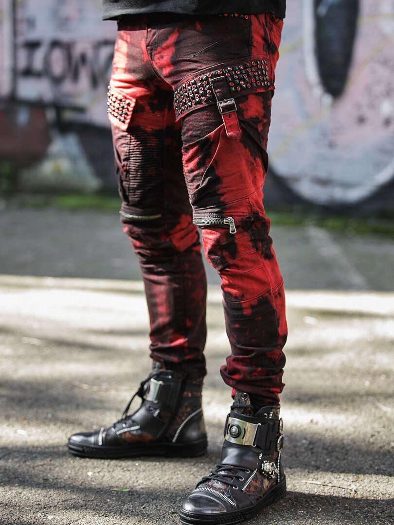 Uniikit housut punaisella ja viininpunaisella pesukäsittelyllä. Taskujen reuna on koristeltu mustilla nastoilla ja punaisilla koristekivillä. Vetoketju jalkojen etuosassa. Kolme tavallista taskua edessä, kaksi takataskua sekä kaksi reisitaskua.