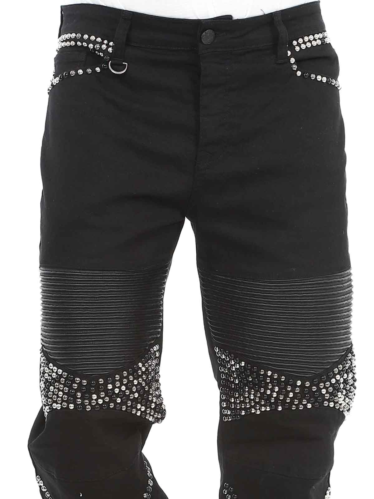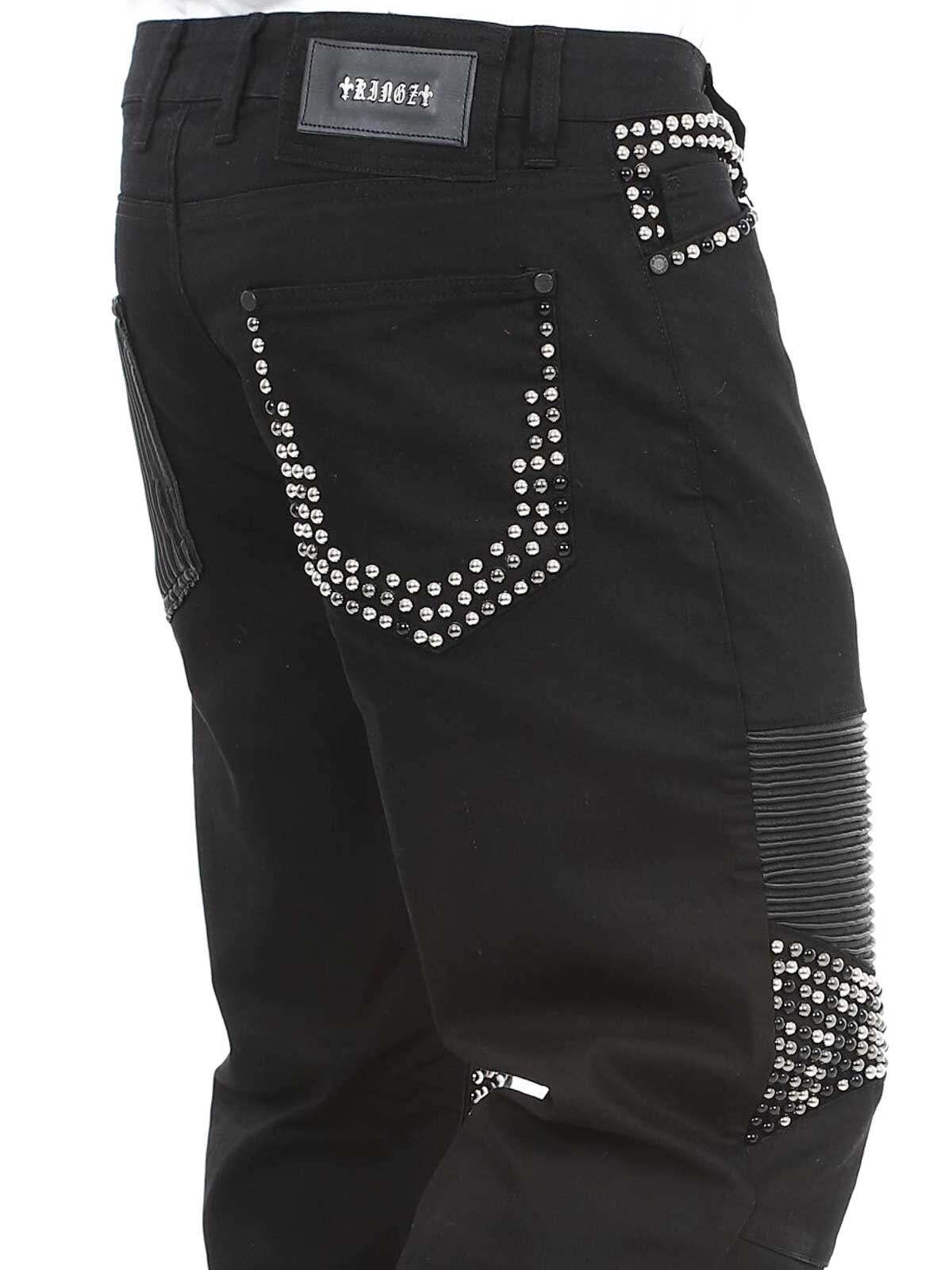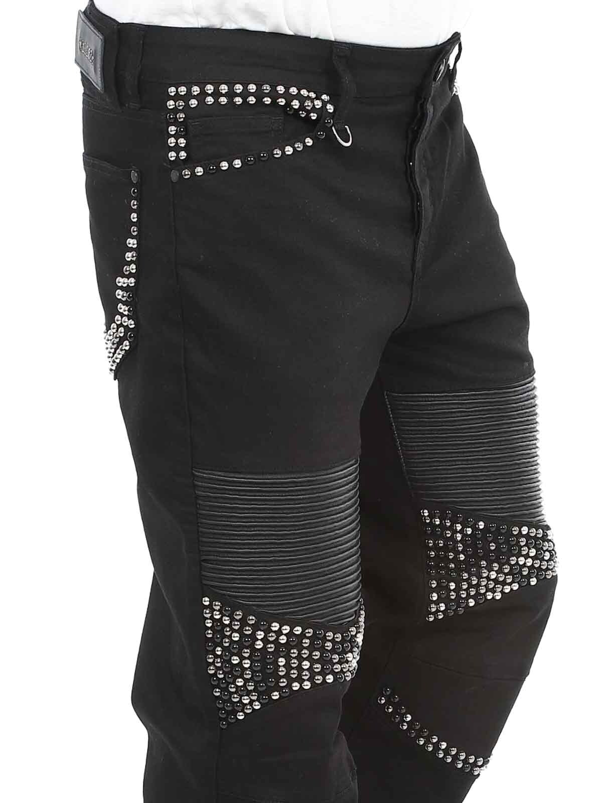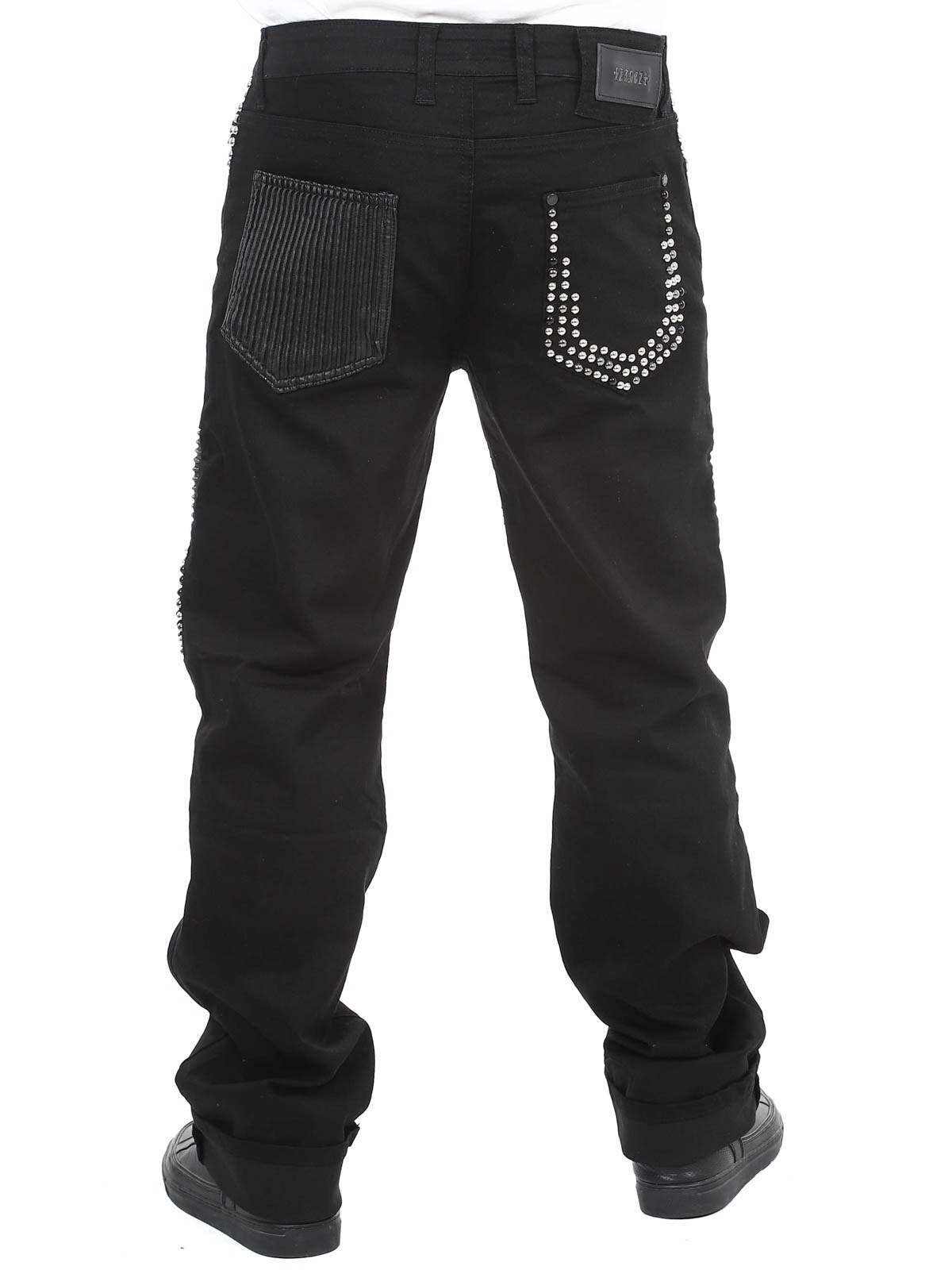 Mukavat farkut, joissa on niittejä, keinonahkaa reisissä sekä takatasku. Farkuissa on viisi taskua, vyölenkit vyötäröllä ja ne sulkeutuvat napitettavasta sepaluksesta.