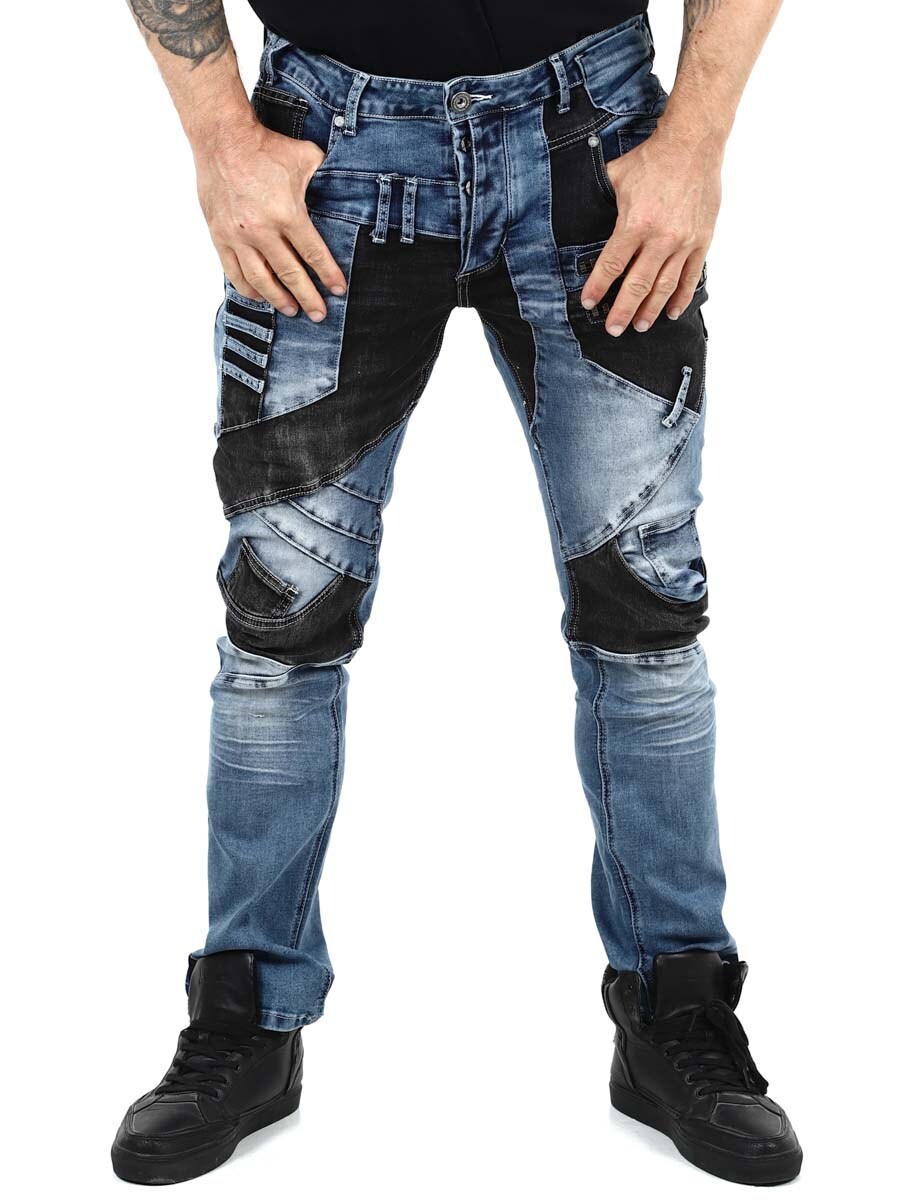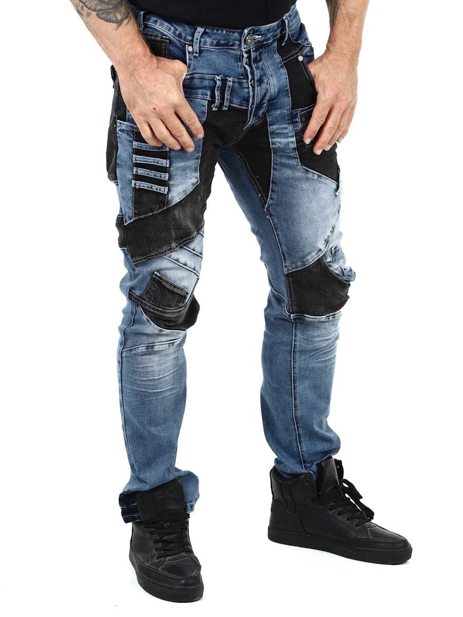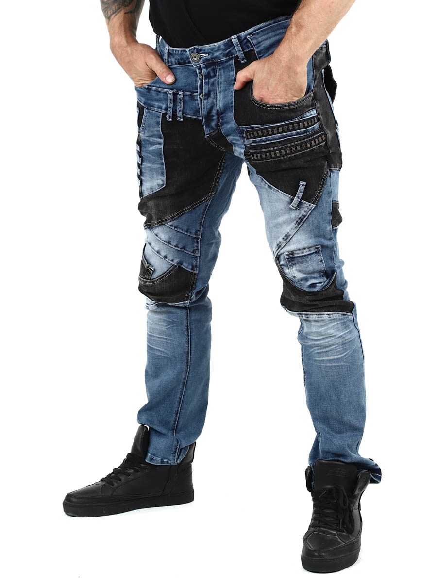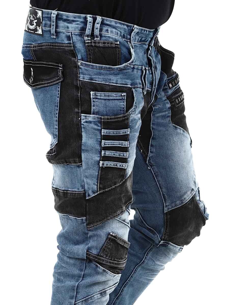 Näissä uniikeissa farkuissa klassisen sininen denim ja mustat kontrastipaneelit muodostavat modernin ja itsevarman kokonaisuuden. Vetoketjut, saumat ja metallimerkit saavat aikaan rouhean ilmeen. Farkuissa on paljon taskuja sekä edessä että takana ja vyölenkit vyötäröllä.