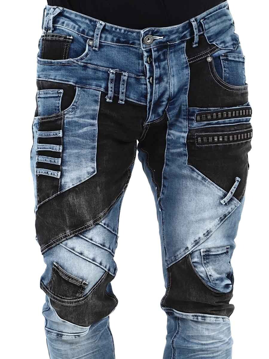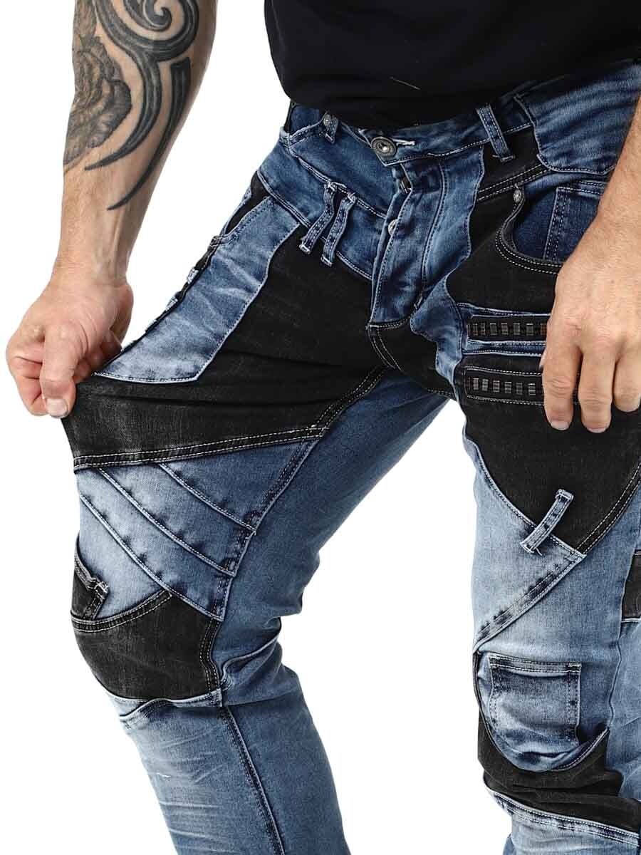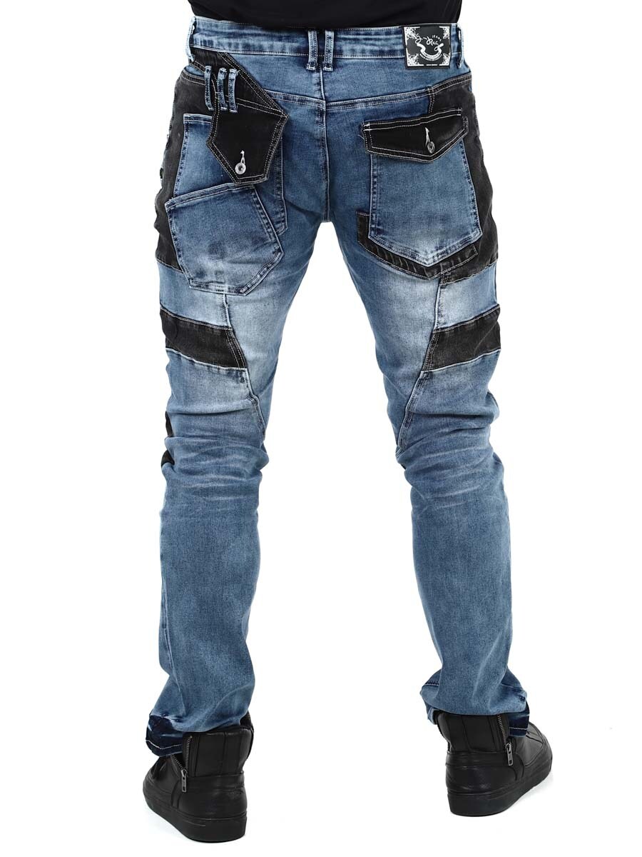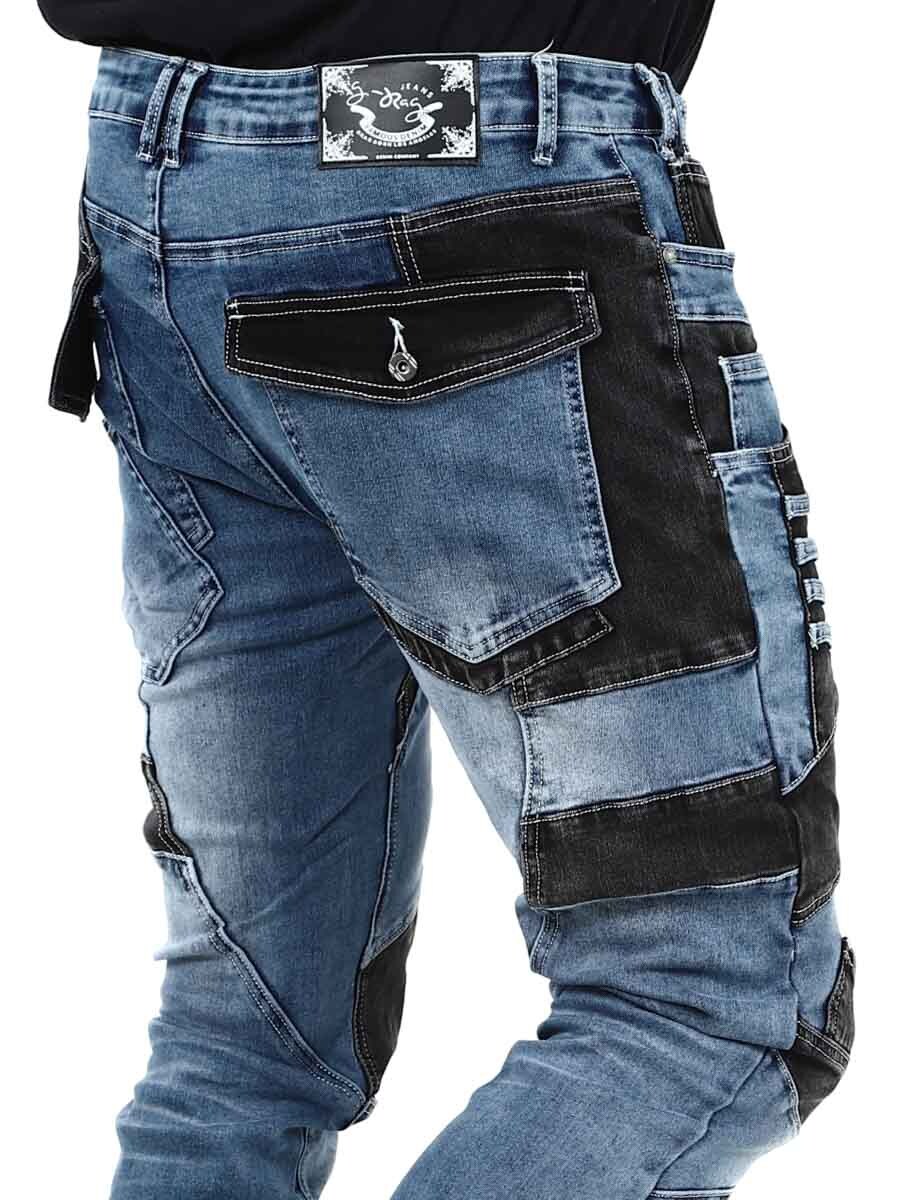 Näissä uniikeissa farkuissa klassisen sininen denim ja mustat kontrastipaneelit muodostavat modernin ja itsevarman kokonaisuuden. Vetoketjut, saumat ja metallimerkit saavat aikaan rouhean ilmeen. Farkuissa on paljon taskuja sekä edessä että takana ja vyölenkit vyötäröllä.