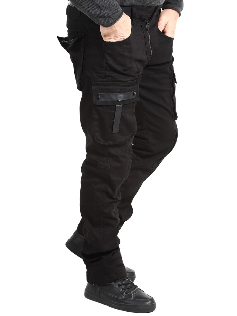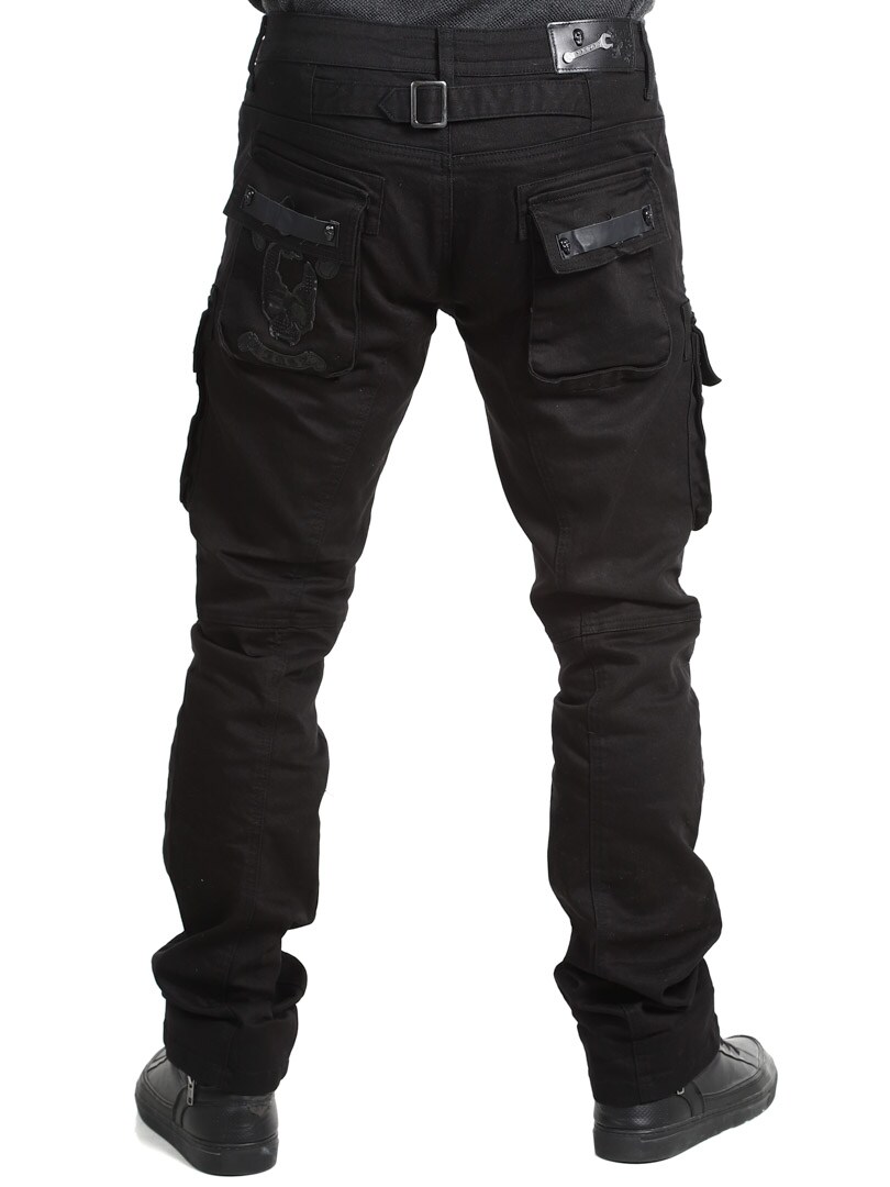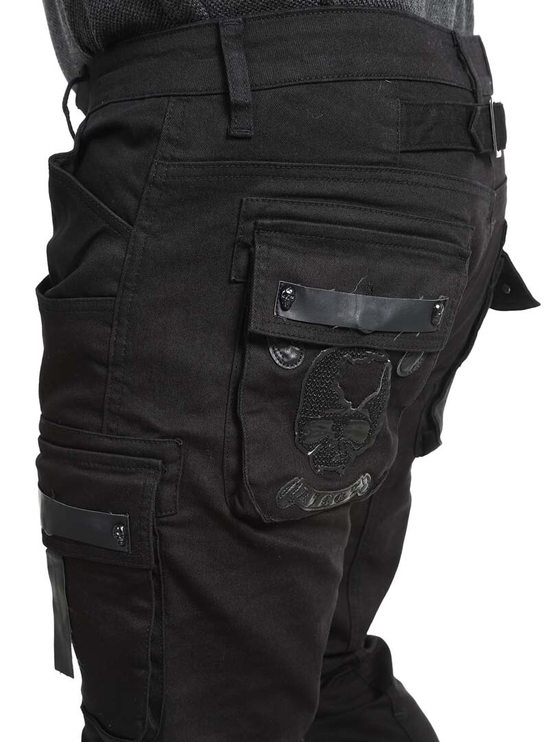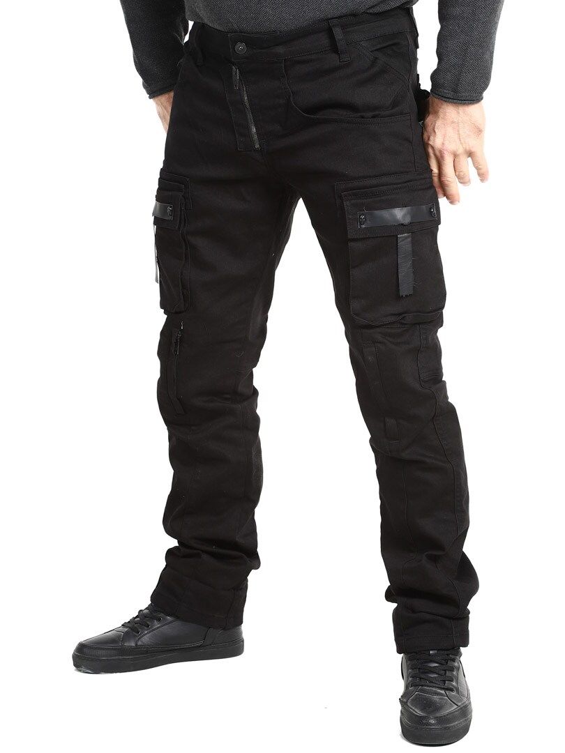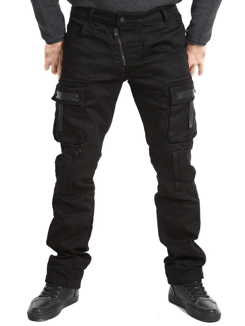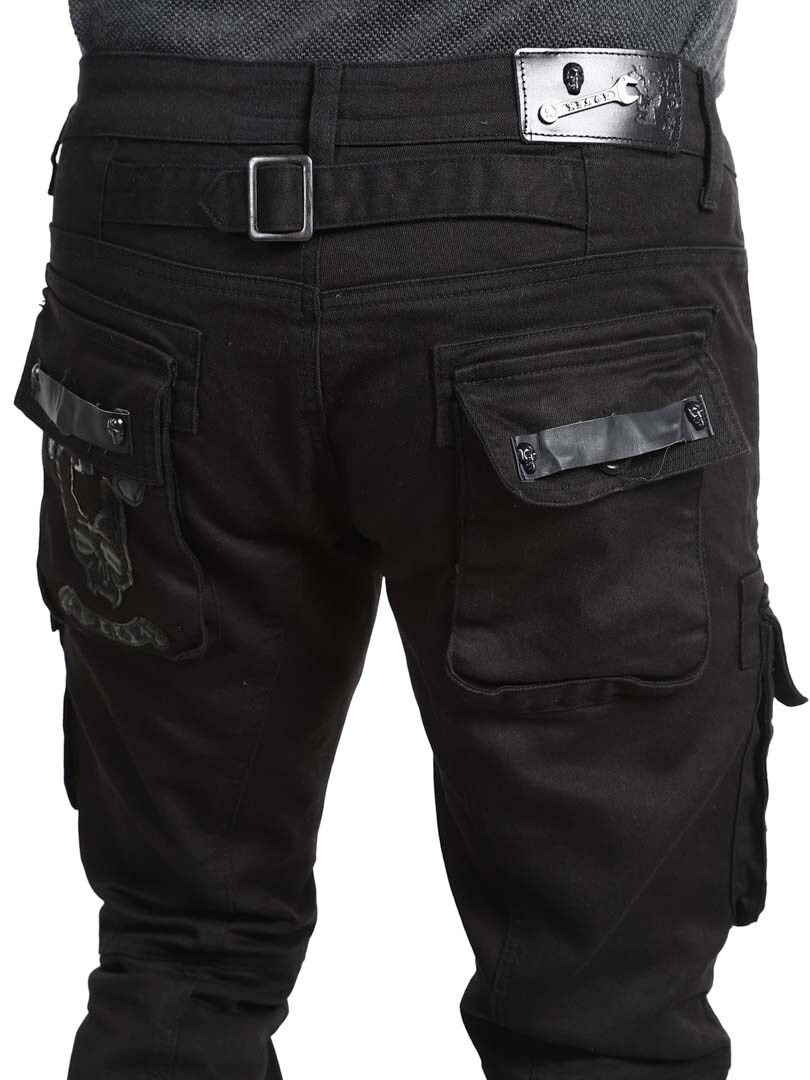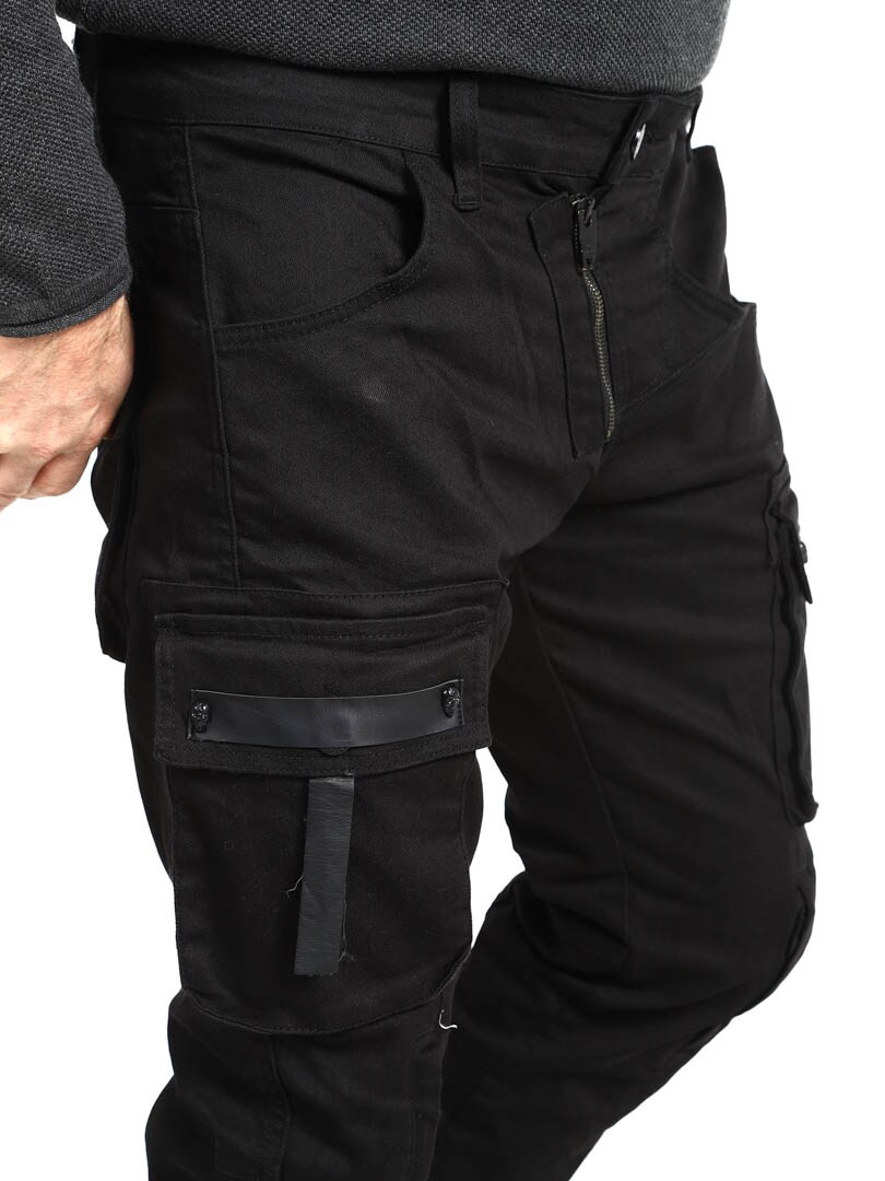 Ainutlaatuiset farkut, joissa on useita taskuja. Runsaasti yksityiskohtia, kuten pääkalloniitit, nahkahihnat ja vetoketjut polvissa. Farkut suljetaan vetoketjullisella sepaluksella ja vyötäröllä on vyölenkit.