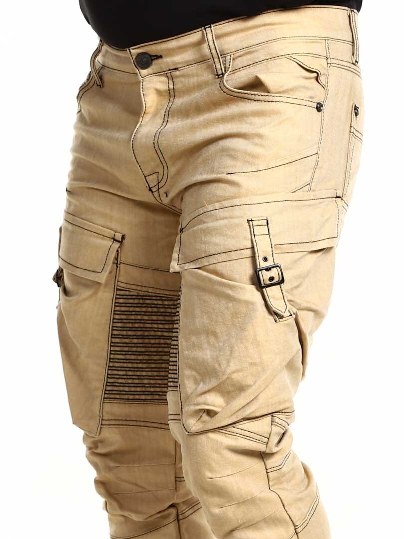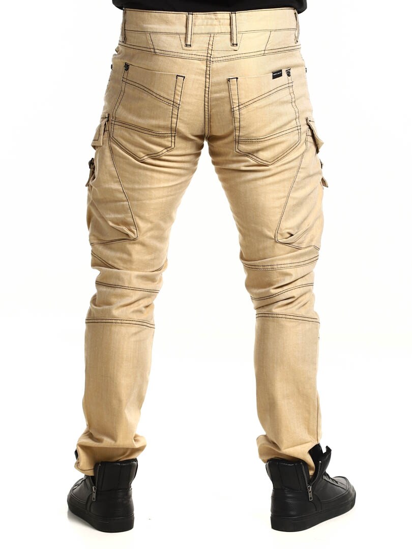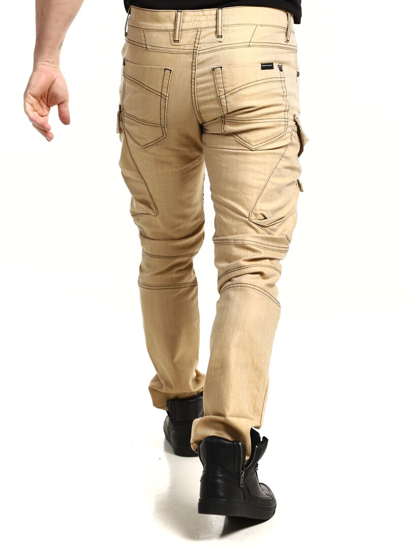 Hienosta puuvillasta valmistetut farkut, joissa on tavallinen malli ja hiukan kapenevat lahkeet. Mustat ompeleet ja cargotaskut saavat ne erottumaan joukosta.