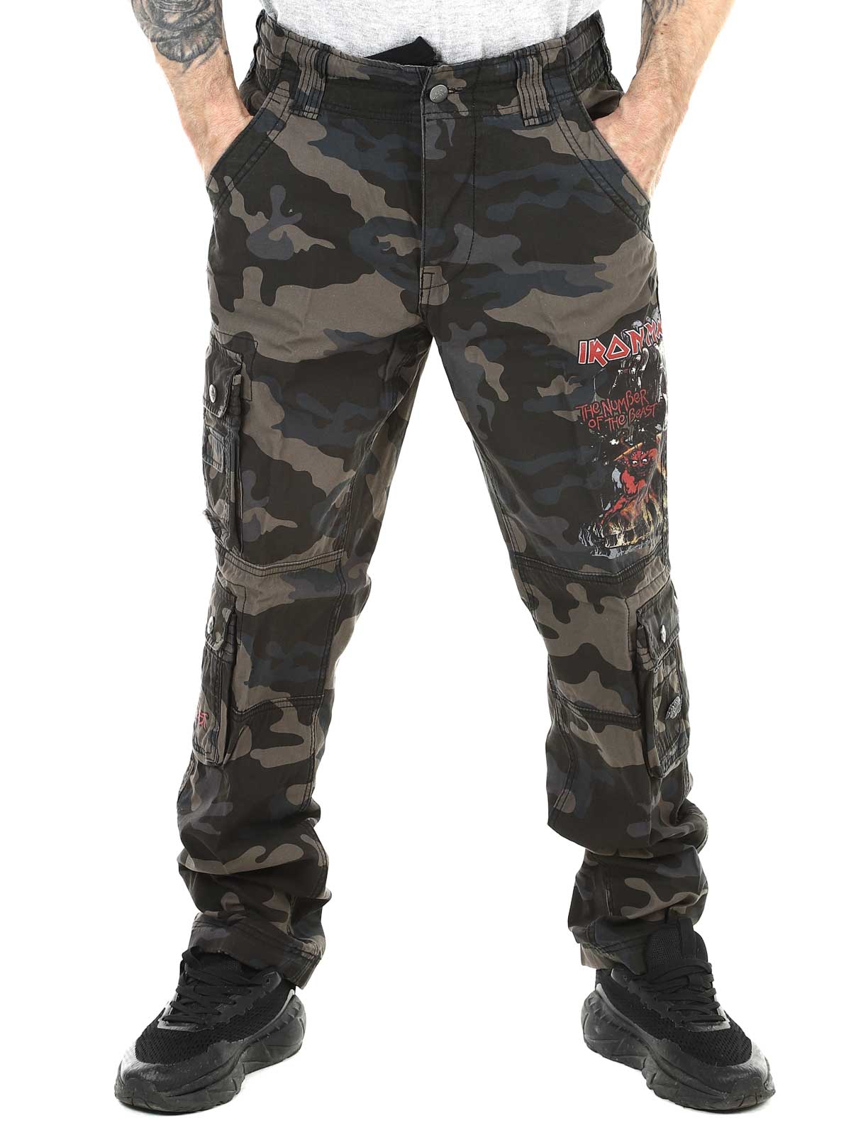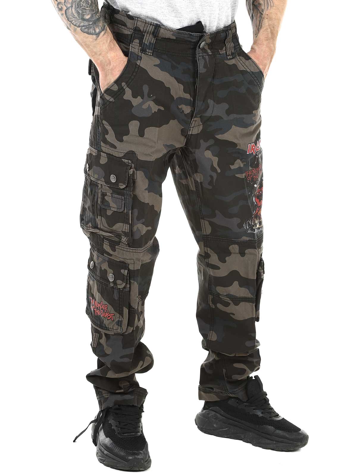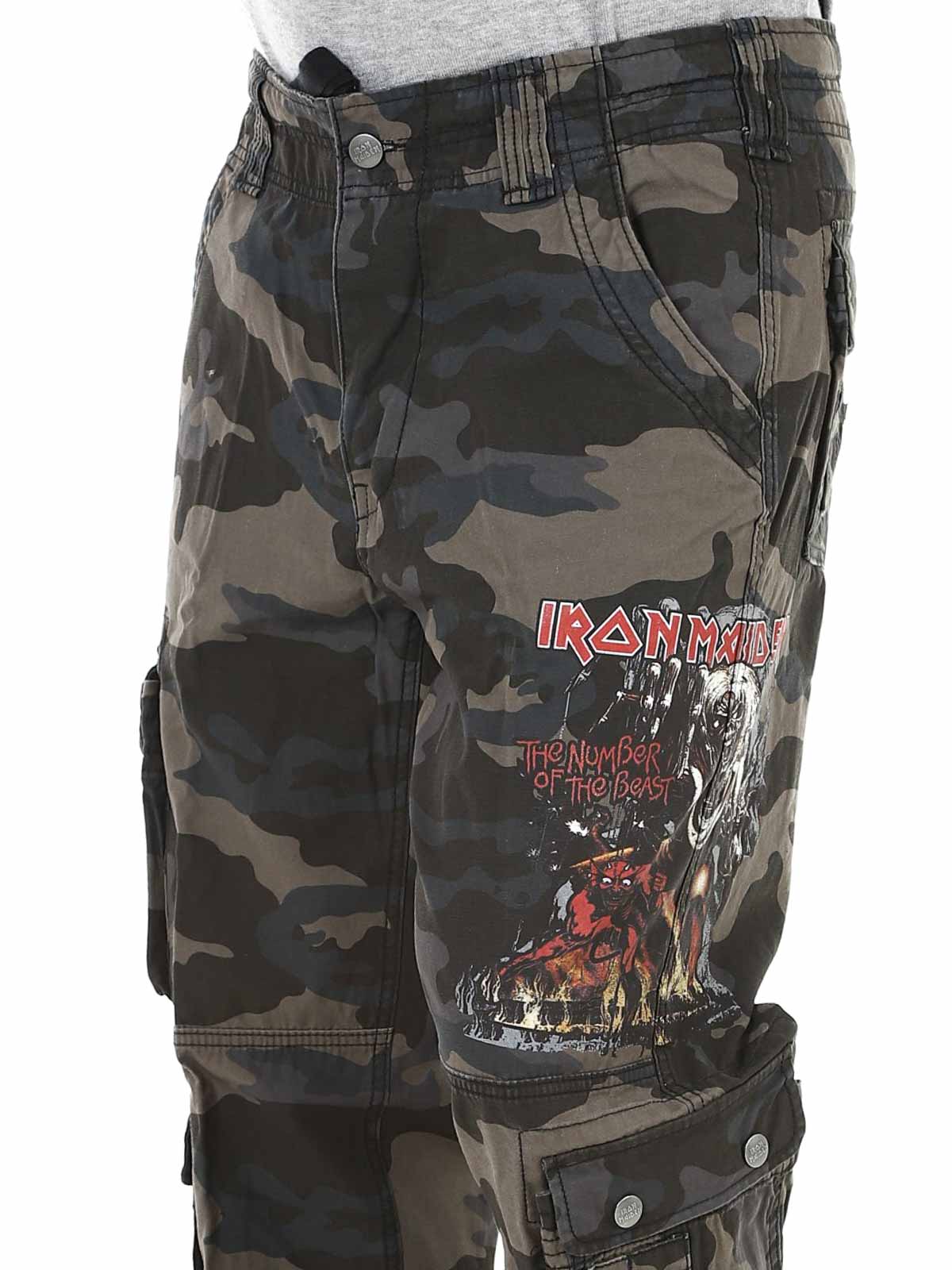 Tummat housut slim fit -istuvuudella ja kestävästä, ihoa miellyttävästä puuvillamateriaalista, joka tarjoaa sekä mukavuutta että kulutuskestävyyttä. Säädettävät kangasremmit vyötäröllä ja lahkeensuissa tekevät passauksen muokkaamisesta helppoa. Housuissa on suuri Iron Maiden -printti vasemmassa lahkeessa ja ”Number of the Beast” -printti oikeassa reisitaskussa. Selkeä kunnianosoitus ikonilliselle heavy metal -bändille Iron Maidenille.