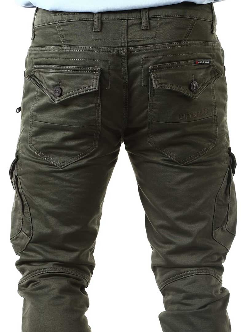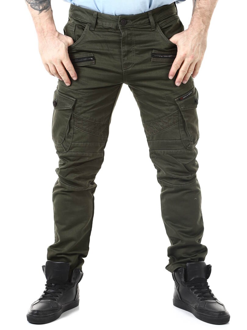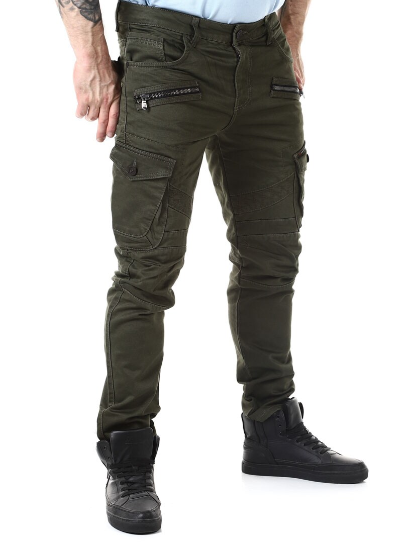 Vihreä pohjaväri ja yksityiskohtina vetoketjuja ja mattametallisia pääkallonappeja. Terävät, symmetriset yksityiskohdat lahkeissa. Kaksi sivutaskua, kaksi taskua reisissä ja kaksi takataskua. Hyvä malli mukavantuntuisesta puuvillasekoitteesta.
