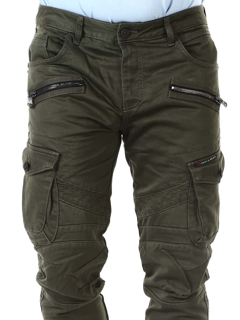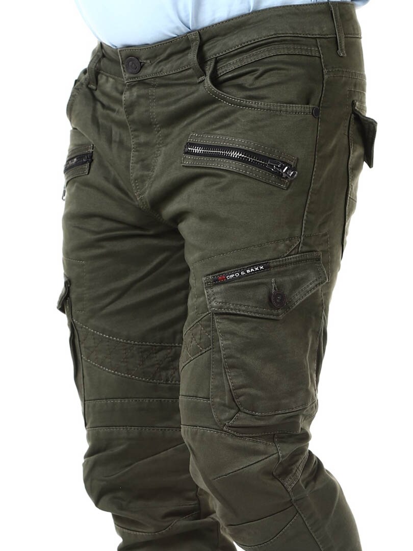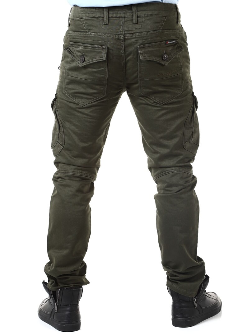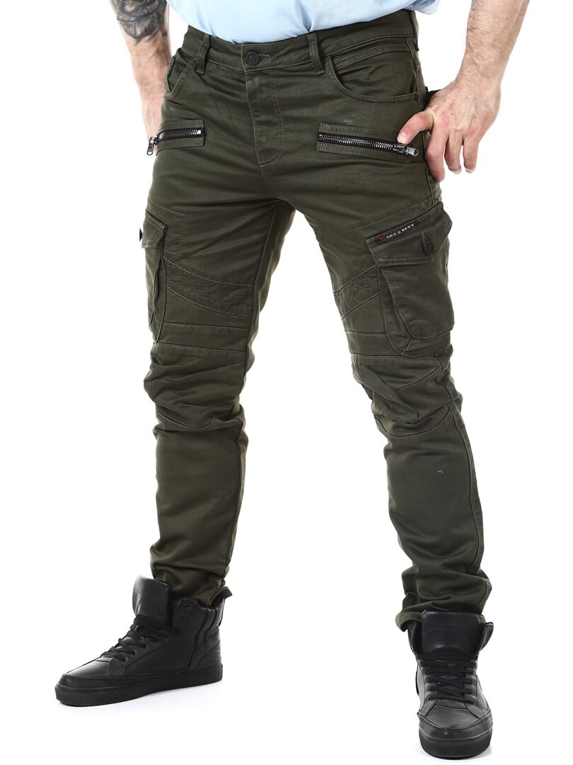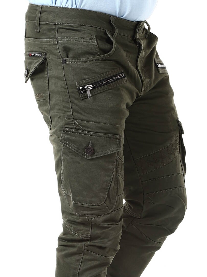Vihreä pohjaväri ja yksityiskohtina vetoketjuja ja mattametallisia pääkallonappeja. Terävät, symmetriset yksityiskohdat lahkeissa. Kaksi sivutaskua, kaksi taskua reisissä ja kaksi takataskua. Hyvä malli mukavantuntuisesta puuvillasekoitteesta.