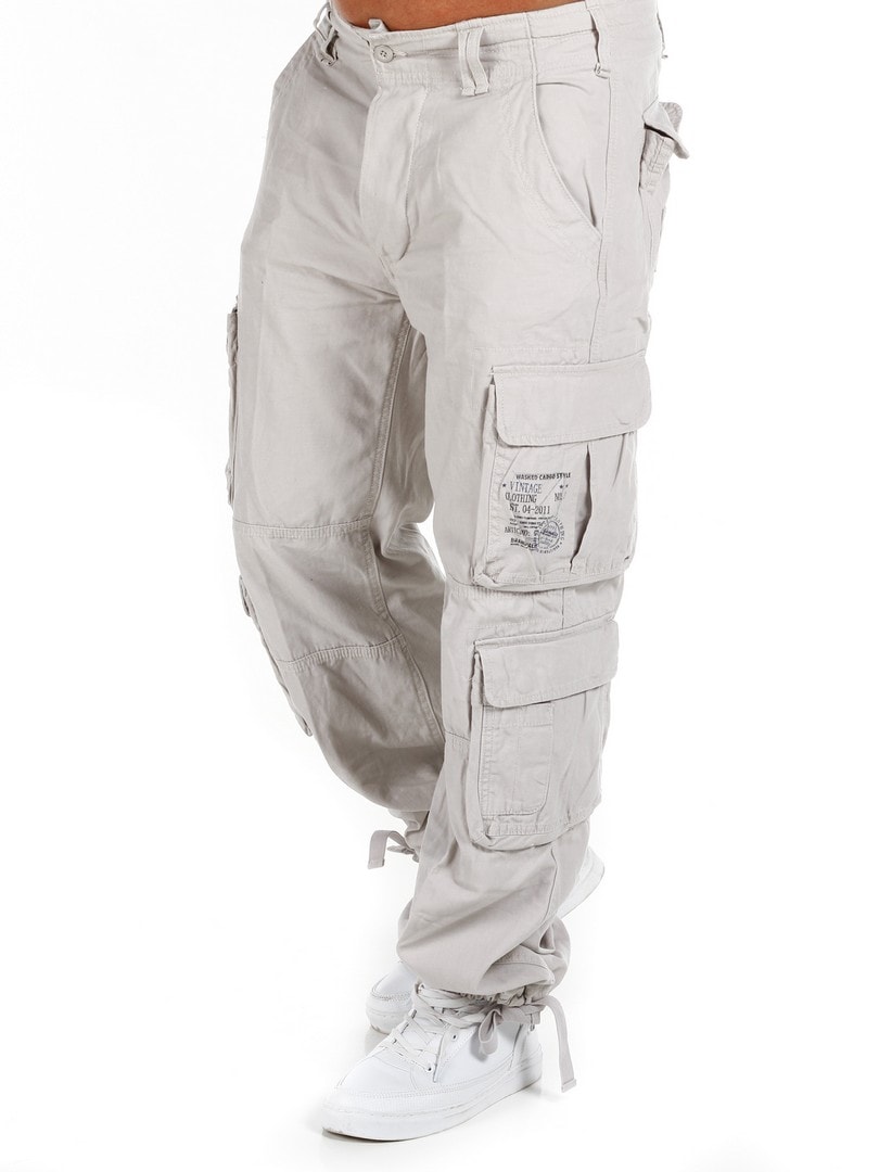 Hyvännäköiset puuvillahousut väljässä mallissa ja reisitaskuilla sivuilla. Käytännölliset housut, joissa on runsaasti tilavia taskuja, ja säädettävät vyöärö sekä lahkeet.