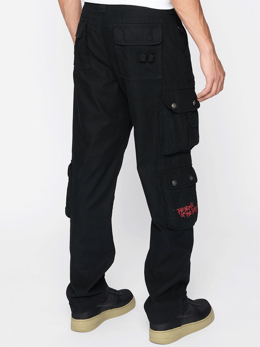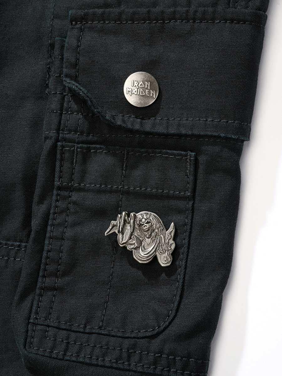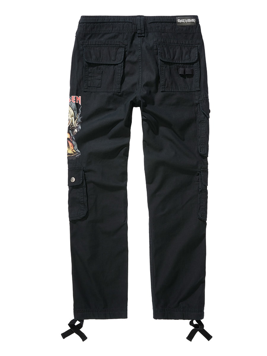 Musta slim fit -mallinen housut, valmistettu kestävästä ja iholle miellyttävästä puuvillamateriaalista, joka tarjoaa sekä mukavuutta että kestävyyttä. Säädettävät kangasremmit vyötäröllä ja lahkeensuissa tekevät passauksen muokkaamisesta helppoa. Housuissa on suuri Iron Maiden -printti vasemmassa lahkeessa ja ”Number of the Beast” -printti oikeassa reisitaskussa. Selkeä kunnianosoitus ikonilliselle heavy metal -bändille Iron Maidenille.