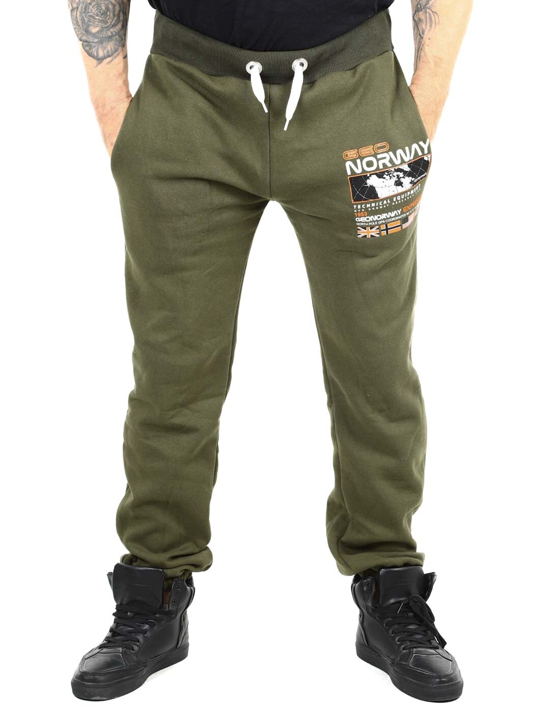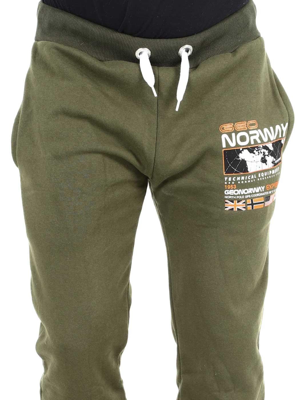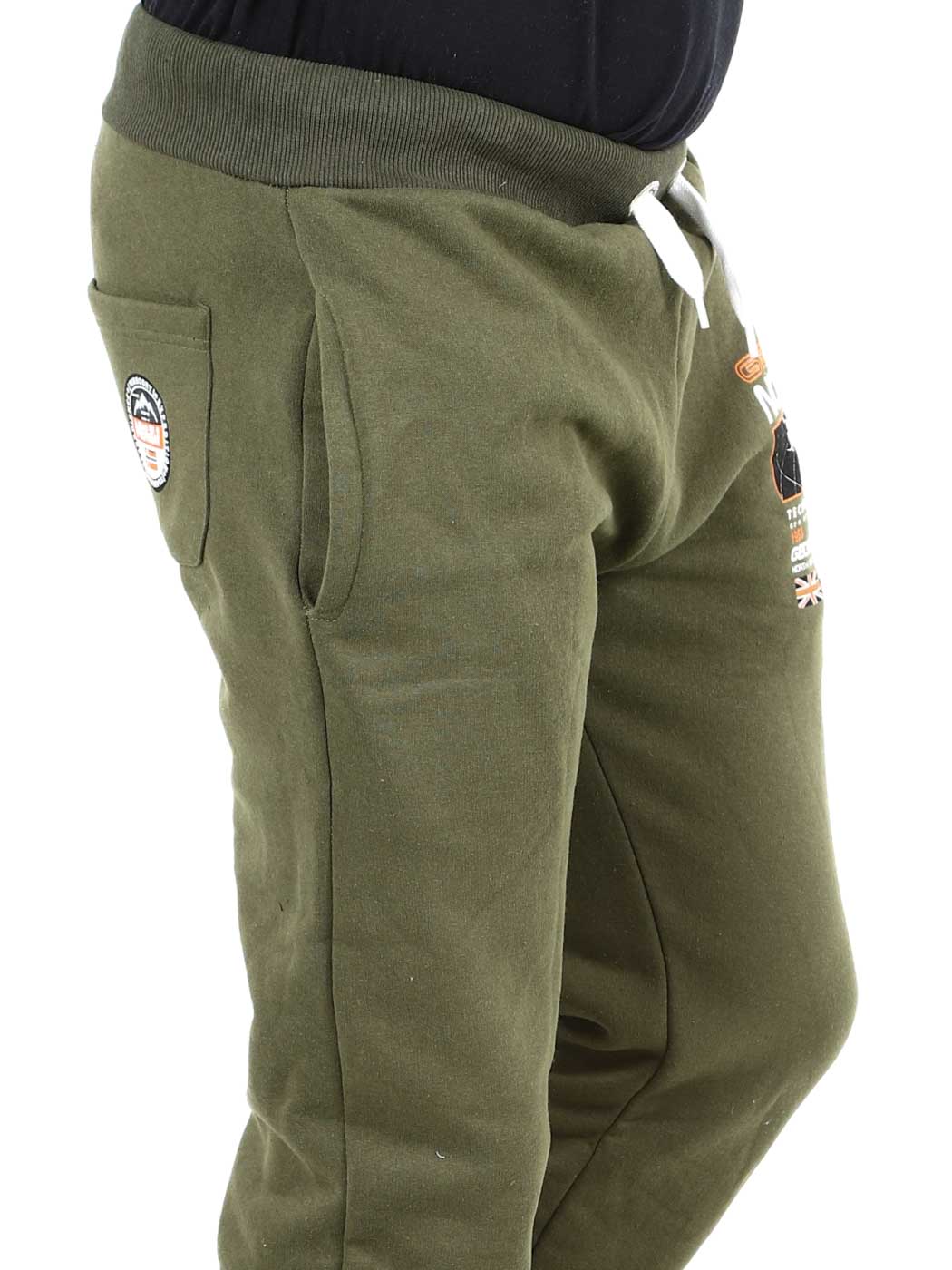 Vihreät housut, joissa on kontrastivärinen painatus lahkeissa ja takataskussa. Housuissa on kolme avotaskua, harjattu sisäpuoli ja kiristysnauhat vyötäröllä. Ribattu vyötärö, resorit lahkeensuissa.