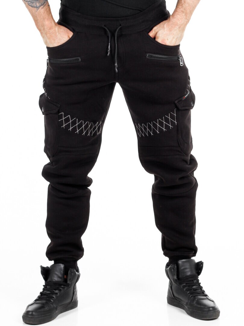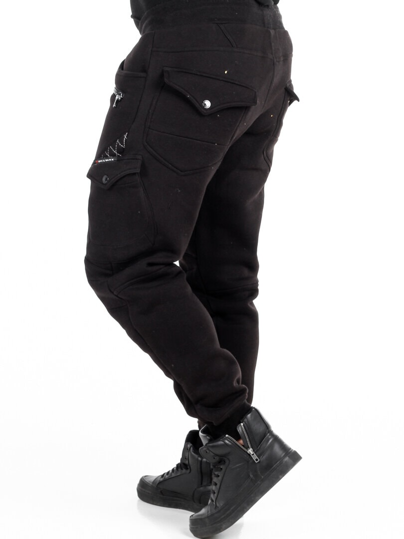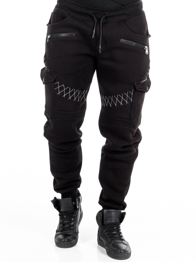 Mukavasta materiaalista valmistetut housut, joissa on joustavat resorit vyötäröllä ja lahkeensuissa. Housuissa on painettavilla napeilla suljettavat reisitaskut sekä takataskut. Edessä on rouheat koristevetoketjut ja lahkeissa on kontrastiväriset ompeleet.