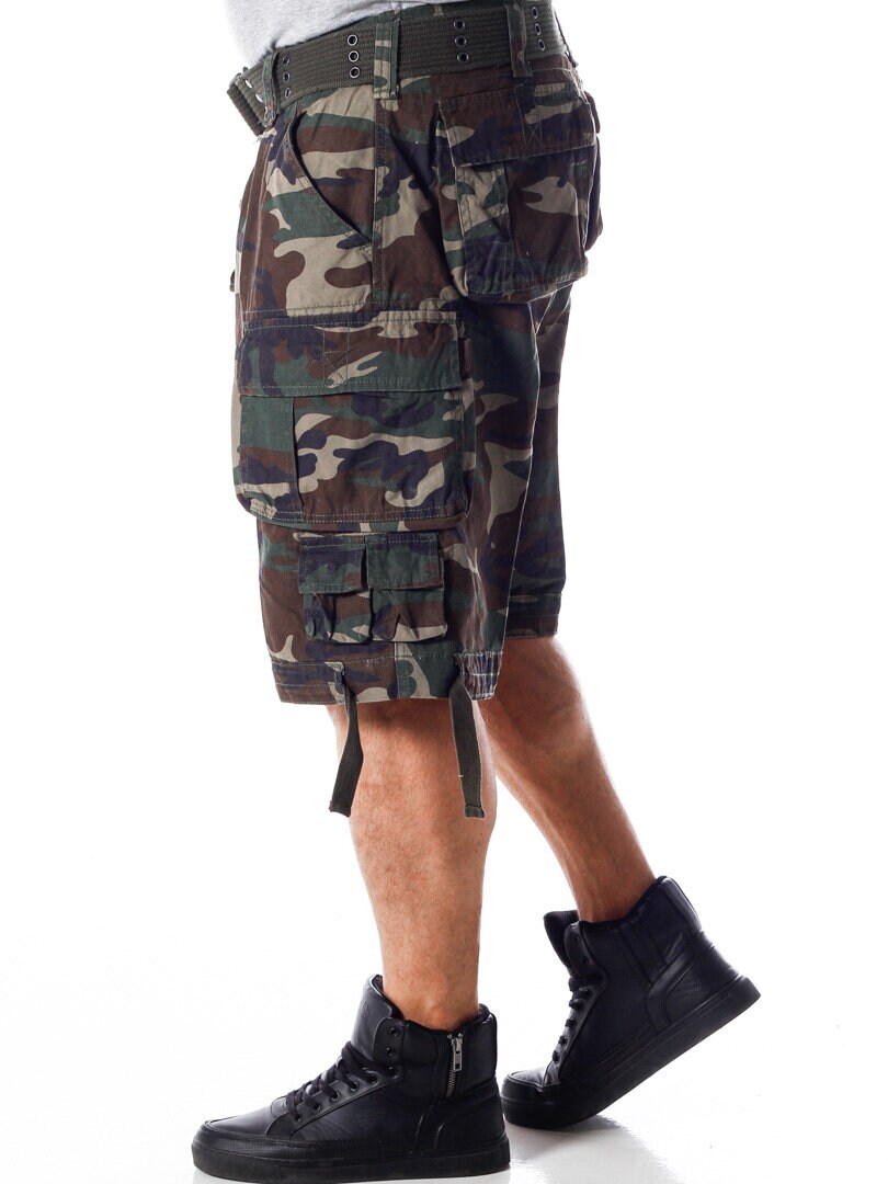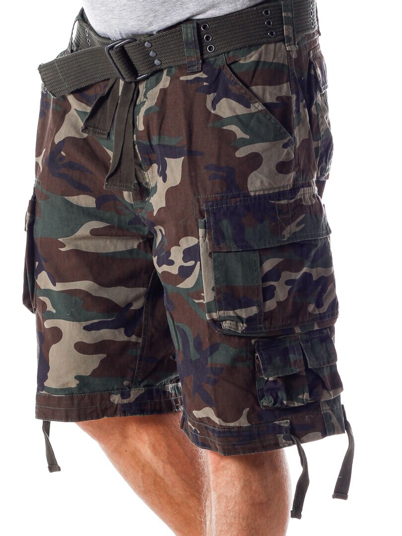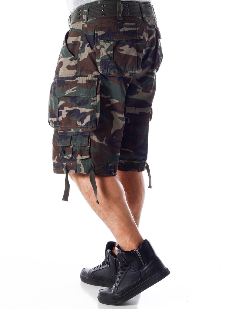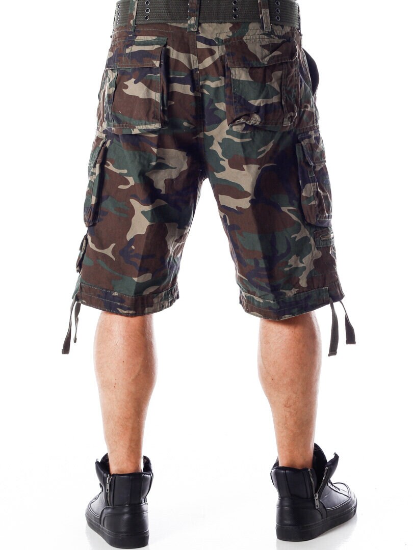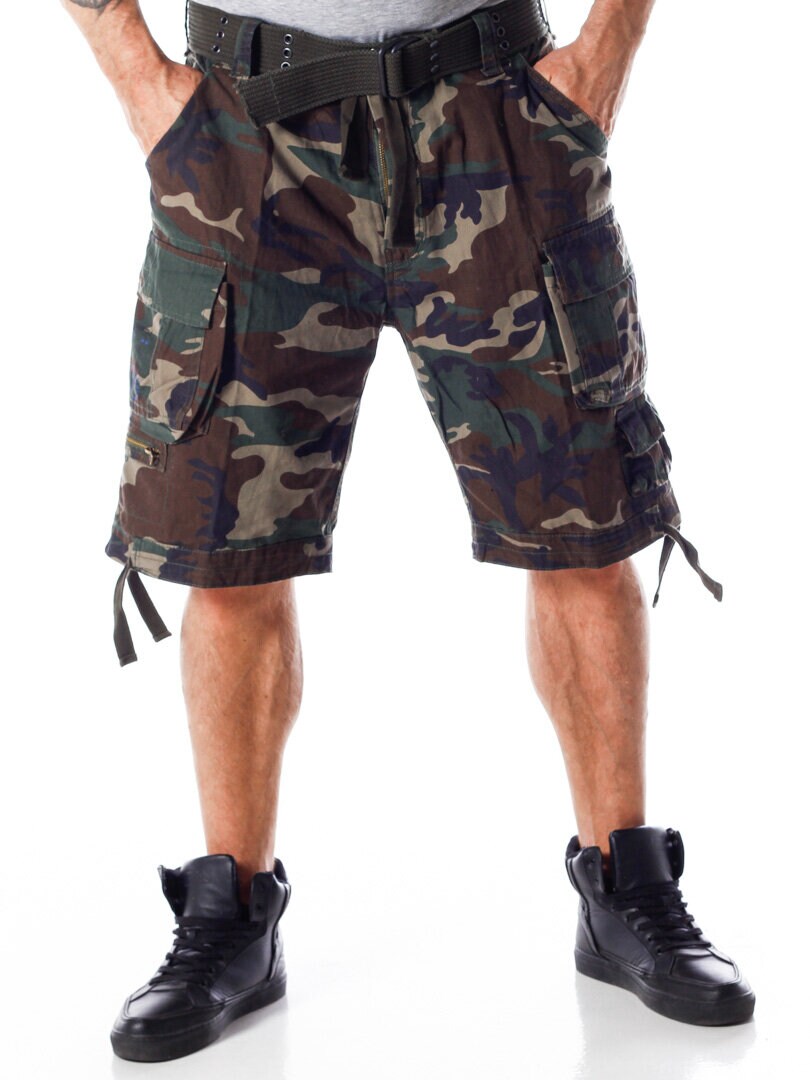 Camo shortsit, joiden sivuilla on tekstiprintti kontrastiväreissä. Valmistettu karkeasta puuvillalaadusta. Runsaasti taskuja, säädettävissä vyötäröltä ja lahkeista nauholla. Mukana irrotettava vyö!