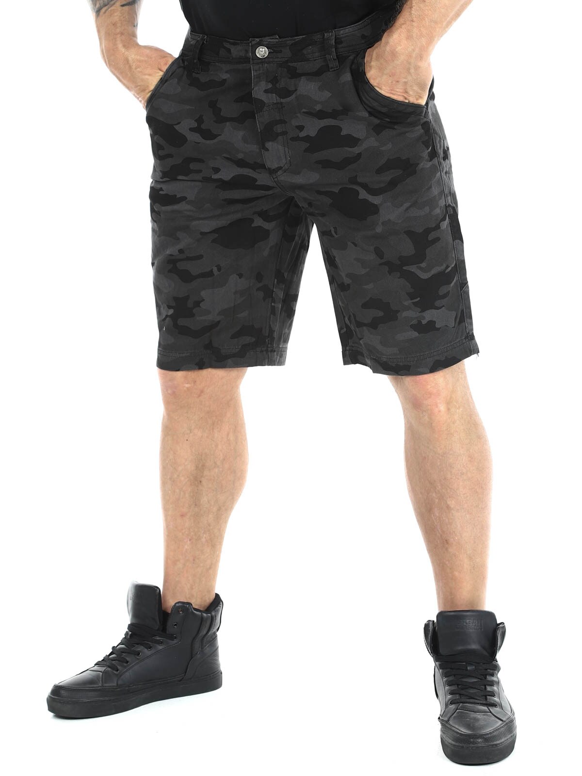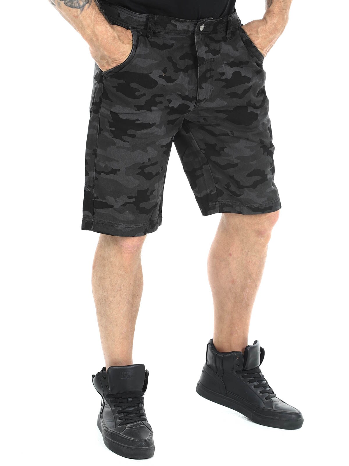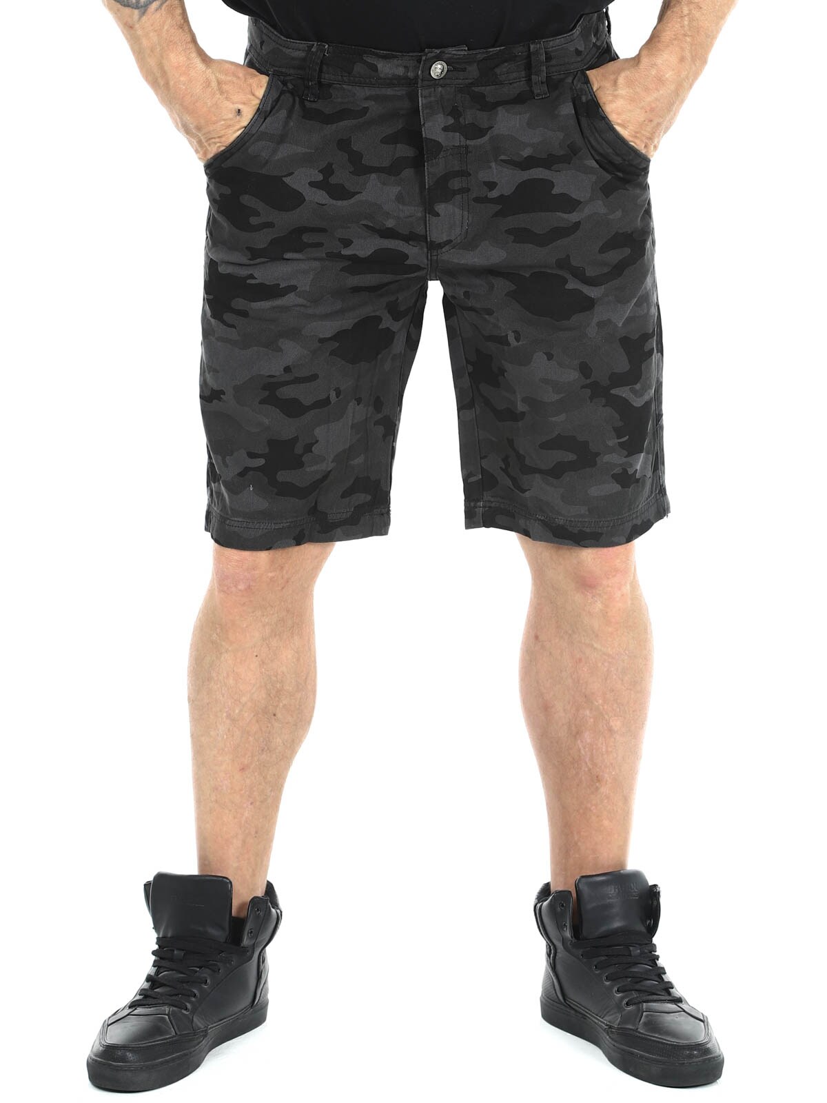 Maastokuviolliset farkkushortsit. Niissä on neljä taskua ja vyölenkit vyötäröllä. Hopeanväriset napit pääkallokuviolla antavat ekstra-asennetta.