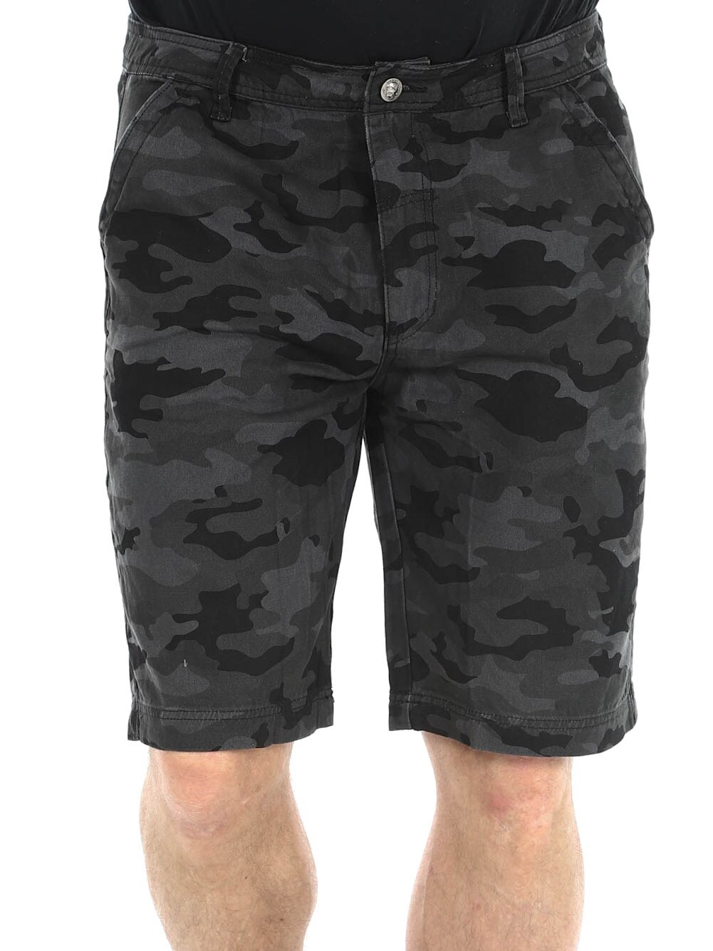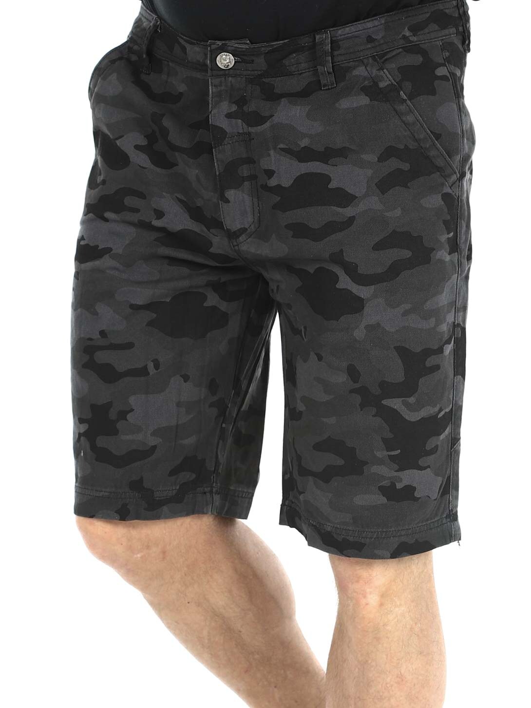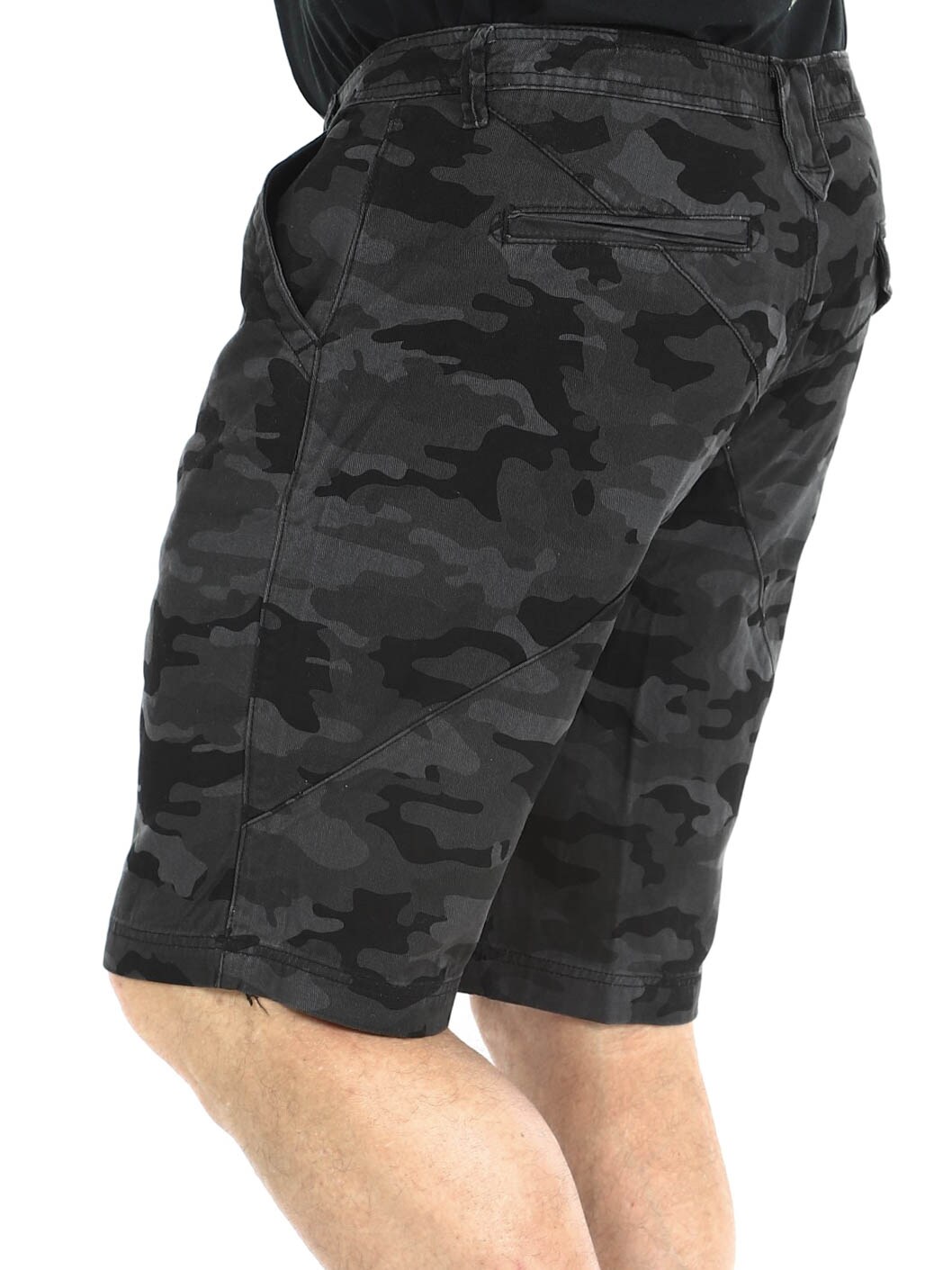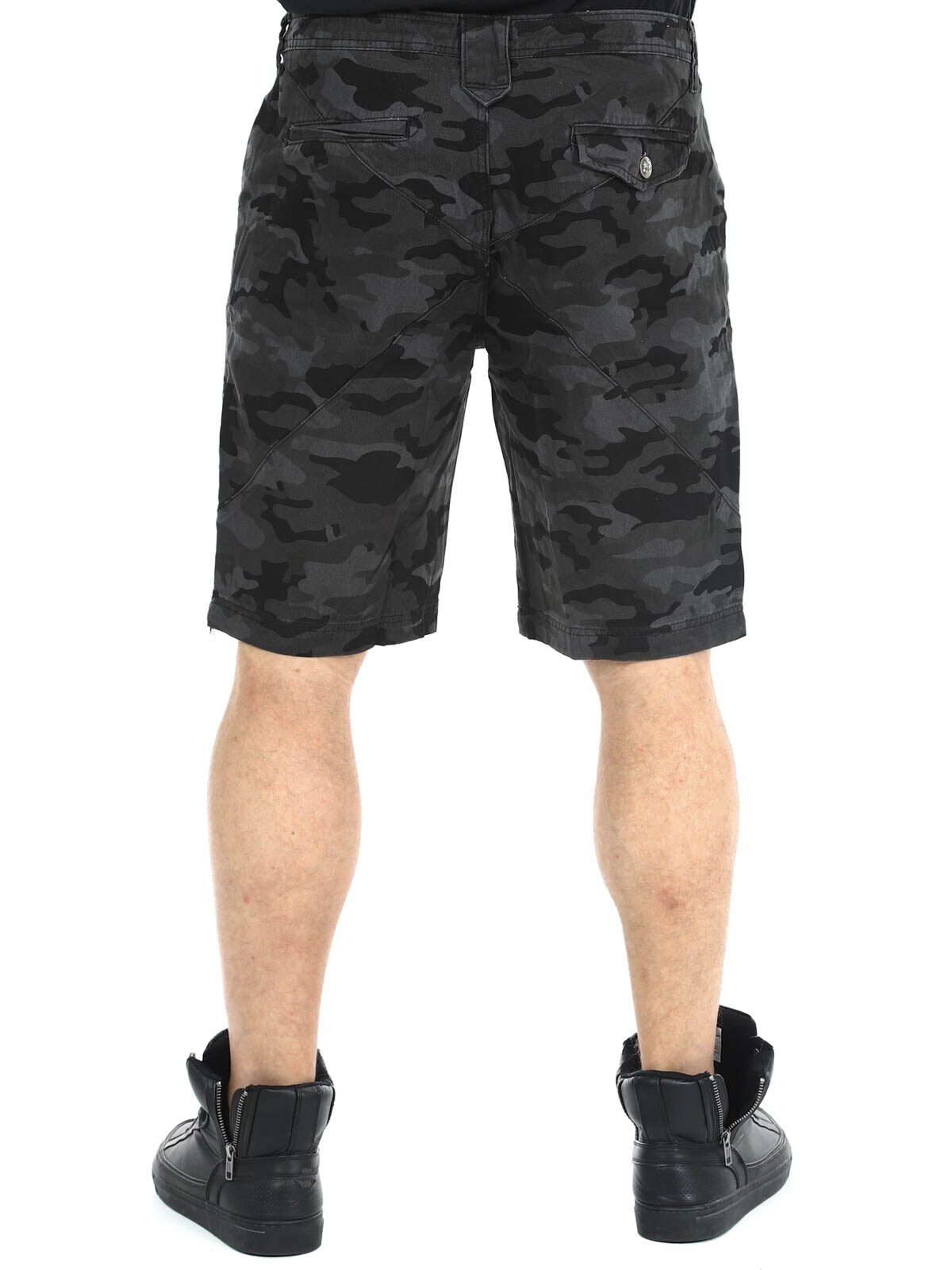 Maastokuviolliset farkkushortsit. Niissä on neljä taskua ja vyölenkit vyötäröllä. Hopeanväriset napit pääkallokuviolla antavat ekstra-asennetta.