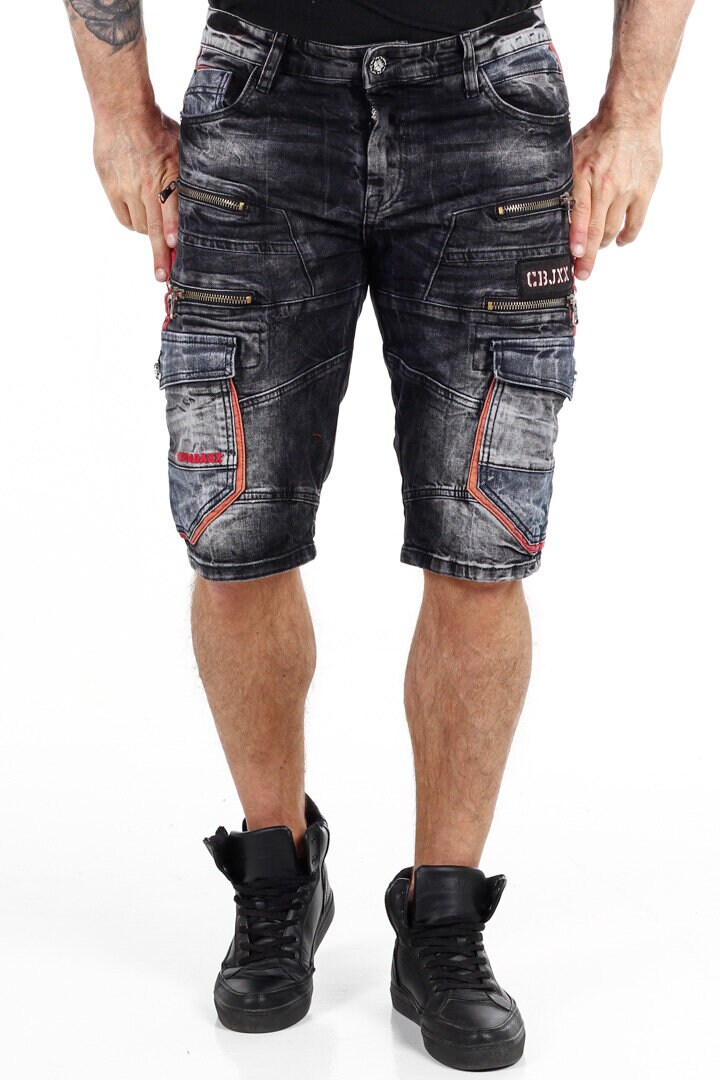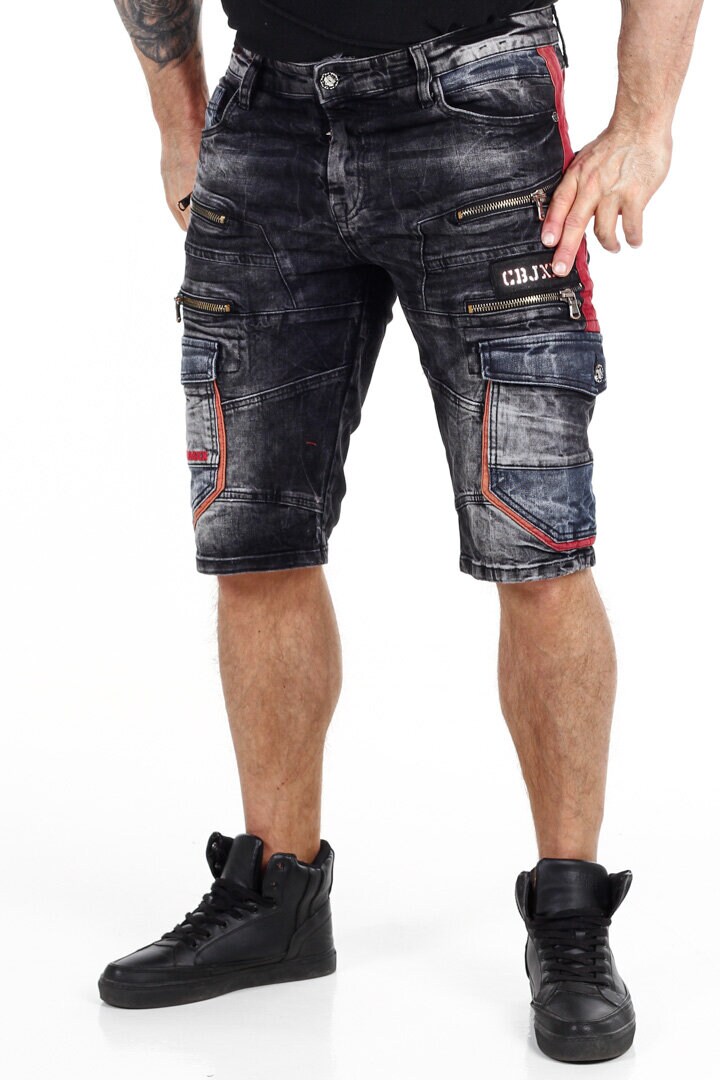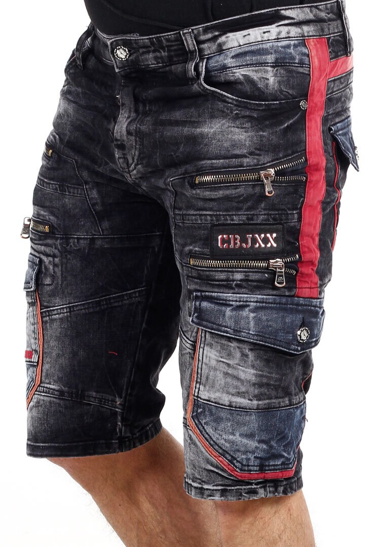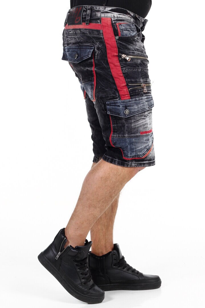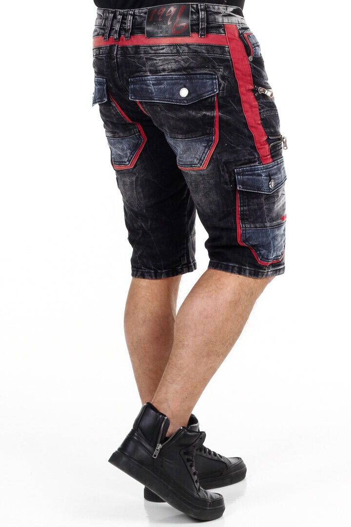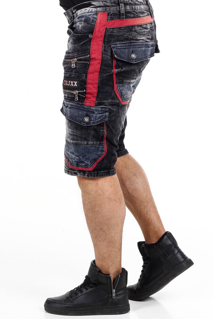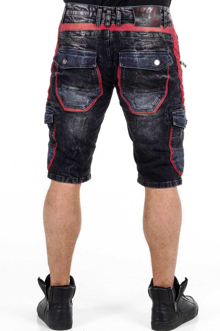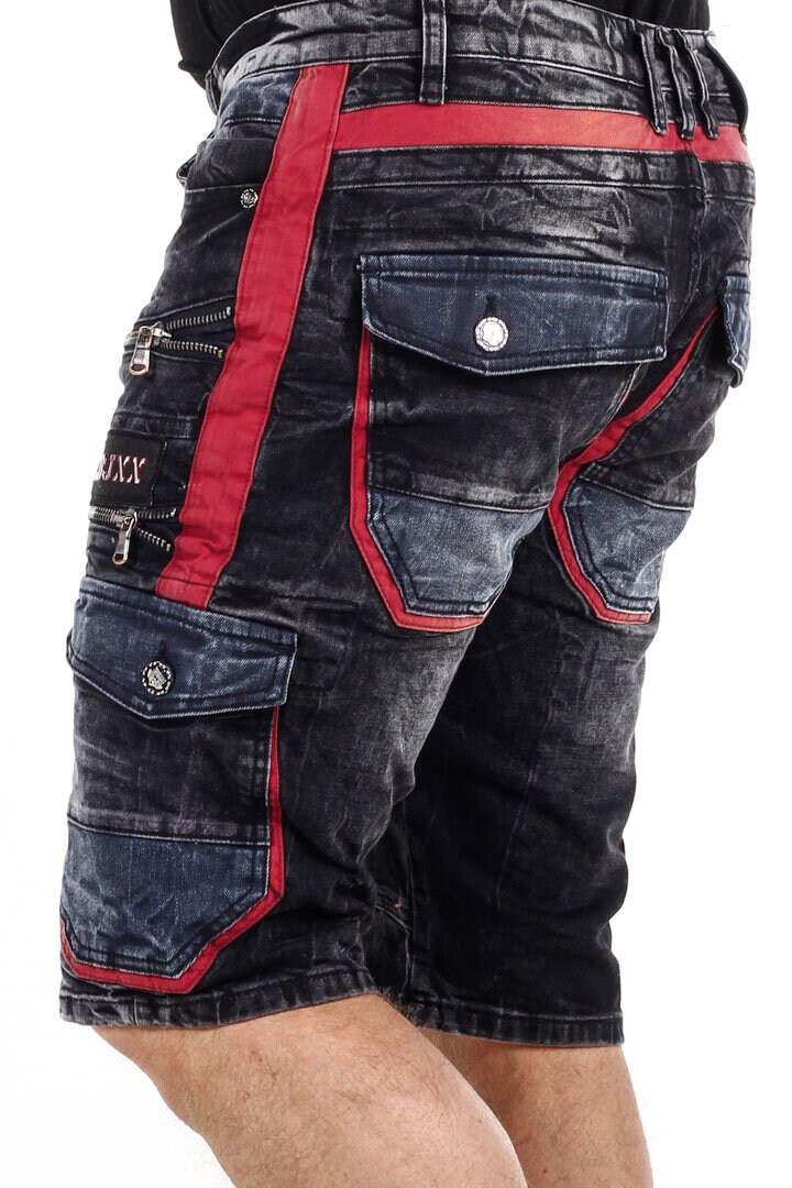 Joustavat farkkushortsit mustassa pesukulutetussa sävyssä punaisilla tehosteilla ja rouheilla vetoketjuilla. Cargotaskut sivuilla ja suljettavat taskut takana sekä kolme avonaista etutaskua. Suuri musta keinonahkainen logomerkki vyötärön takaosassa.
