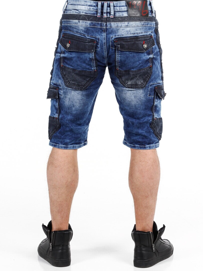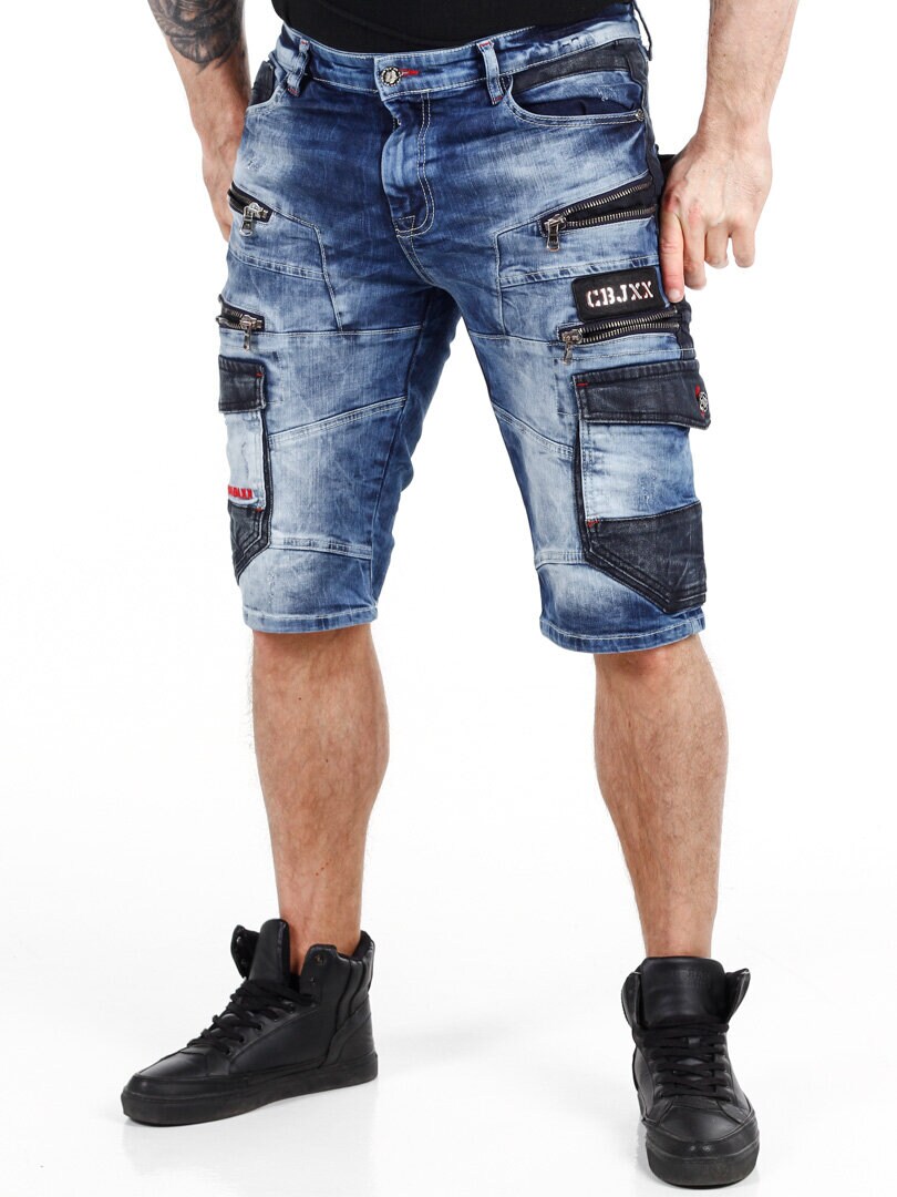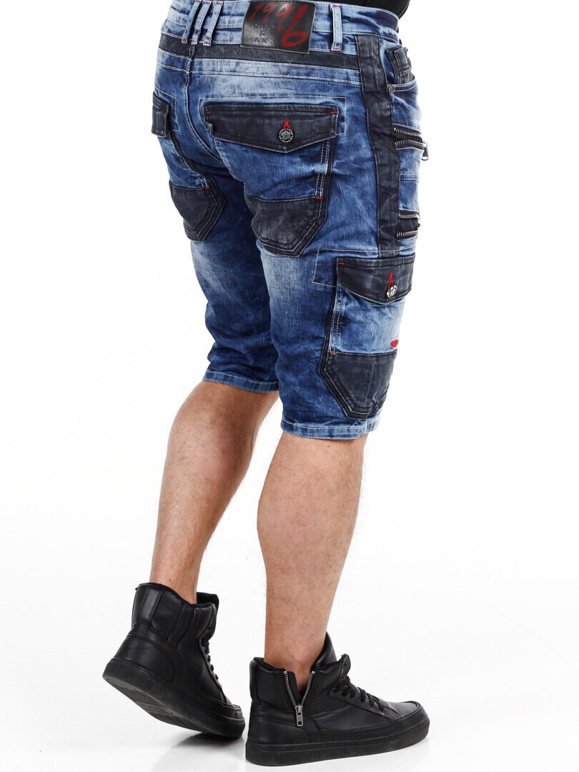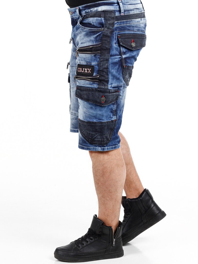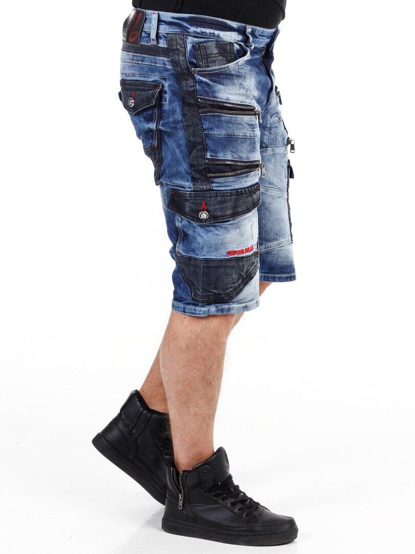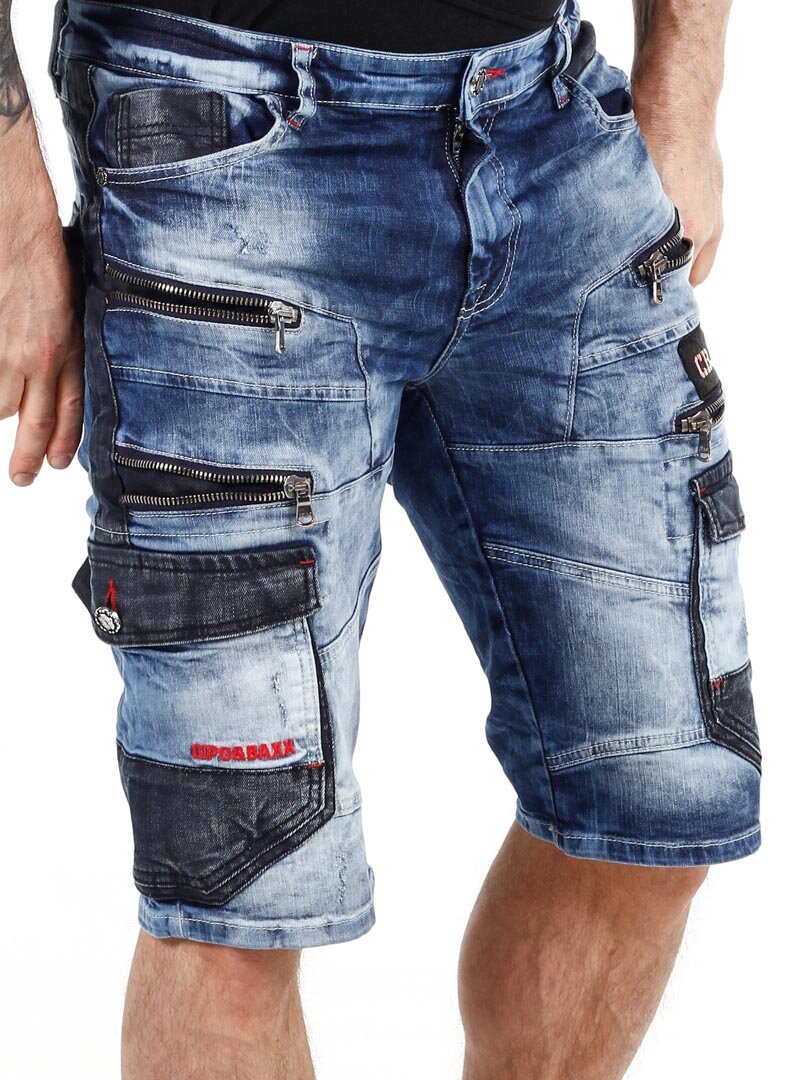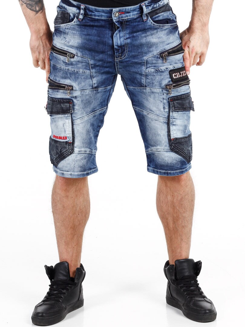 Mustasiniset farkkushortsit tyylikkäillä kulutetuilla osioilla. Koristeena vetoketjuja ja merkki. Kolme avonaista taskua lantiolla, kaksi napitettavaa takataskua ja kaksi napitettavaa reisitaskua.
