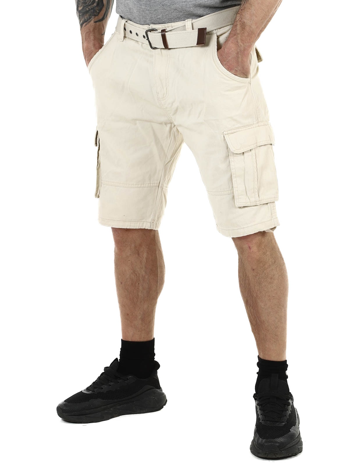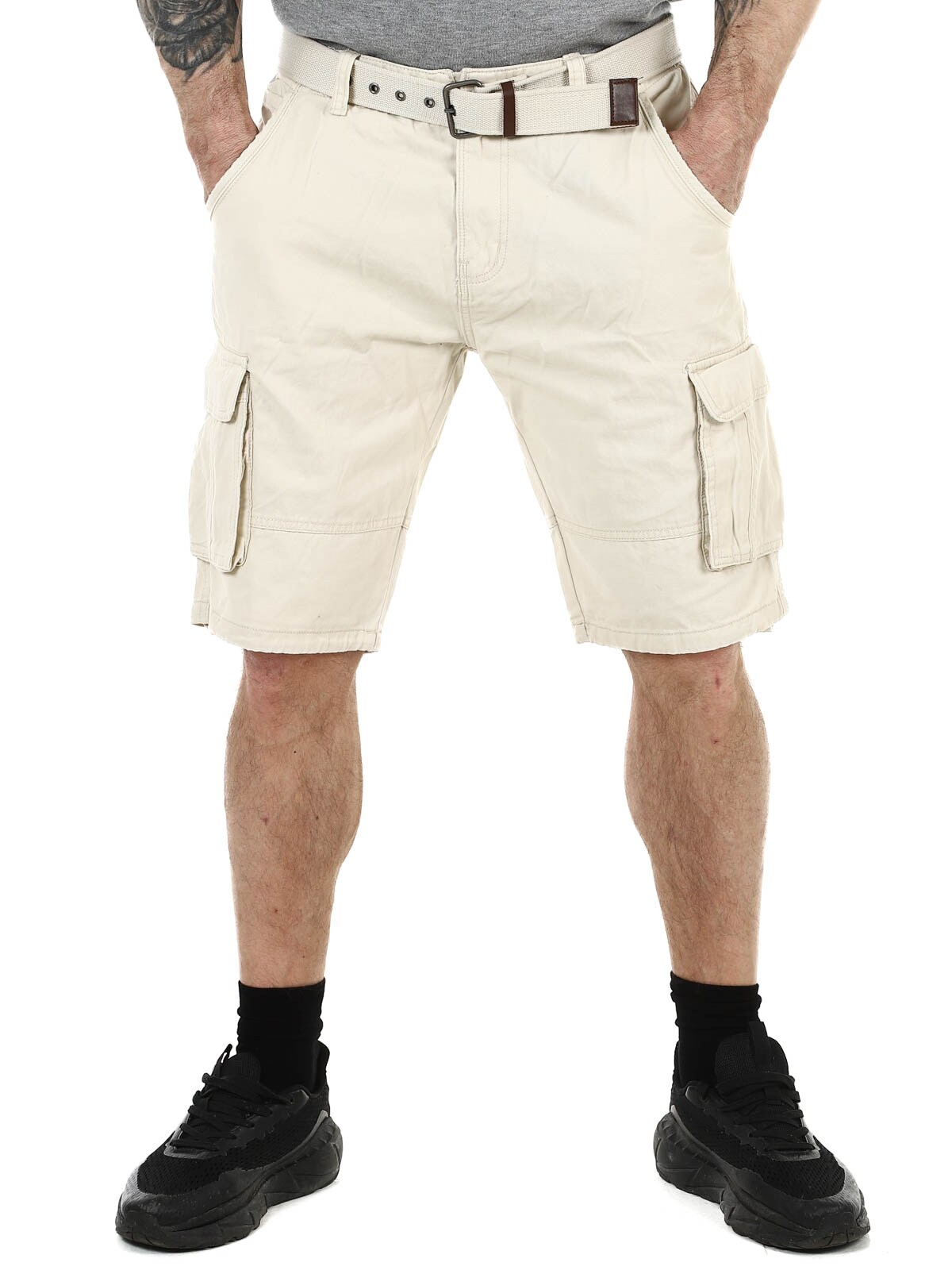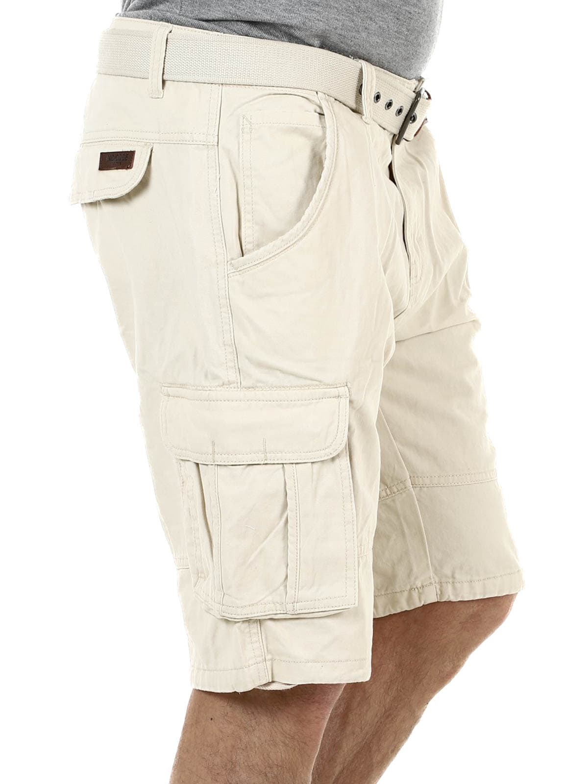 Tyylikkäät shortsit kestävästä puuvillasta. Runsaasti taskuja, joista monet ovat suljettavia. Keskipitkä malli ja mukana tuleva vyö.
