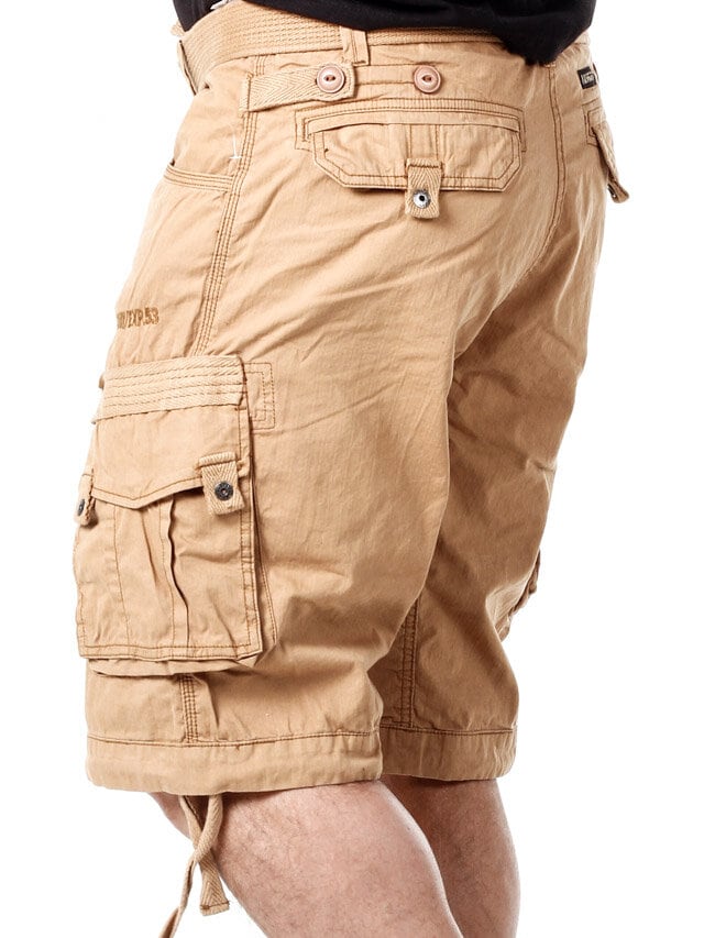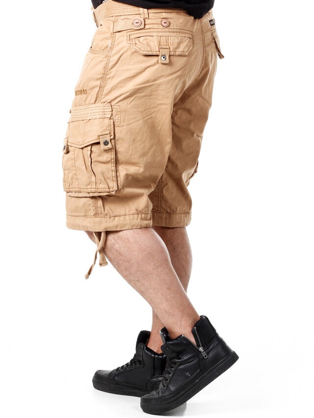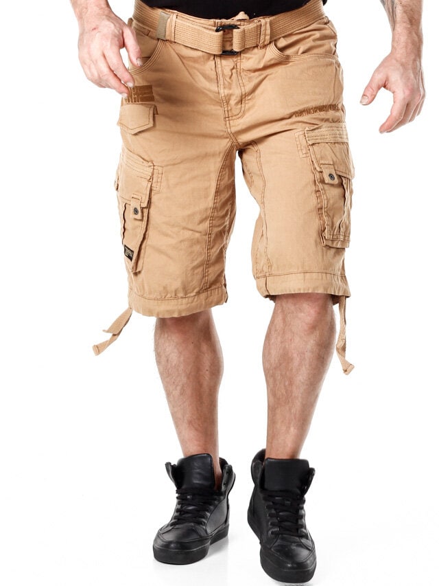 Tyylikkäät shortsit karkeammasta puuvillalaadusta. Käytännöllinen suunnittelu, johon kuuluu useita taskuja ja säädettävät nauhat vyötäröllä ja lahkeensuissa. Irrotettava vyö vyötäröllä.