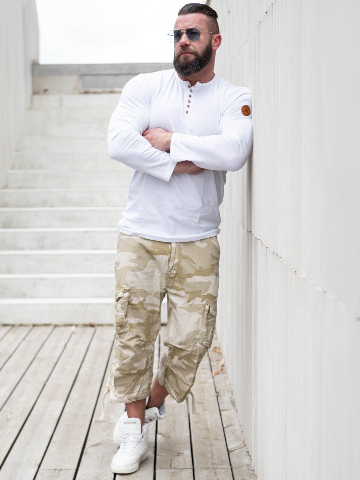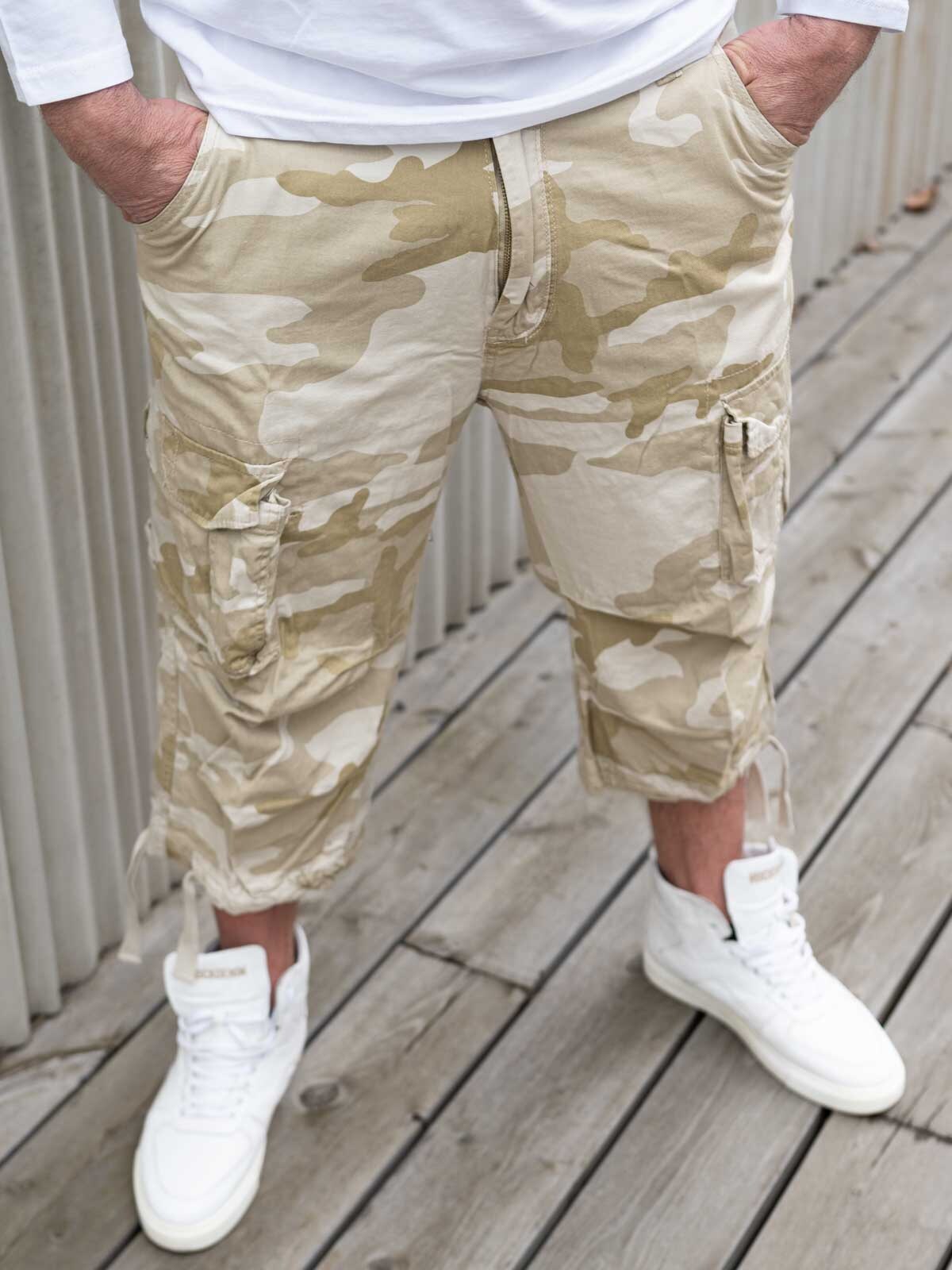 3/4 housut baggy-mallissa. Kaksi etutaskua ja kaksi takataskua neppareilla sekä kaksi suurta sivutaskua. Lahkeensuissa kiristysnauhat, joilla voi säätää leveyttä.