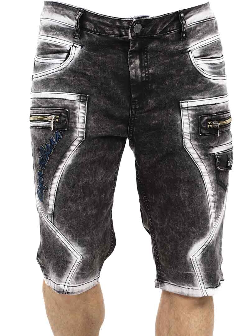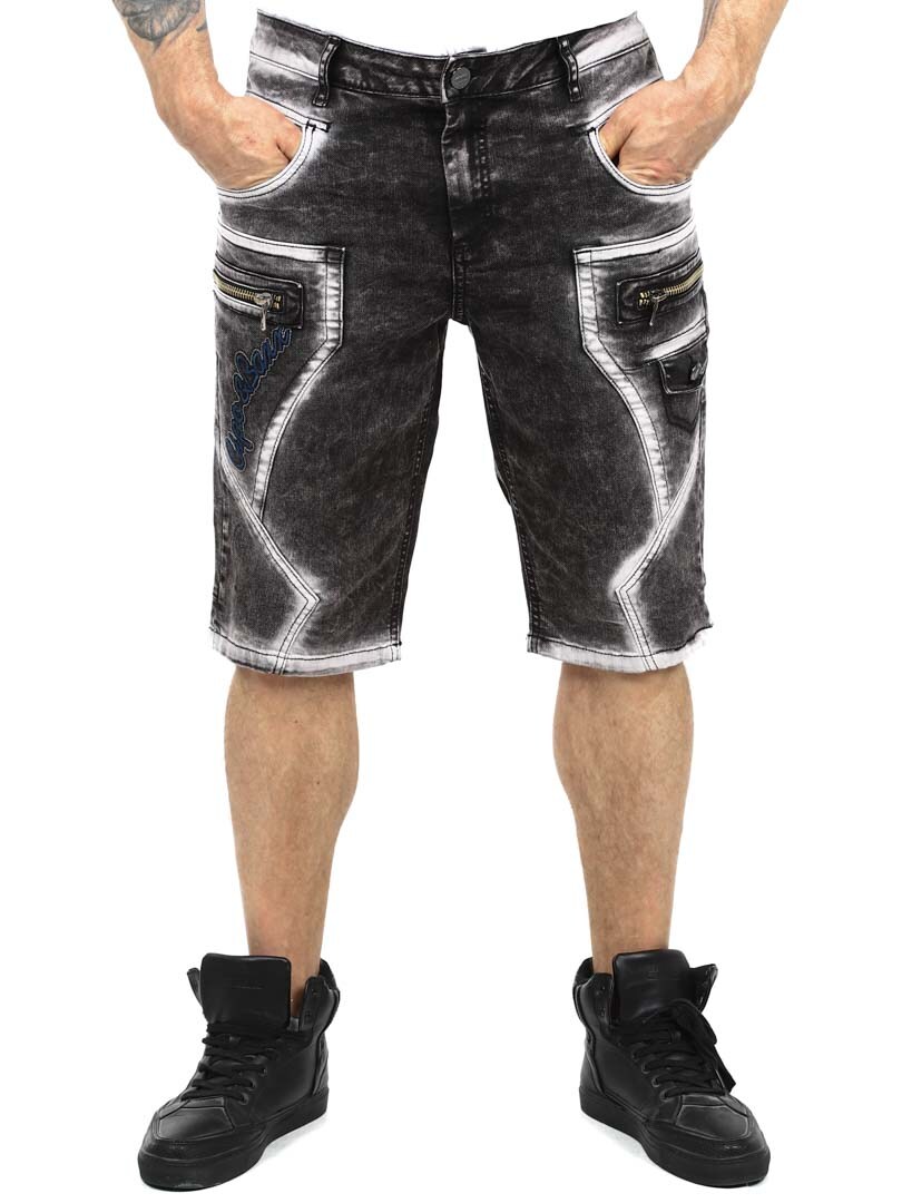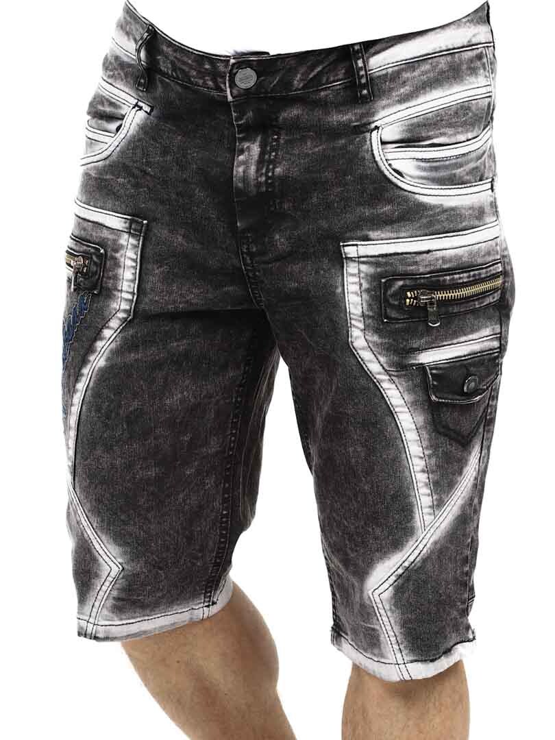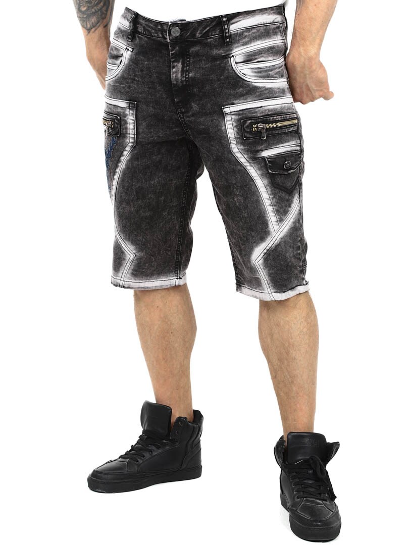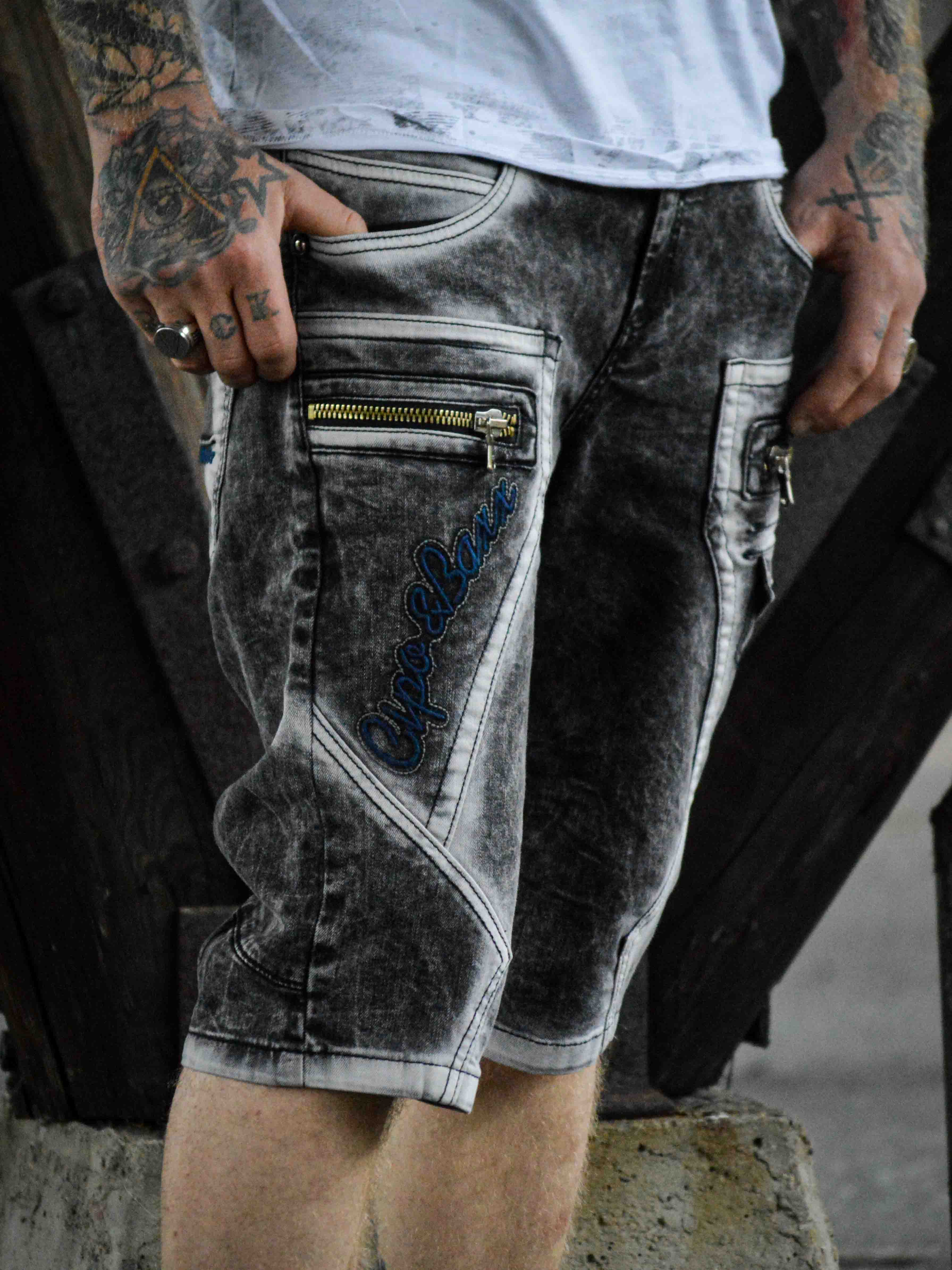 Päivitä streetwear-tyyliäsi näillä ainutlaatuisilla shortseilla. Valmistettu kestävästä farkkukankaasta, jossa on voimakas pesukulutus antamassa päheää ilmettä. Housuissa on useita toiminnallisia taskuja, kirjailtu logo ja rouheat ompeleet lisäämässä särmikkyyttä. Vetoketjut edessä eivät ole toiminnallisia vaan ainoastaan koristeena.