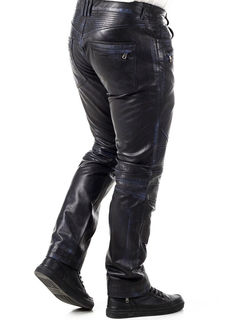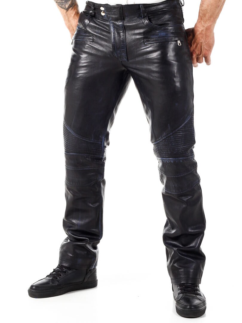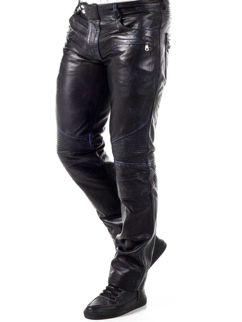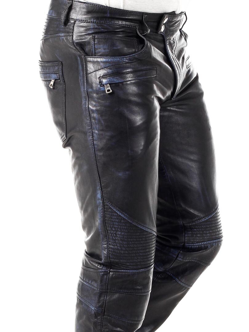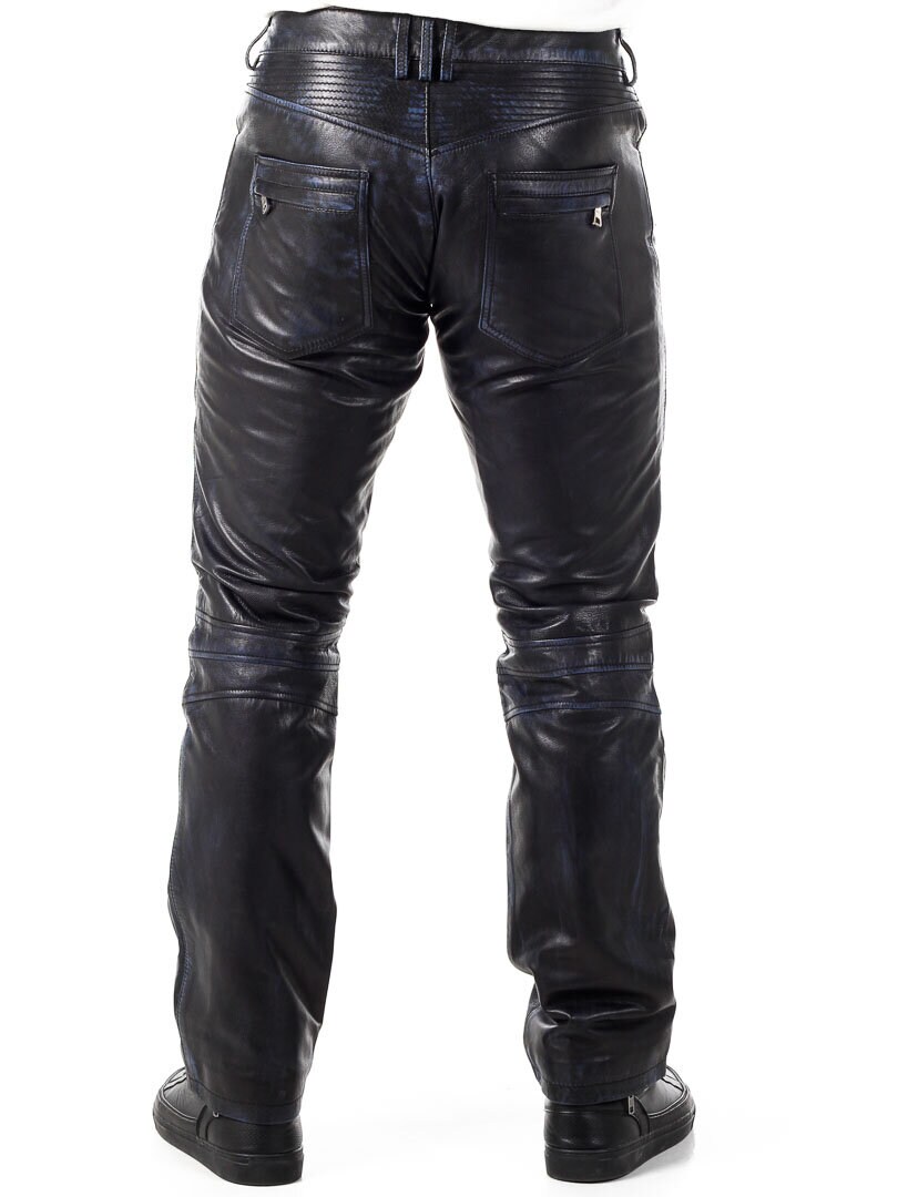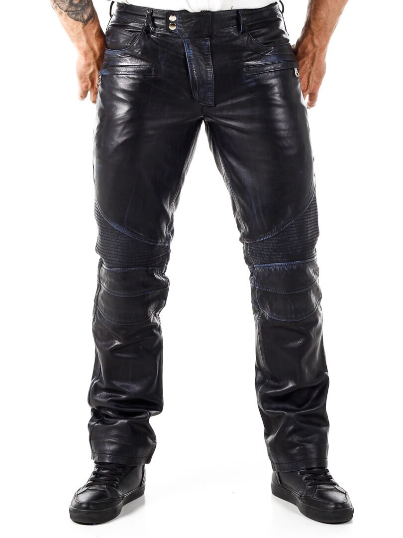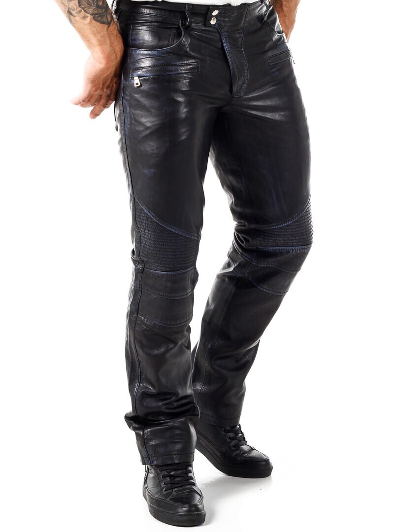 Mustat nahkahousut sinisellä sisävuorella. Useita taskuja, joista osa on avonaisia ja osa suljettavia. Bikerhenkinen suunnittelu ja klassinen malli. Valmistettu pehmeästä nahasta. Saatavilla vain RockDenimiltä!