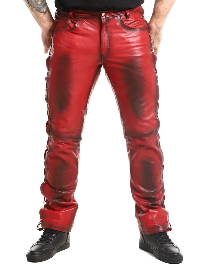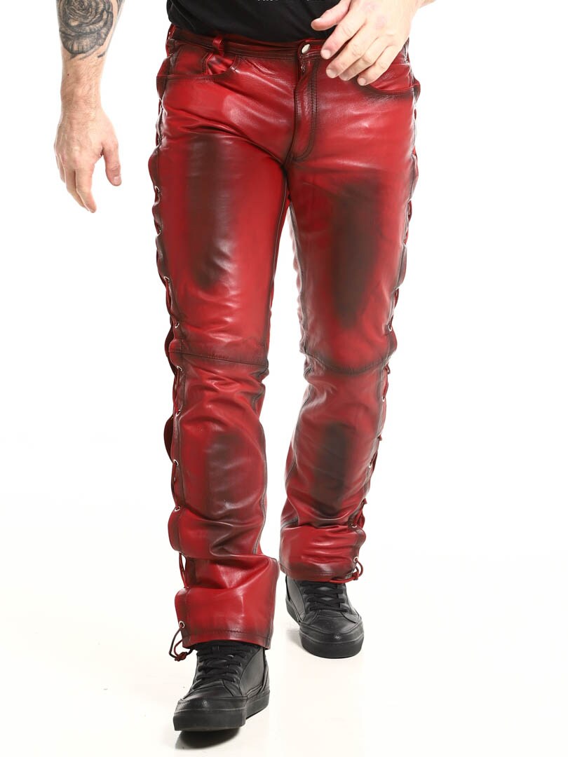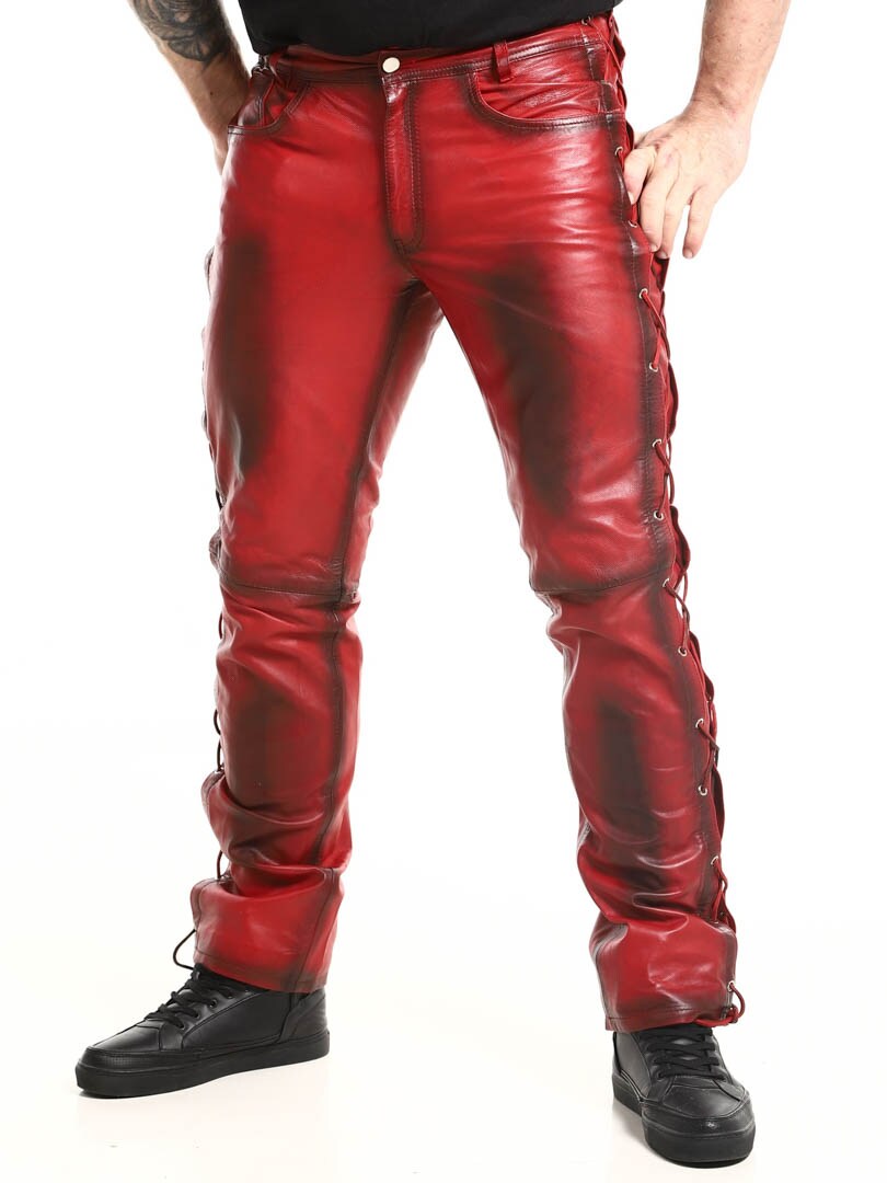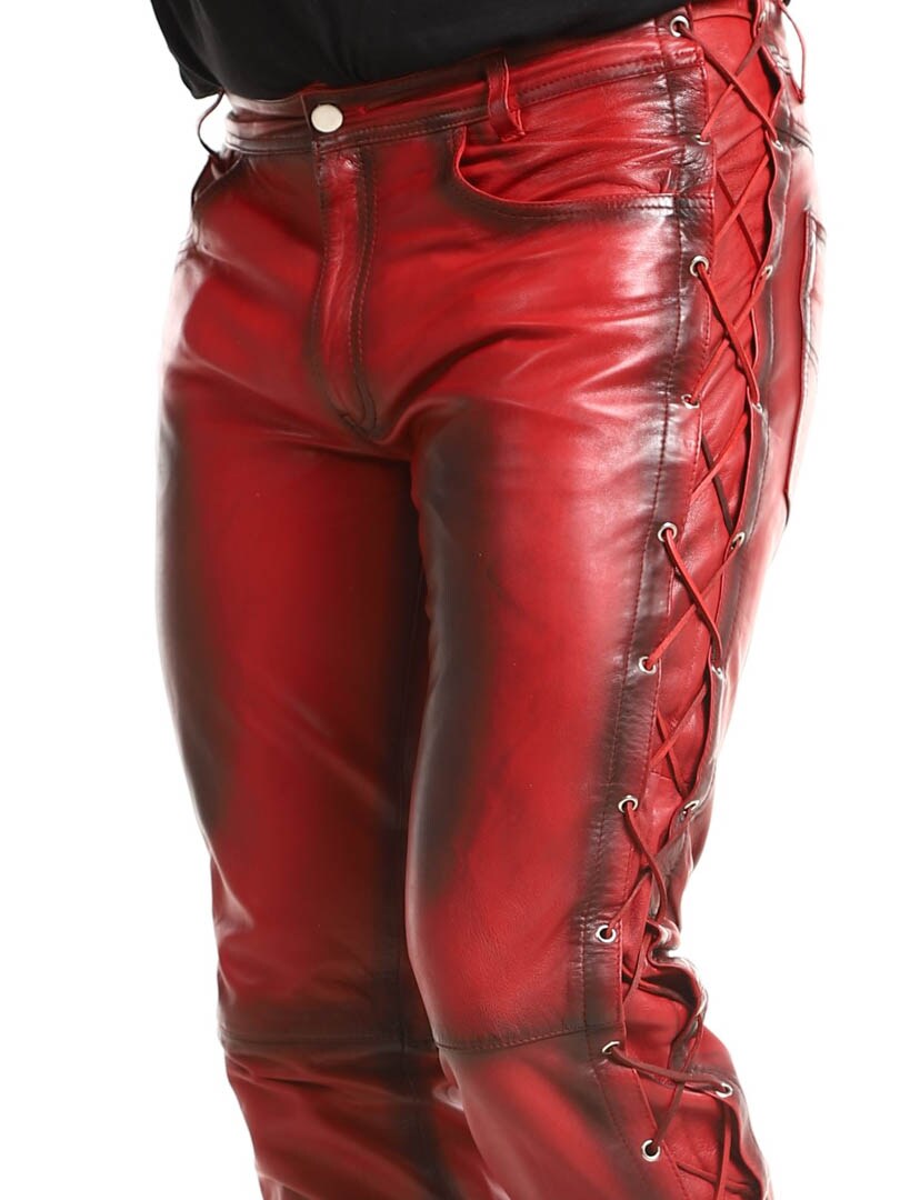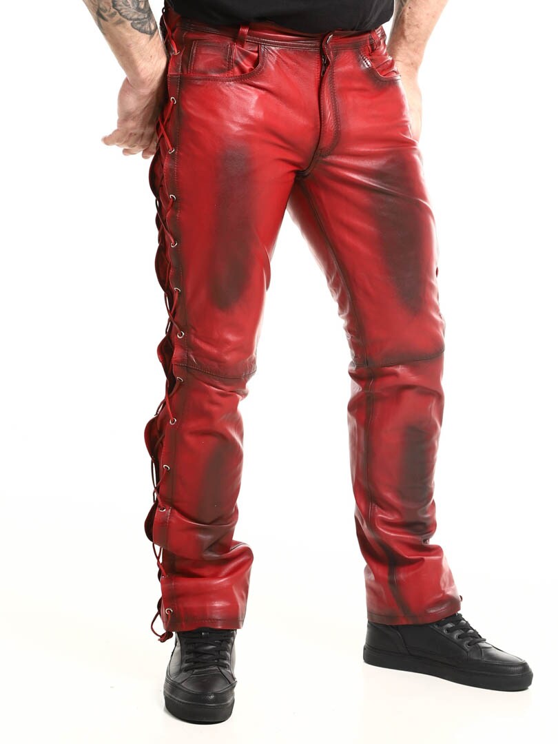 Aidosta nahasta valmistetut housut ohuella vuorella. Sivuilla nauhat, joiden avulla voi säätää leveyttä. Kolme etutaskua, kaksi takataskua ja lenkit vyötäröllä. Suljetaan vetoketjulla ja metallinapilla.
