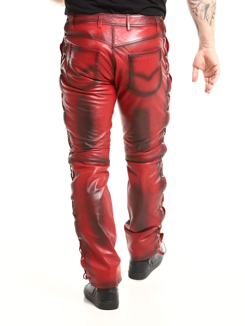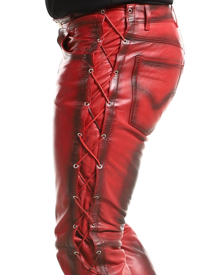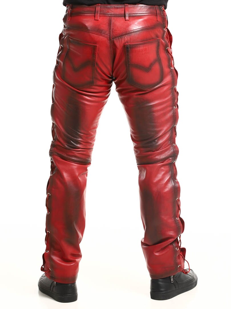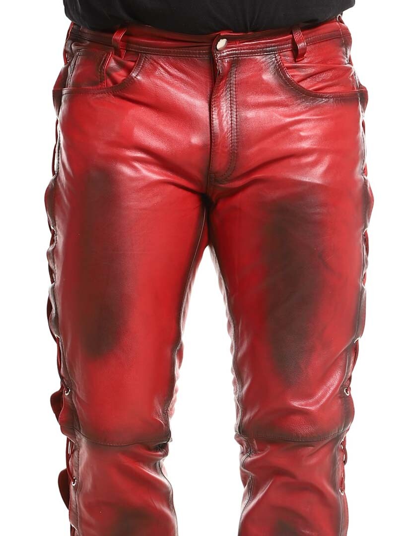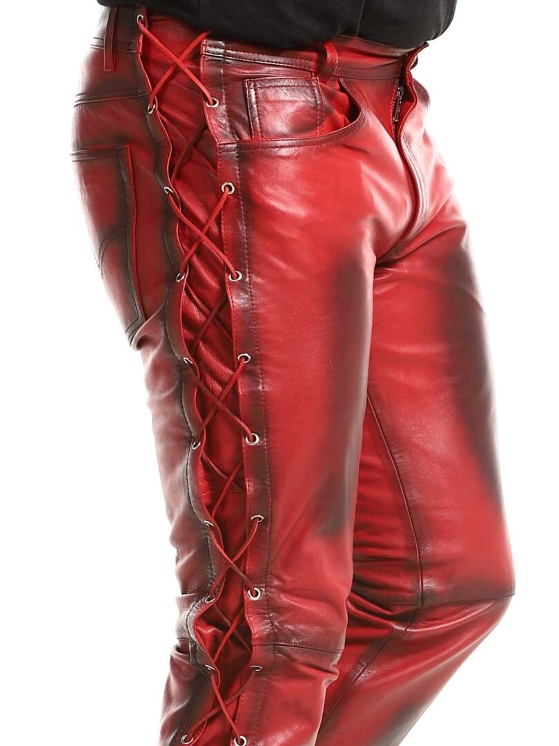 Aidosta nahasta valmistetut housut ohuella vuorella. Sivuilla nauhat, joiden avulla voi säätää leveyttä. Kolme etutaskua, kaksi takataskua ja lenkit vyötäröllä. Suljetaan vetoketjulla ja metallinapilla.