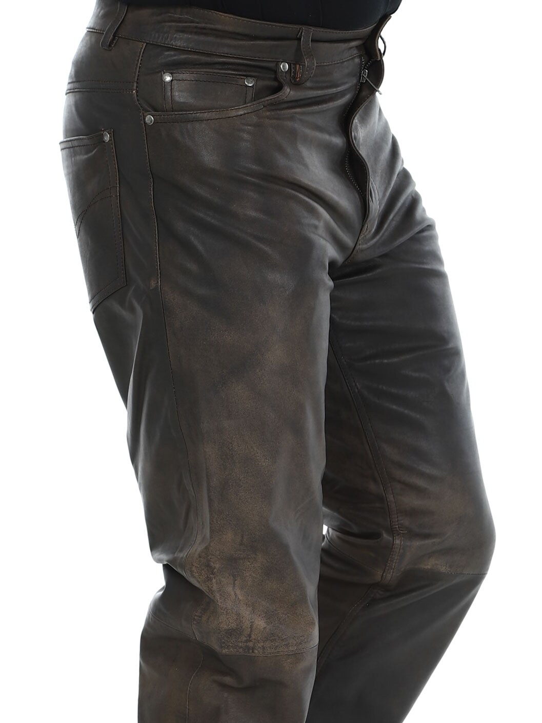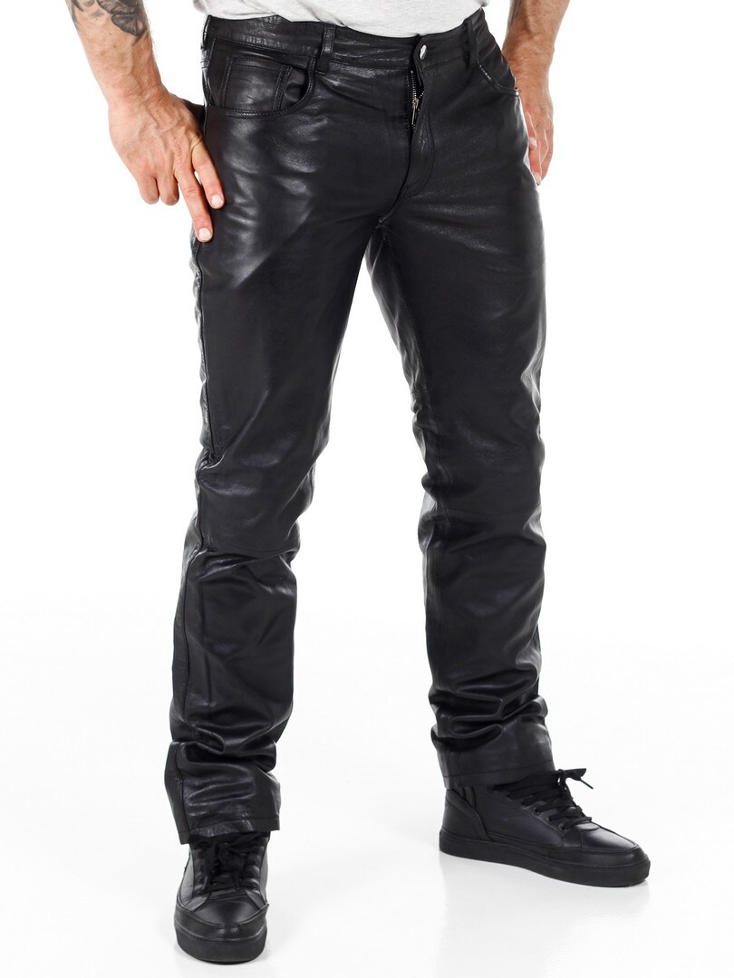 Massasta erottuvat aidot nahkahousut klassisessa viiden taskun mallissa. Nahka tuntuu pehmeältä ja todella mukavalta ihoa vasten. Sisäpuoli on vuorattu polyesterillä. Vetoketju sepaluksessa. Näissä housuissa on asenne kohdillaan!