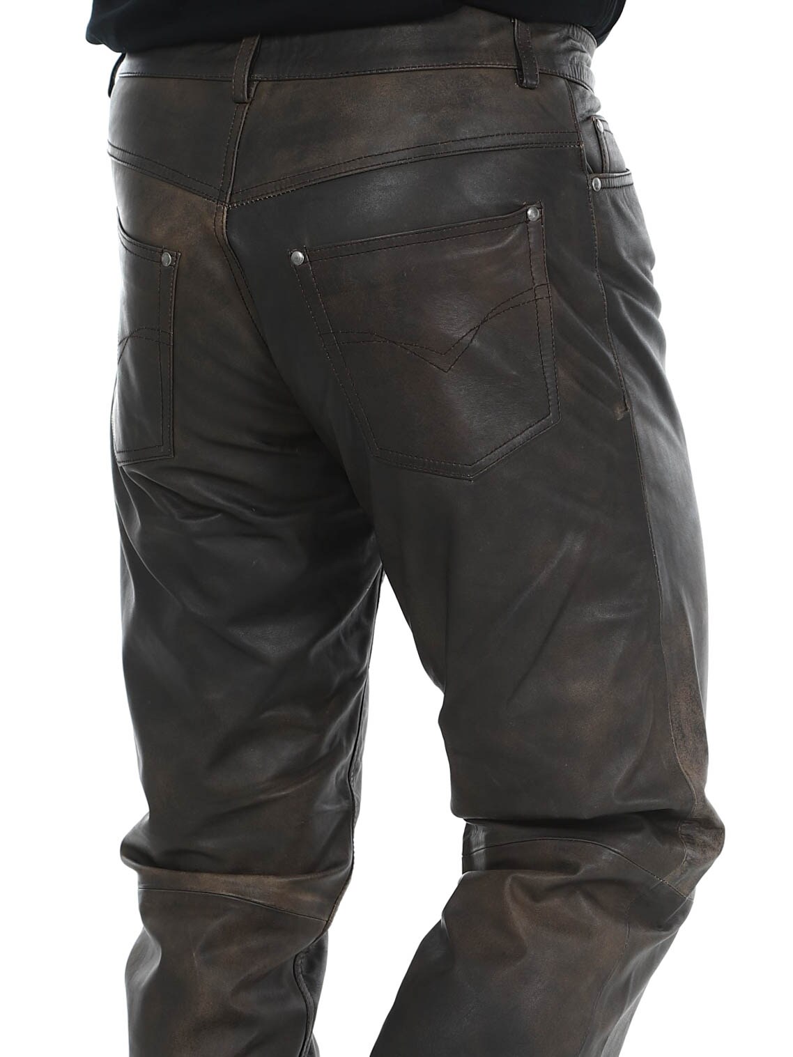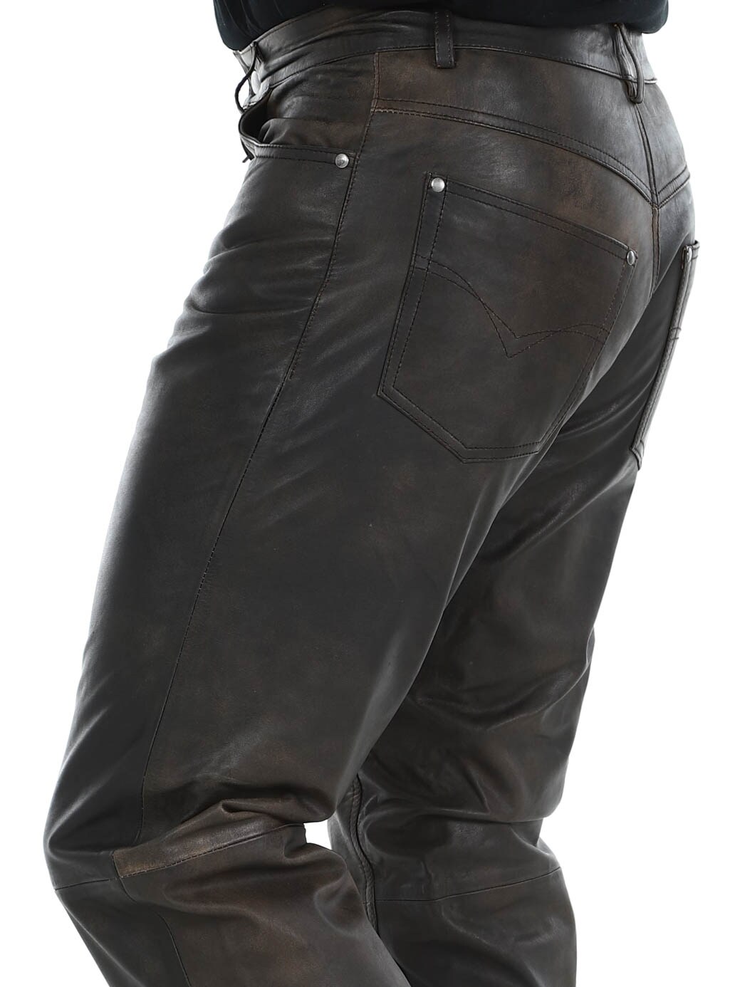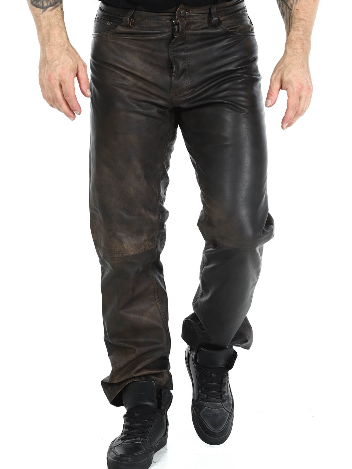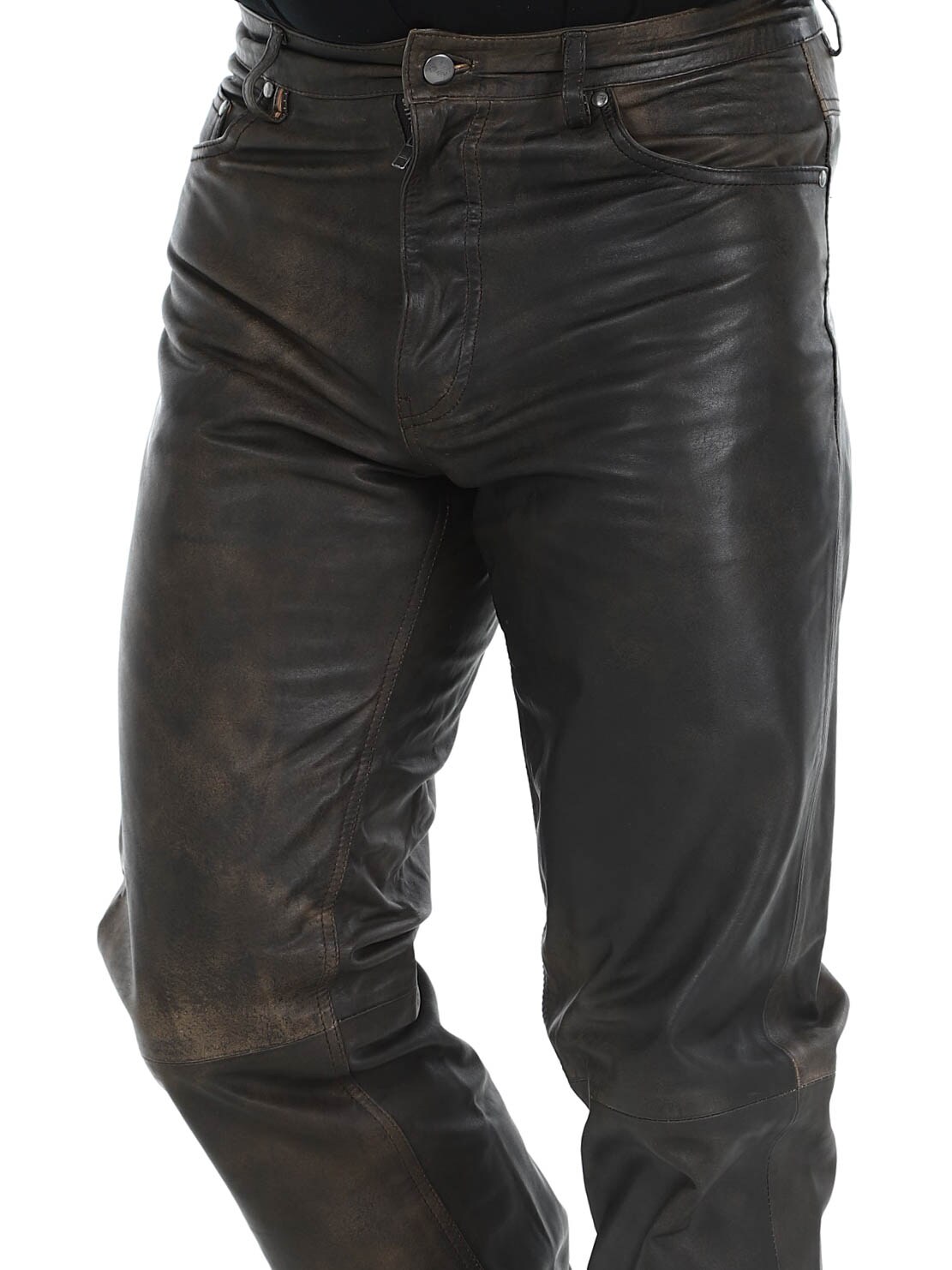 Massasta erottuvat aidot nahkahousut klassisessa viiden taskun mallissa. Nahka tuntuu pehmeältä ja todella mukavalta ihoa vasten. Sisäpuoli on vuorattu polyesterillä. Vetoketju sepaluksessa. Näissä housuissa on asenne kohdillaan!