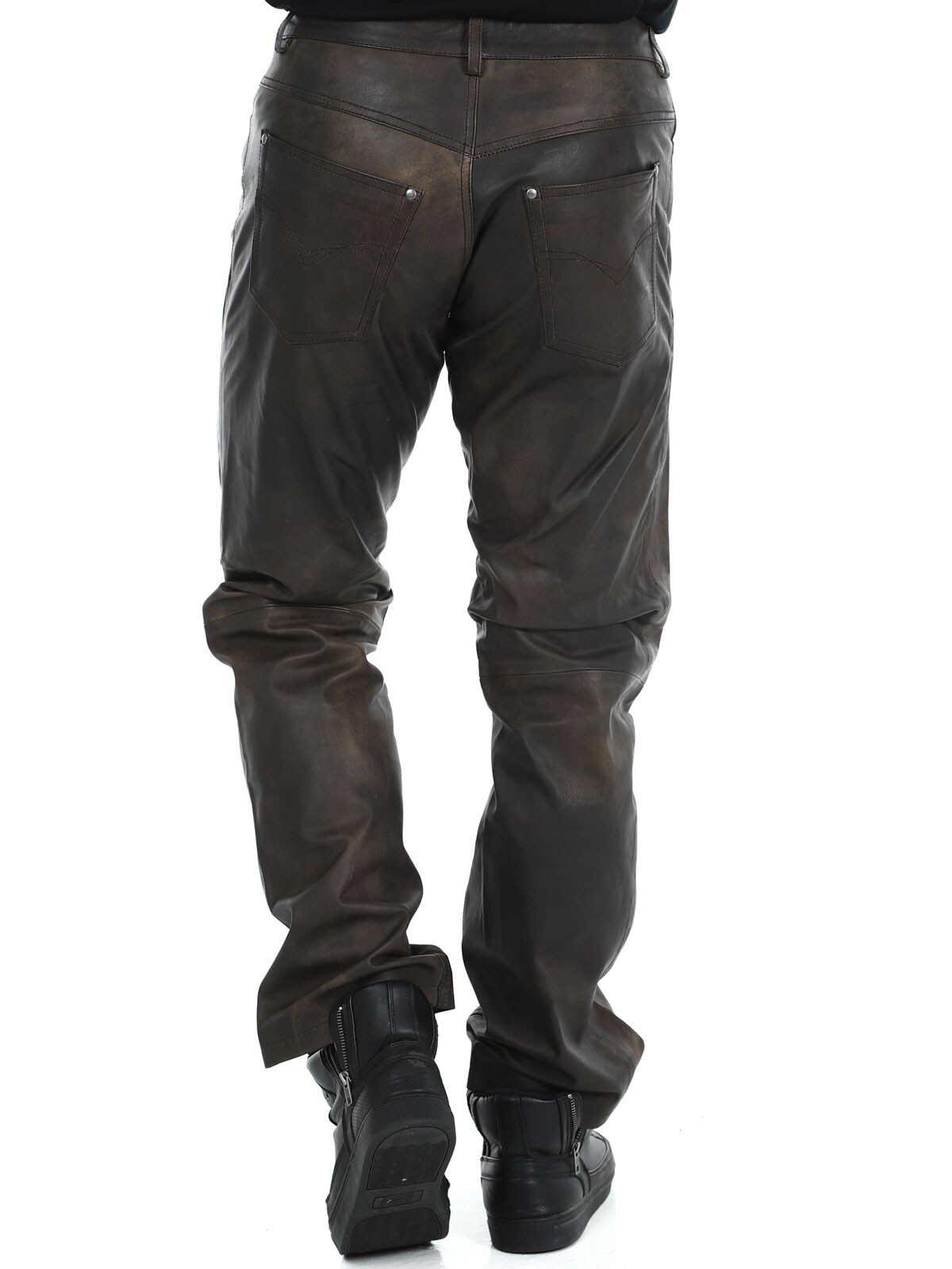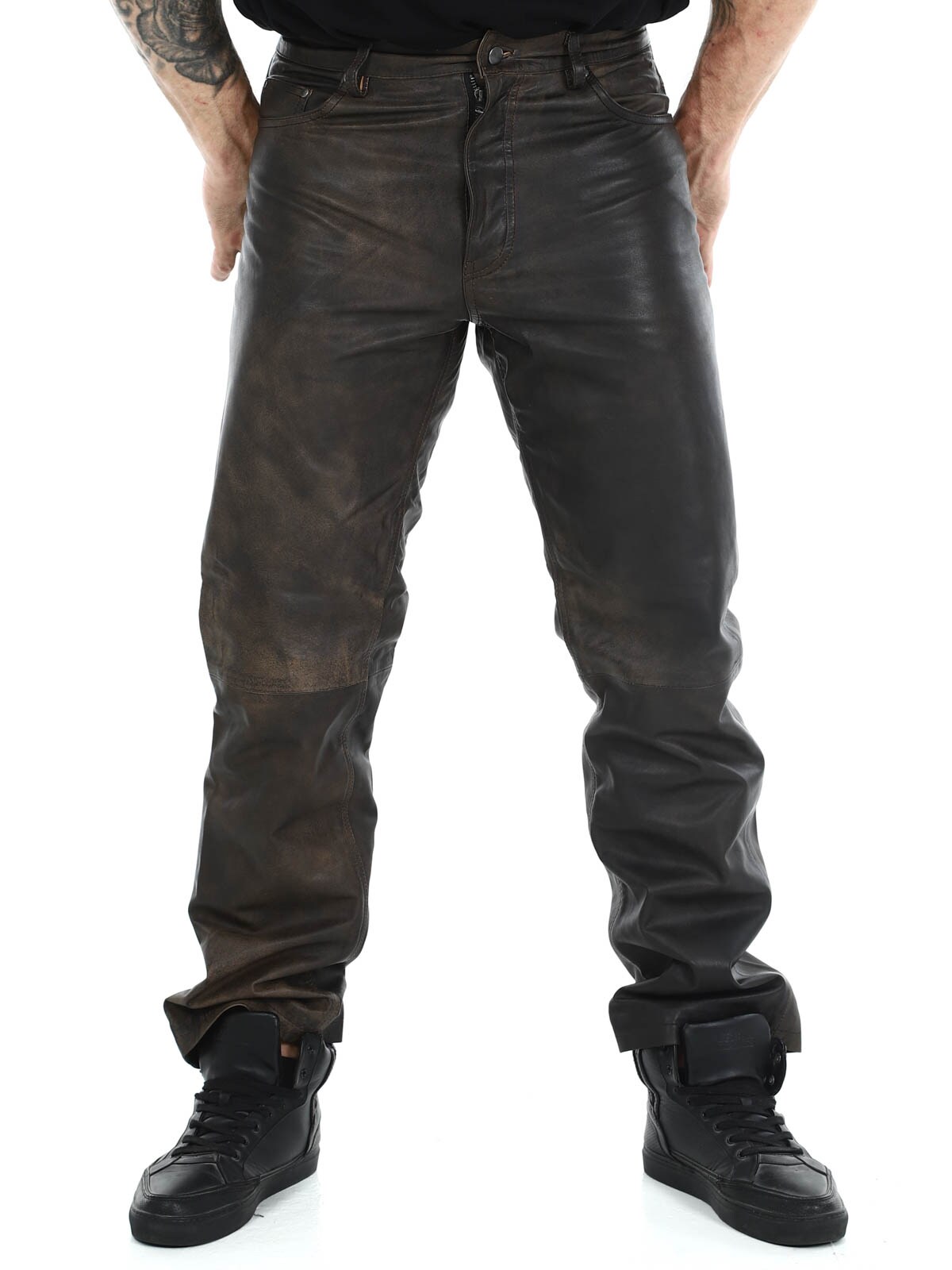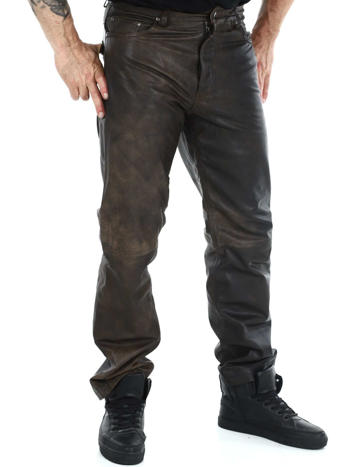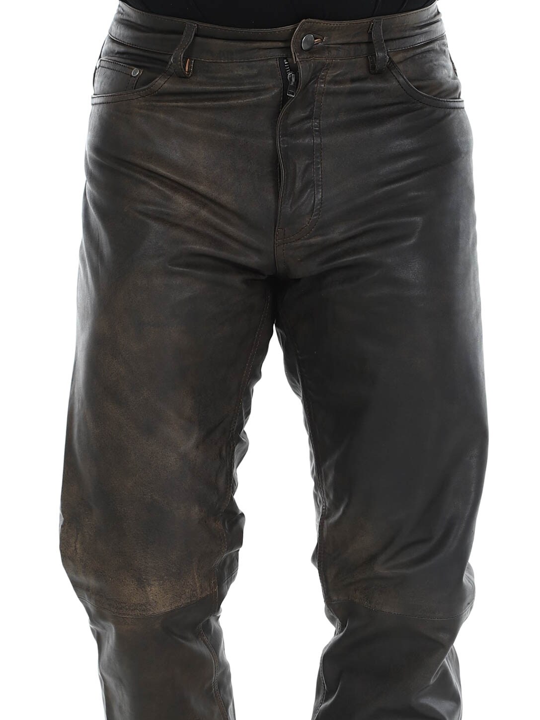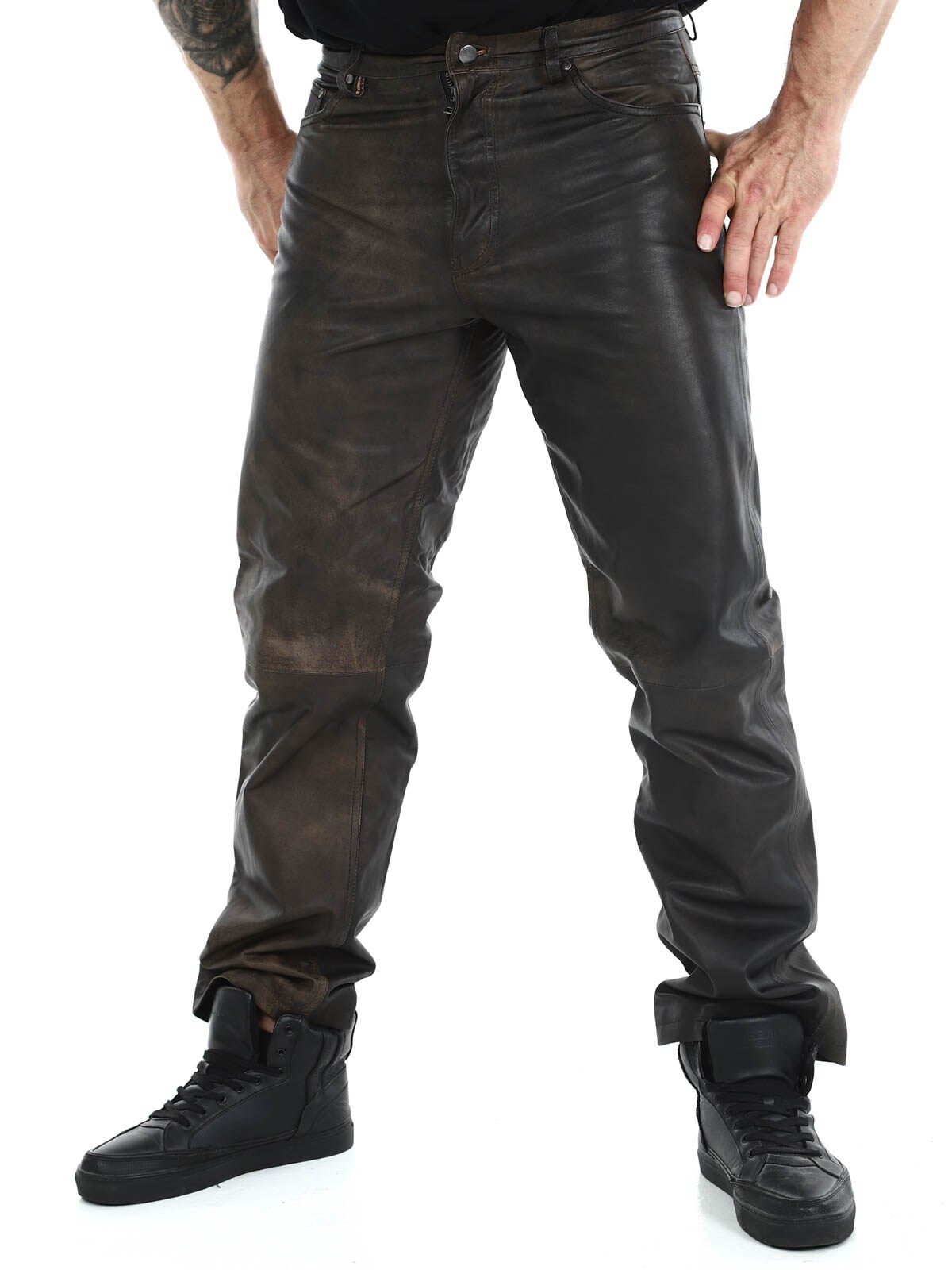 Massasta erottuvat aidot nahkahousut klassisessa viiden taskun mallissa. Nahka tuntuu pehmeältä ja todella mukavalta ihoa vasten. Sisäpuoli on vuorattu polyesterillä. Vetoketju sepaluksessa. Näissä housuissa on asenne kohdillaan!