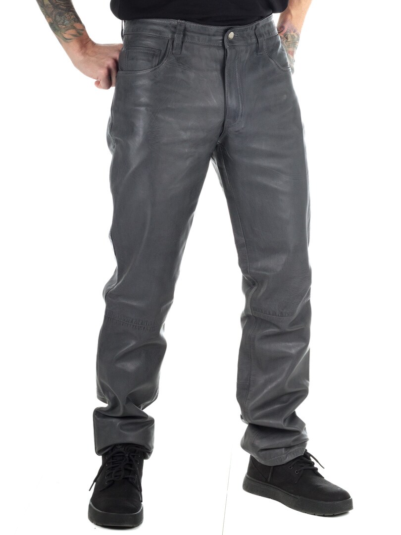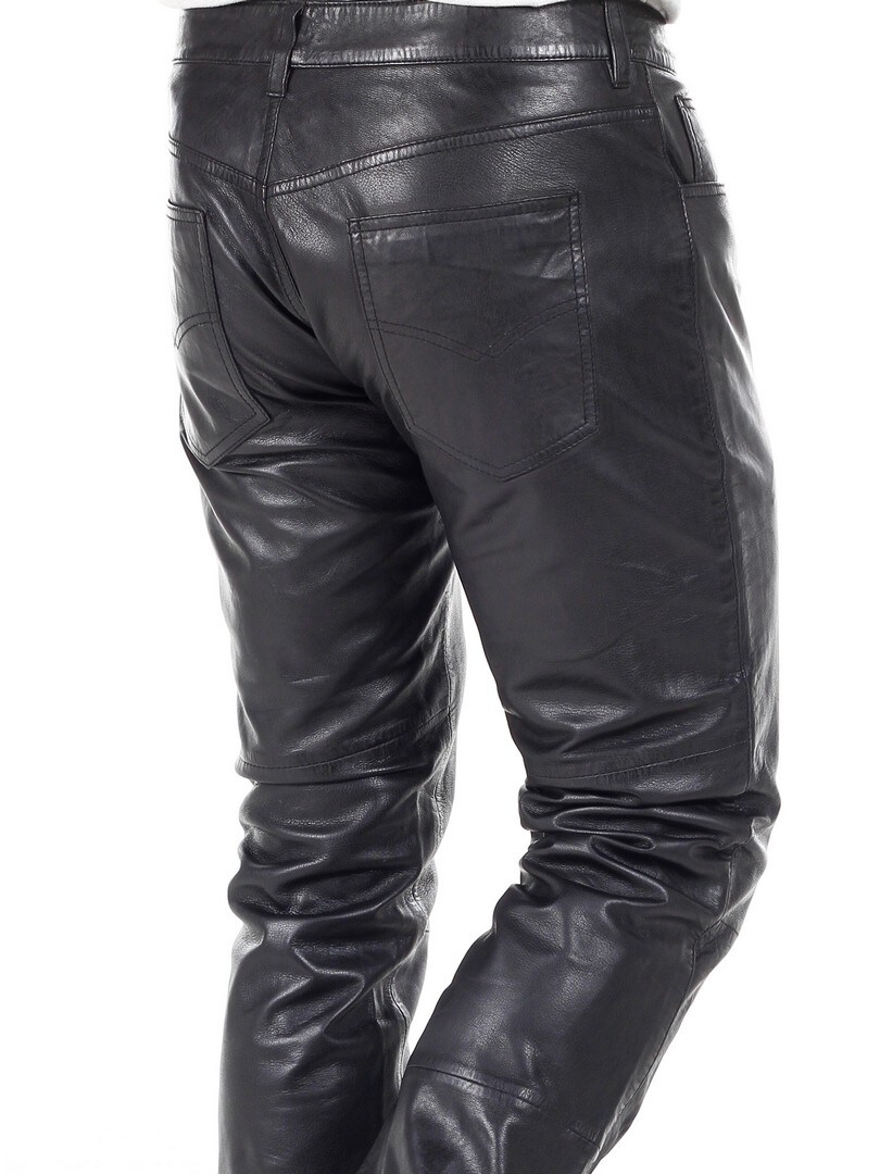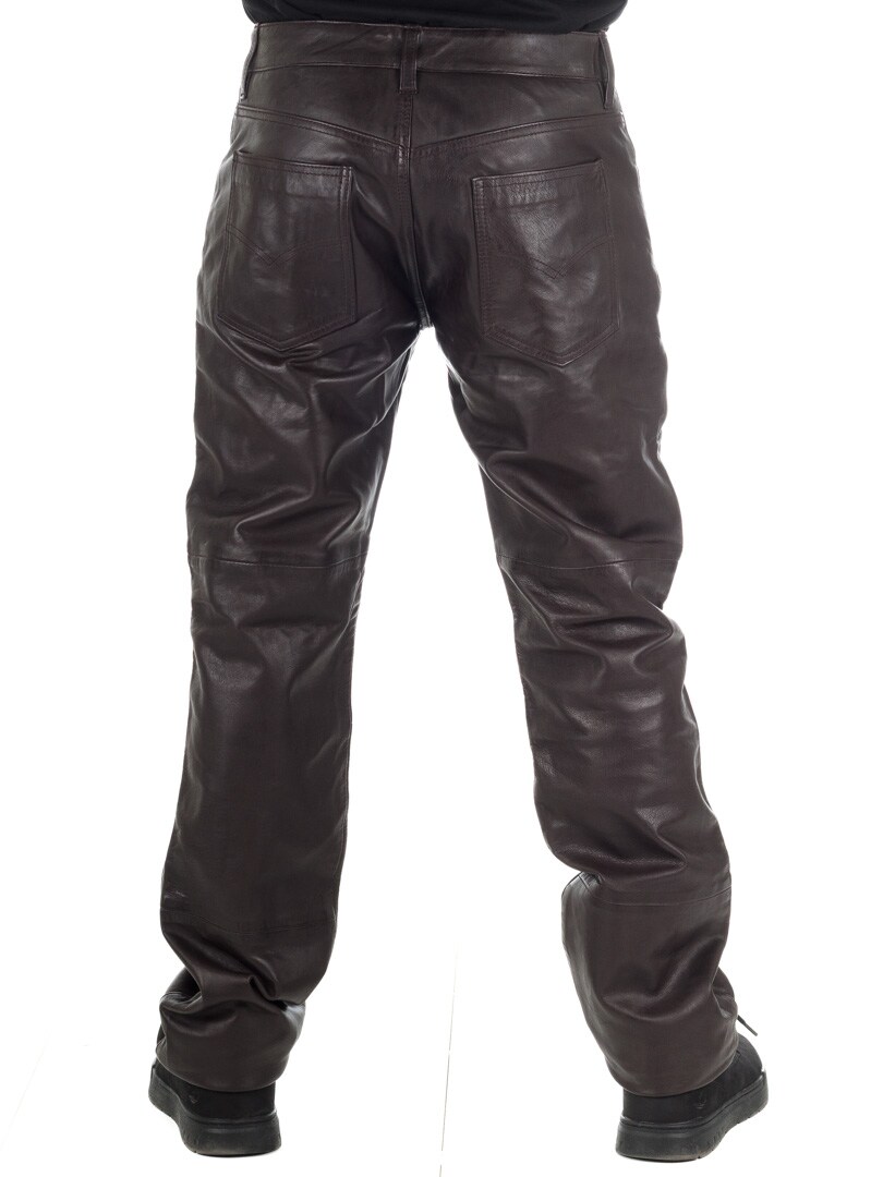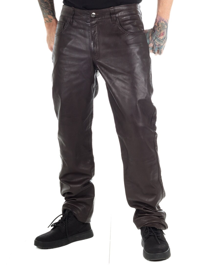 Ruskeat erottuvat aidot nahkahousut klassisessa viiden taskun mallissa. Nahka tuntuu pehmeältä ja todella mukavalta ihoa vasten. Sisäpuoli on vuorattu polyesterillä. Vetoketju sepaluksessa. Näissä housuissa on asenne kohdillaan!