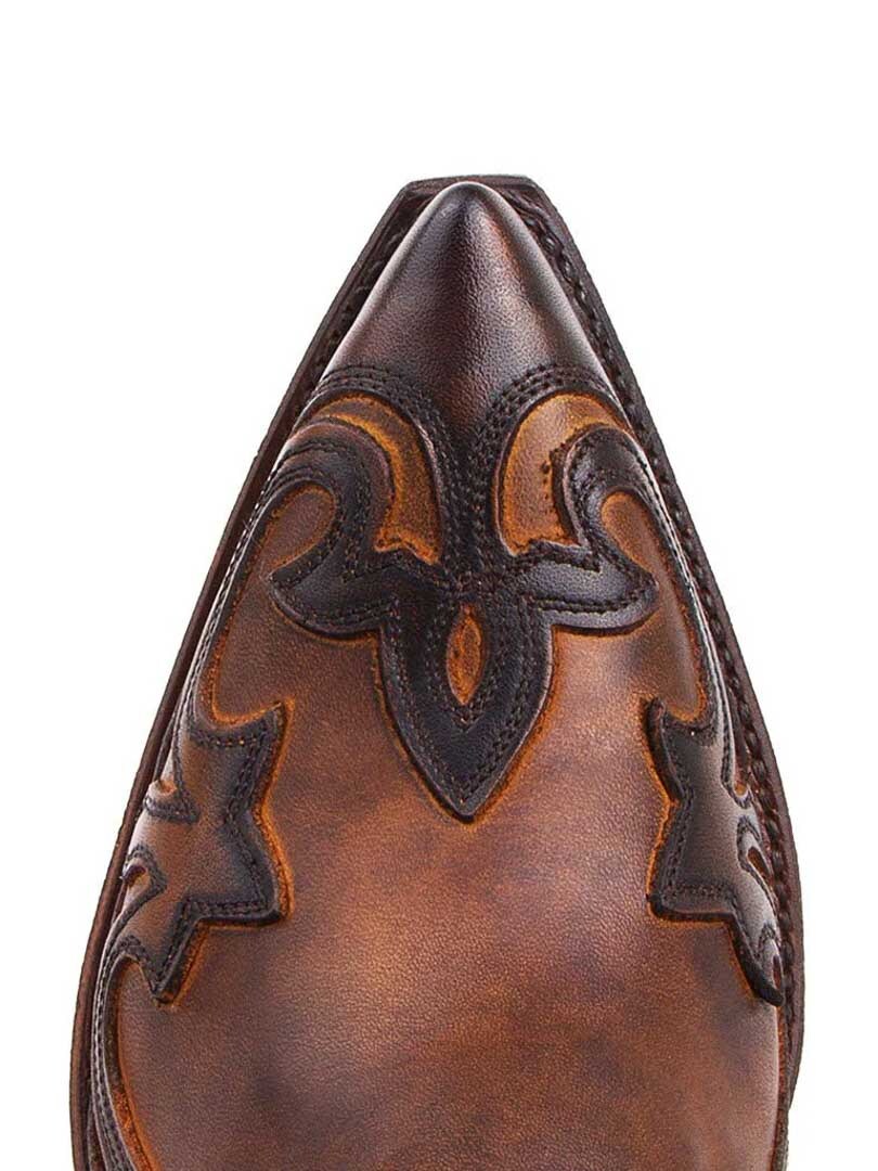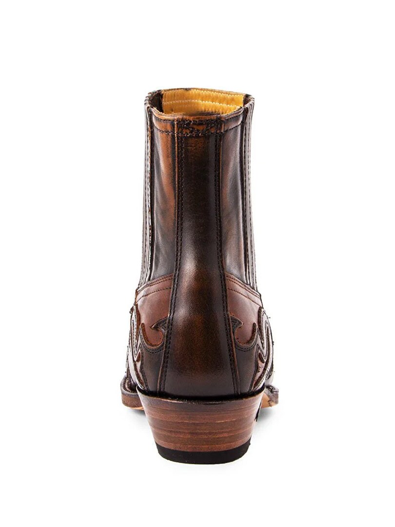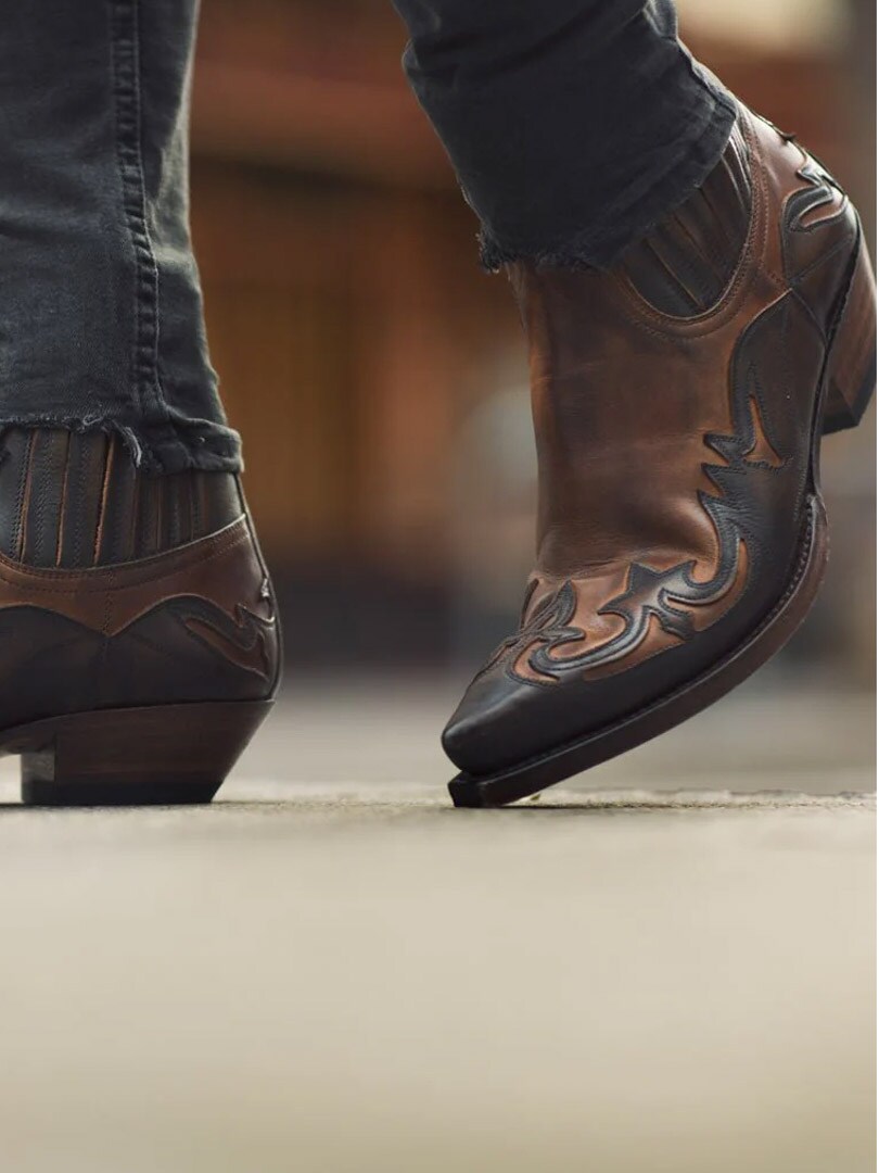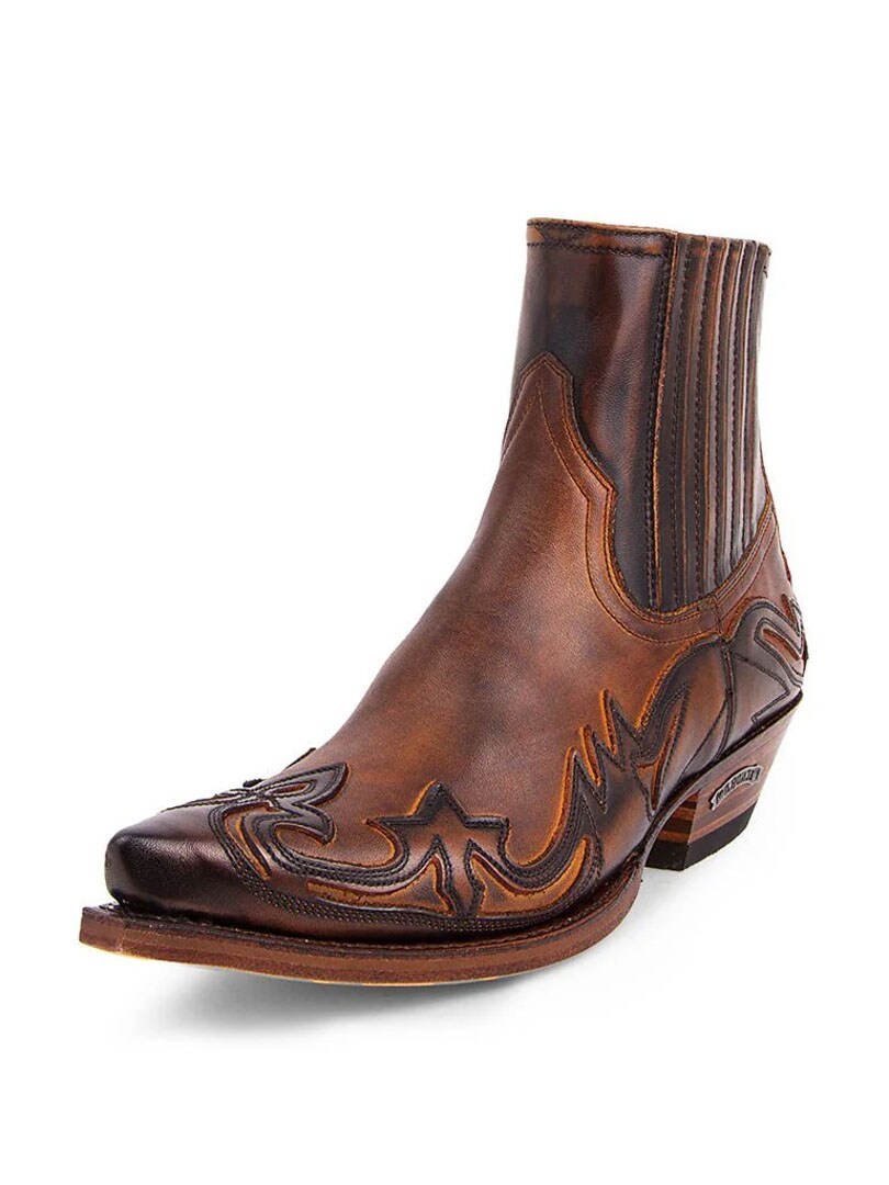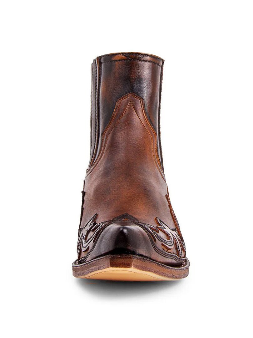 Lyhyet western-saappaat aidosta ruskeasta nahkasta, johon on kirjailtu liekkikuvio. Joustavat sivupaneelit helpottavat pukemista ja riisumista, kun taas teräväkärkinen kärki ja kulmikas korko takaavat perinteisen western-ilmeen. Täydellinen valinta niille, jotka etsivät monipuolisia saappaita tyylistä tinkimättä.