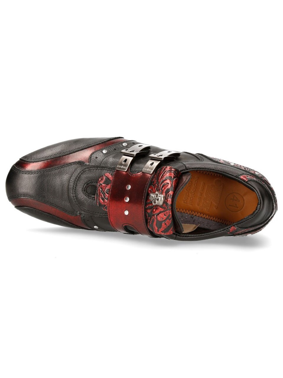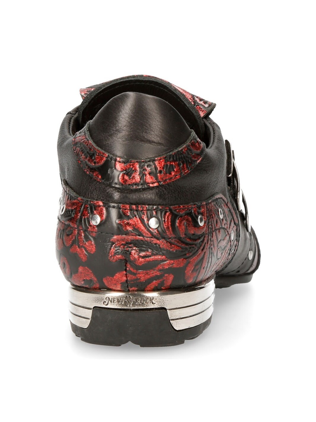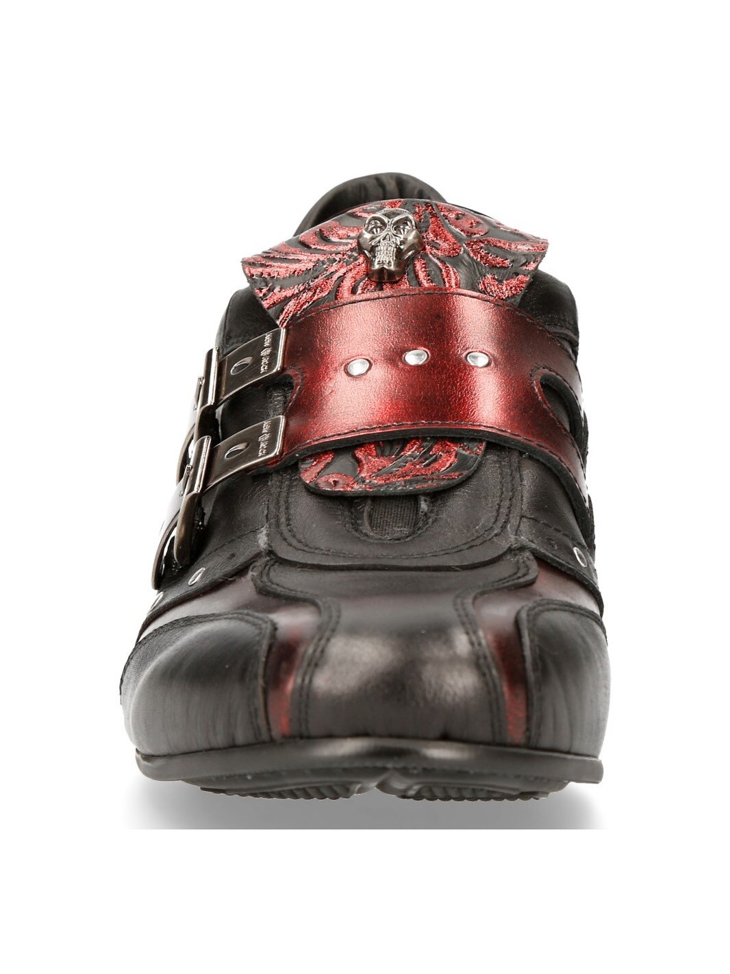 Mustat matalavartiset kengät aidosta kuvioidusta nahasta. Yksityiskohtina punaisia osioista, niittejä ja nahkaremmi kahdella metallisoljella. Pääkallomerkki kengän etupuolella. Näitä uniikkeja kenkiä on saatavilla vain rajoitettu erä!