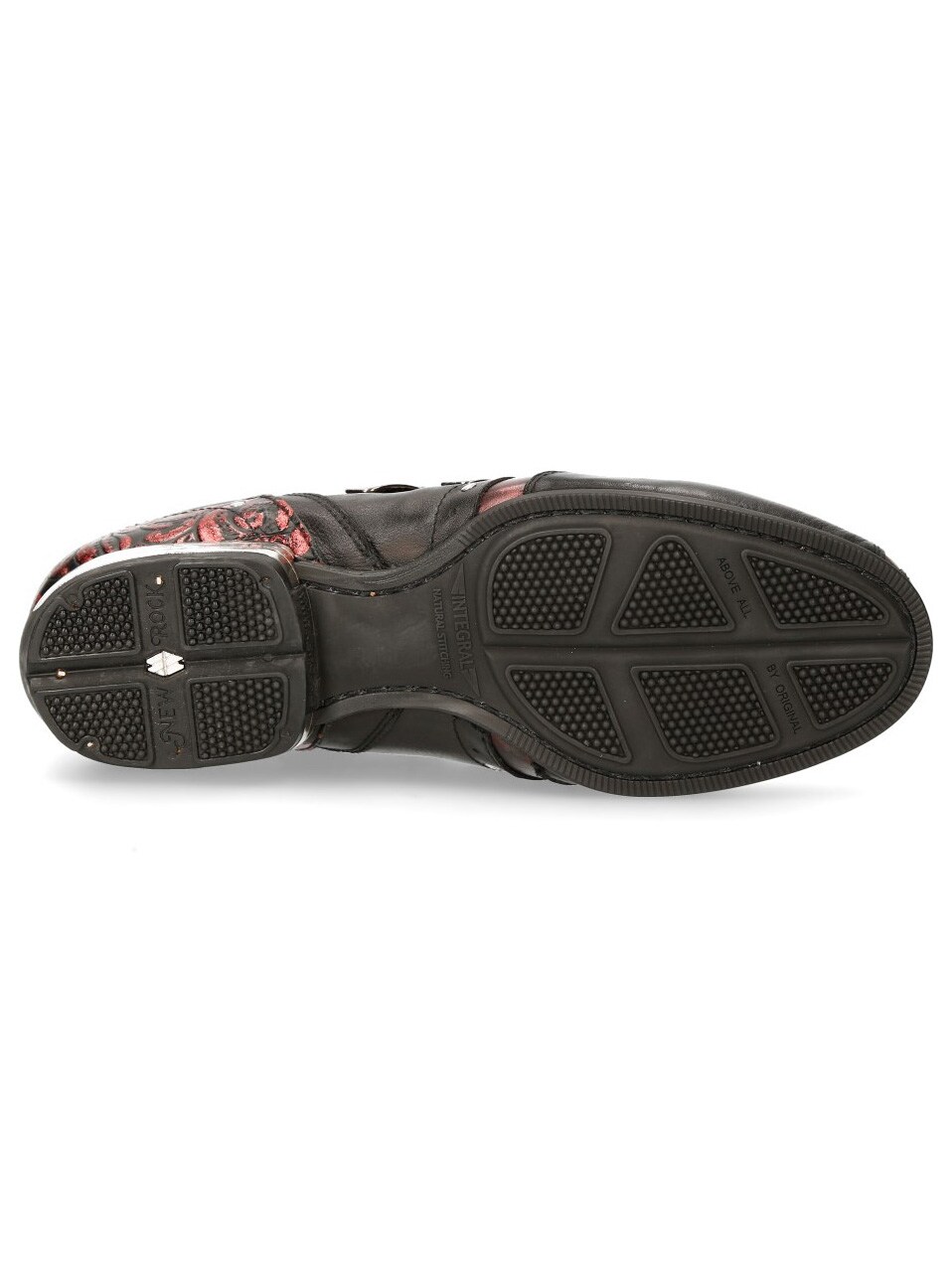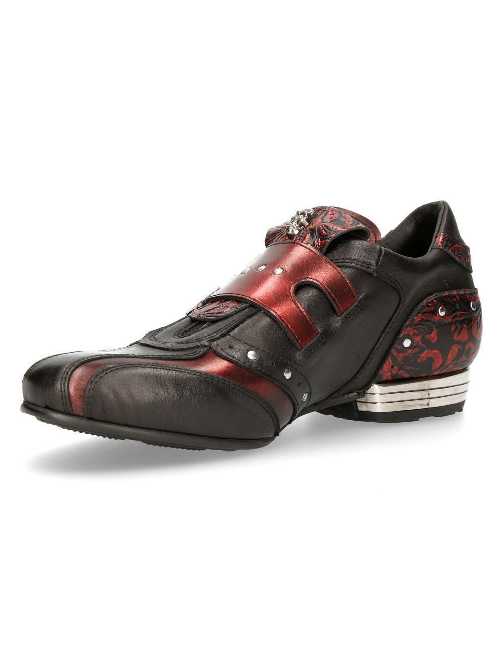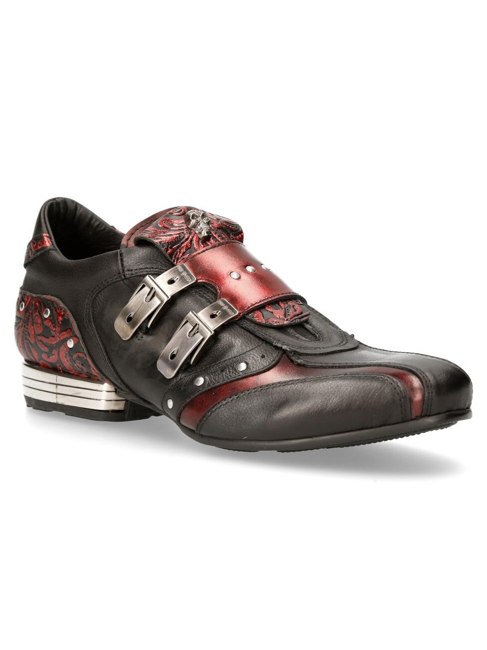 Mustat matalavartiset kengät aidosta kuvioidusta nahasta. Yksityiskohtina punaisia osioista, niittejä ja nahkaremmi kahdella metallisoljella. Pääkallomerkki kengän etupuolella. Näitä uniikkeja kenkiä on saatavilla vain rajoitettu erä!