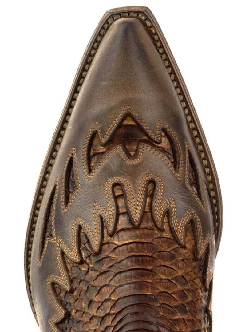 Mayura 12 cowboy-saappaat kuluneesta ruskeasta nahasta ja aidosta pytonnahasta ovat eksklusiivinen bootsi aidolla länsimaisella tunnelmalla.