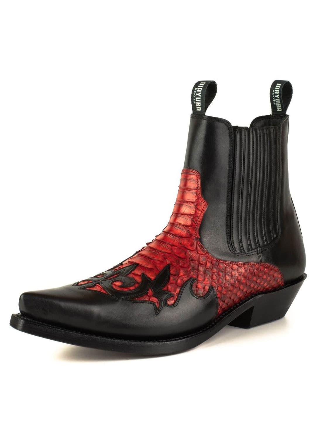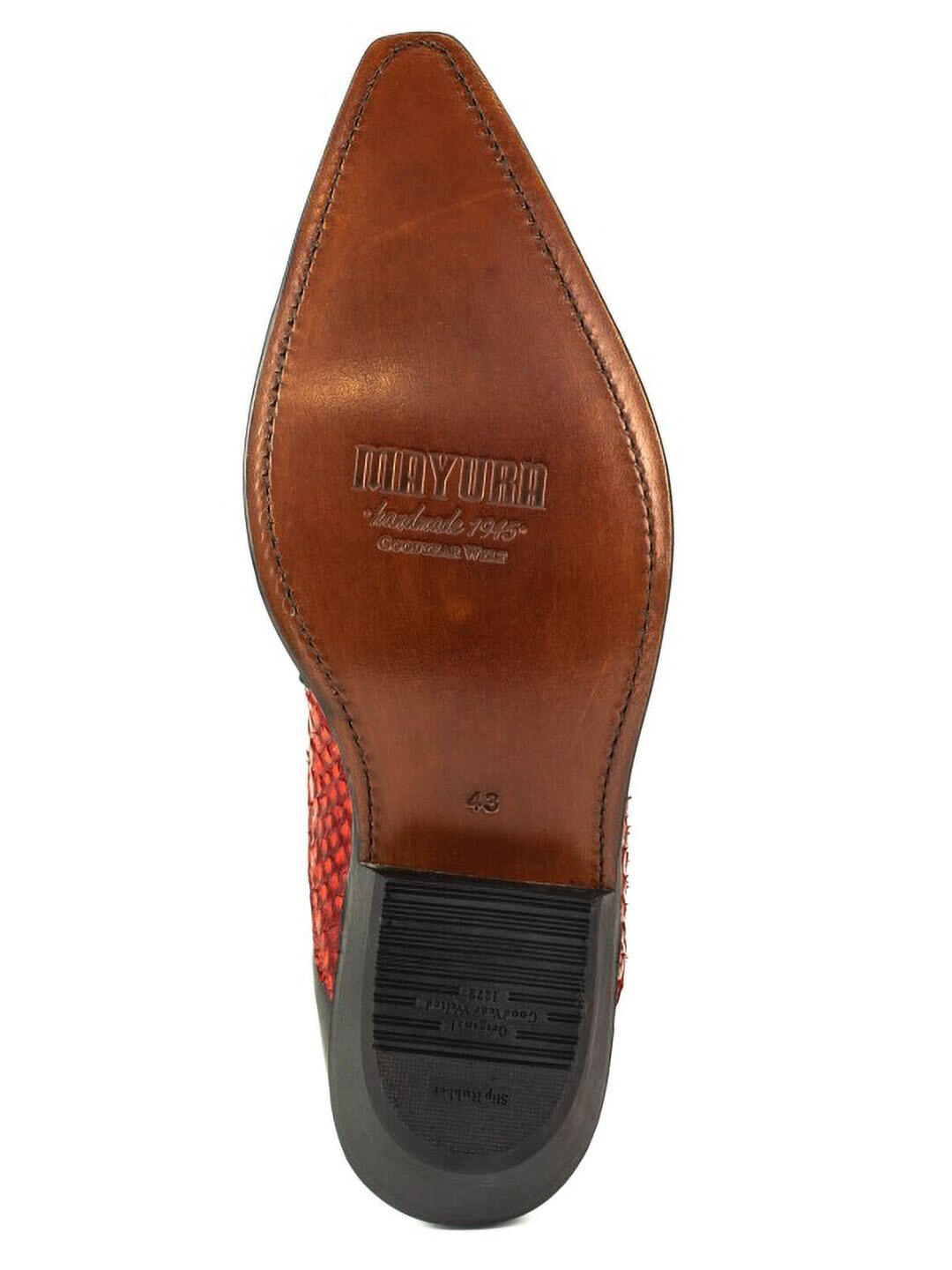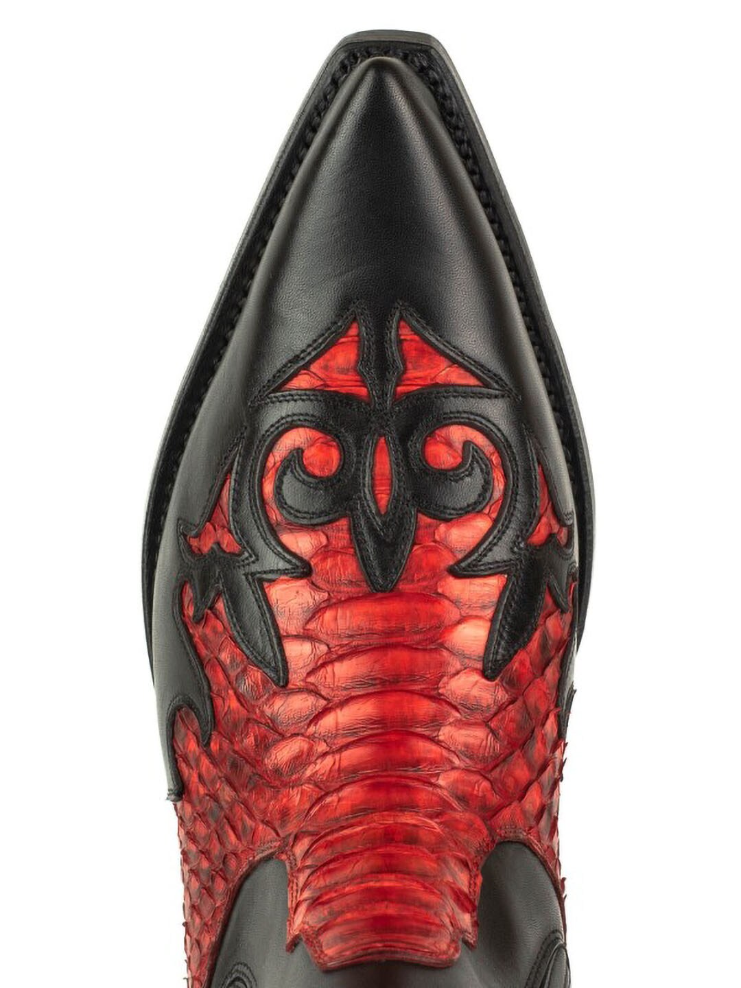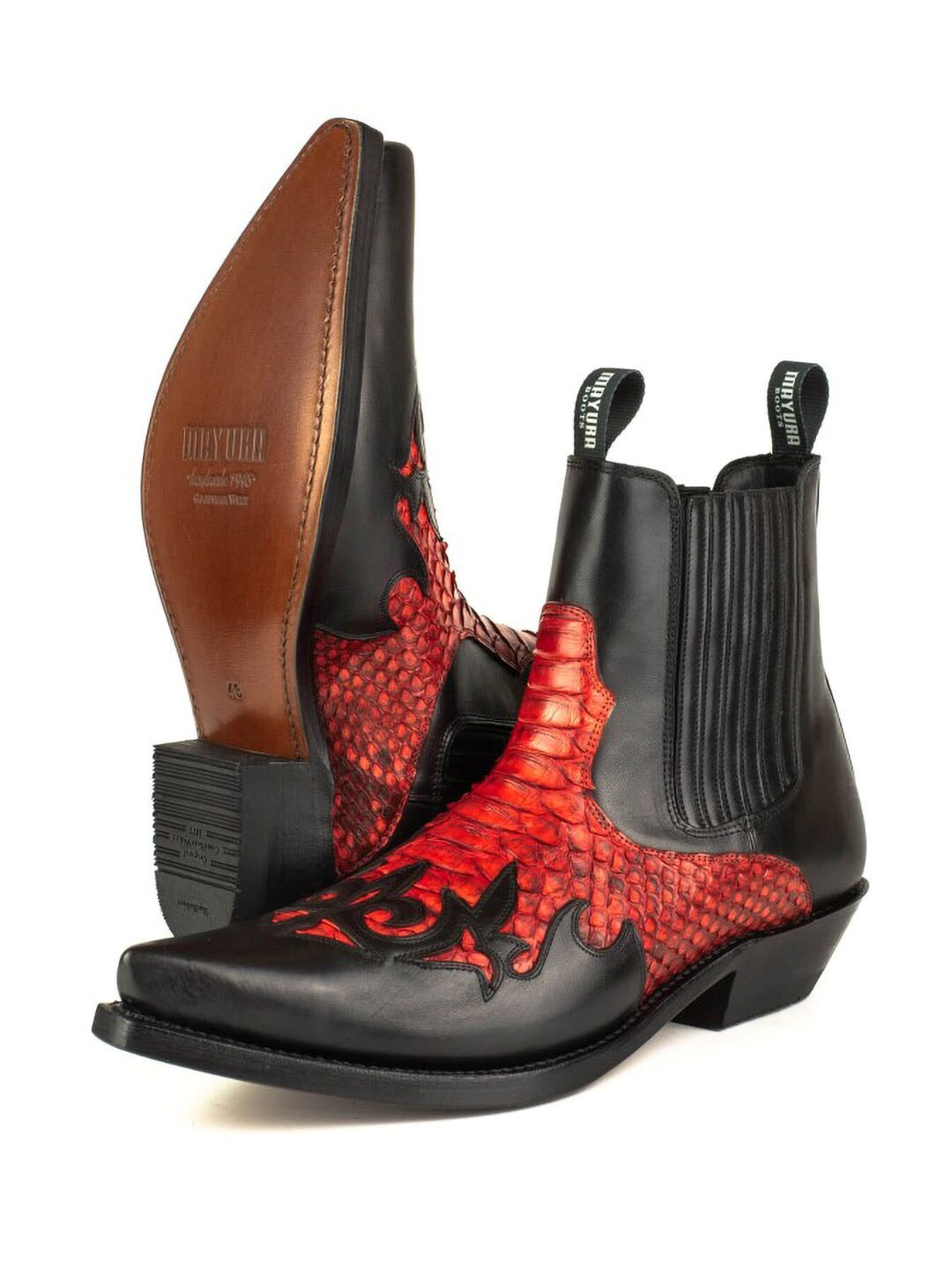 Näyttävät bootsit naudannahasta ja pytonnahasta, joissa vintage-henkinen ilme ja käsintehty viimeistely antavat jokaiselle parille uniikin ilmeen. Mallissa on kaksinkertaiset nahkapohjat, ja se on valmistettu käsin Goodyear Welt -menetelmällä, mikä takaa korkean kulutuskestävyyden, pitkän käyttöiän ja erittäin hyvän mukavuuden. Eksklusiivinen bootsipari sinulle, joka haluat mallin, joka todella erottuu edukseen.