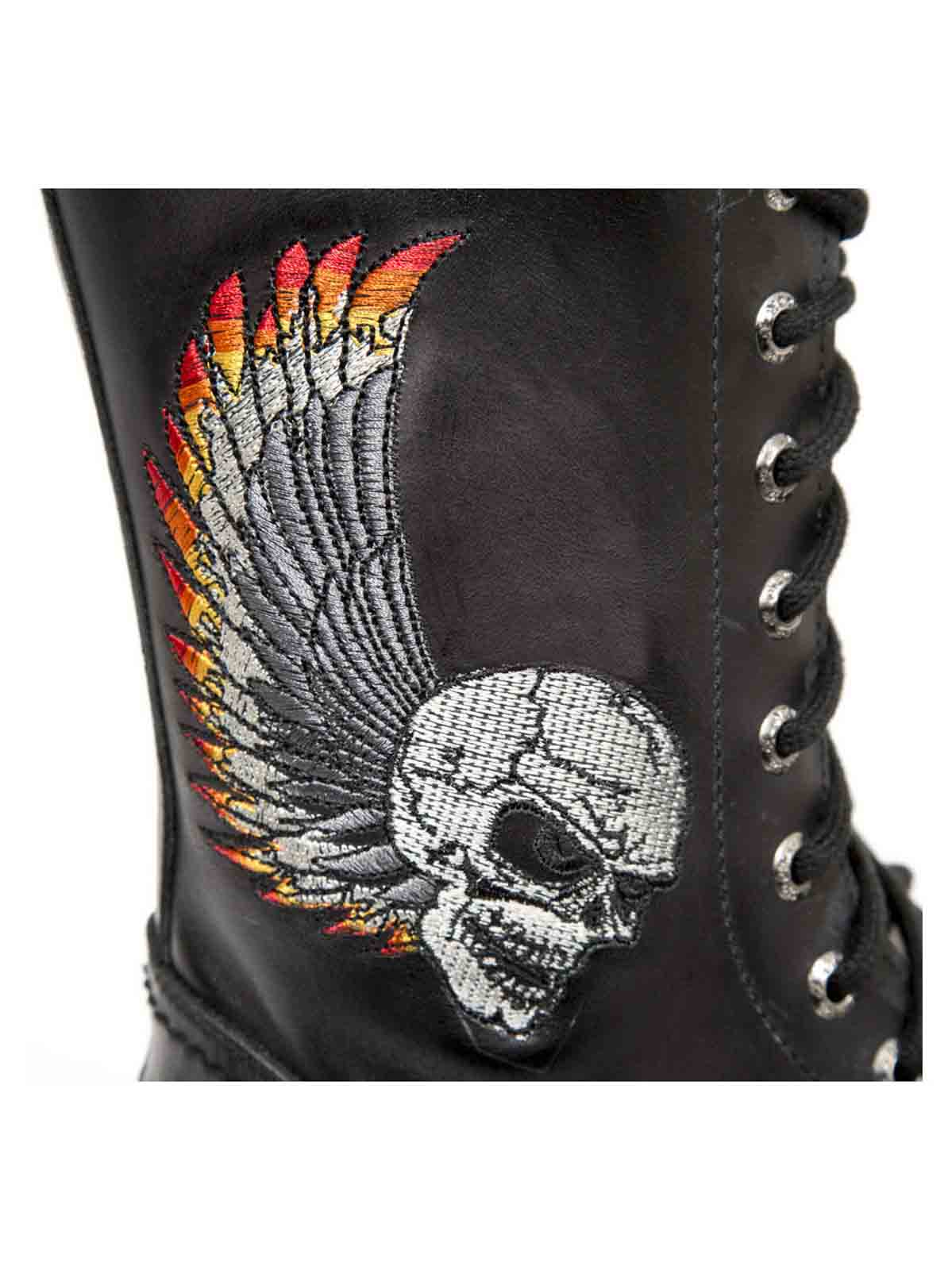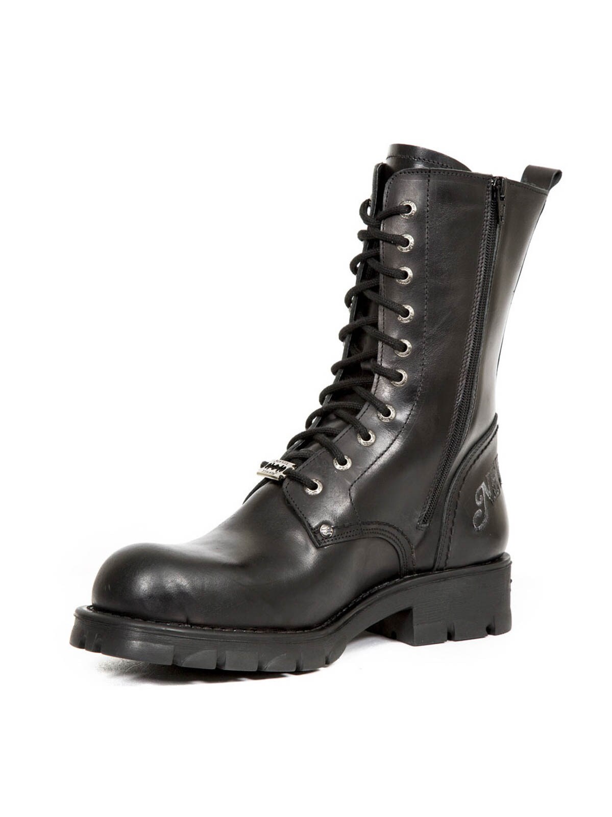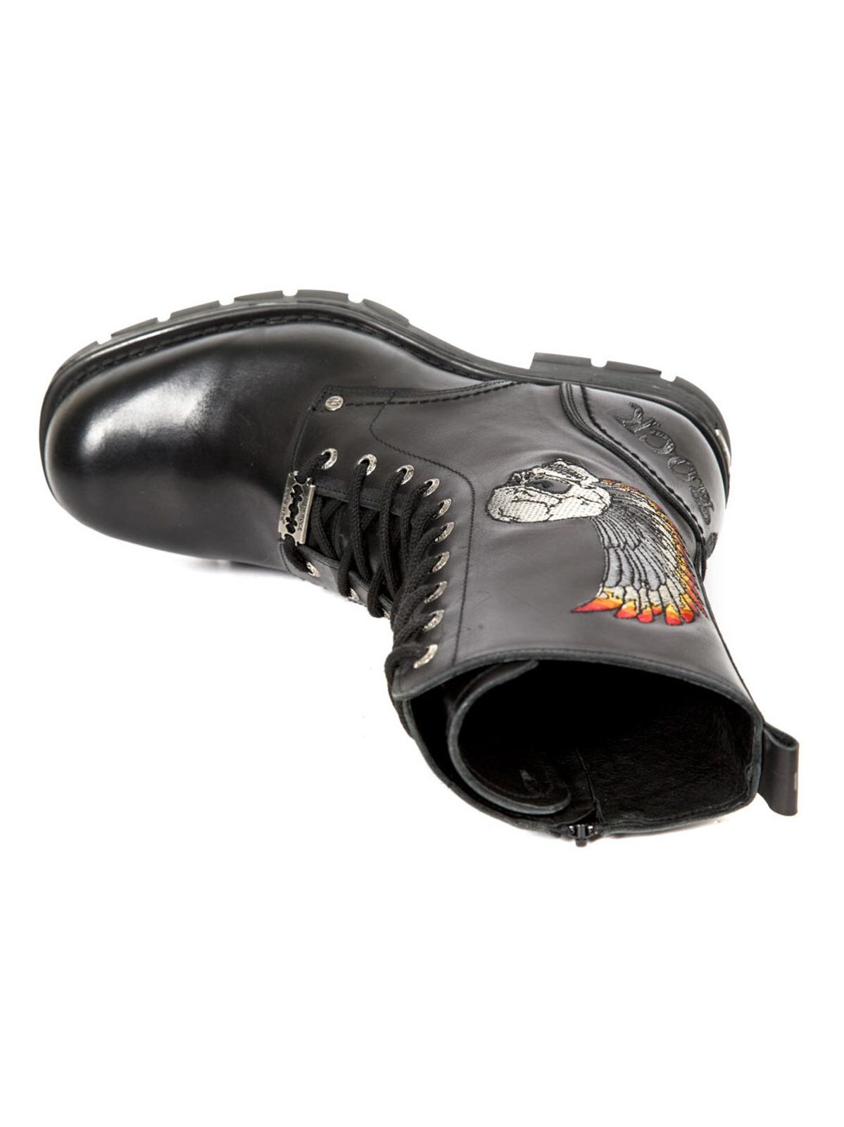 Mustat kengät kuviobrodeerauksella. Kengissä on korkea varsi, jossa on nauhat ja sisäpuolella vetoketju, jonka ansiosta ne on helppo pukea jalkaan ja myös riisua. Käsintehty aidosta nahasta ja saatavilla rajoitettu erä, joka tekee jokaisesta kengästä ainutlaatuisen.